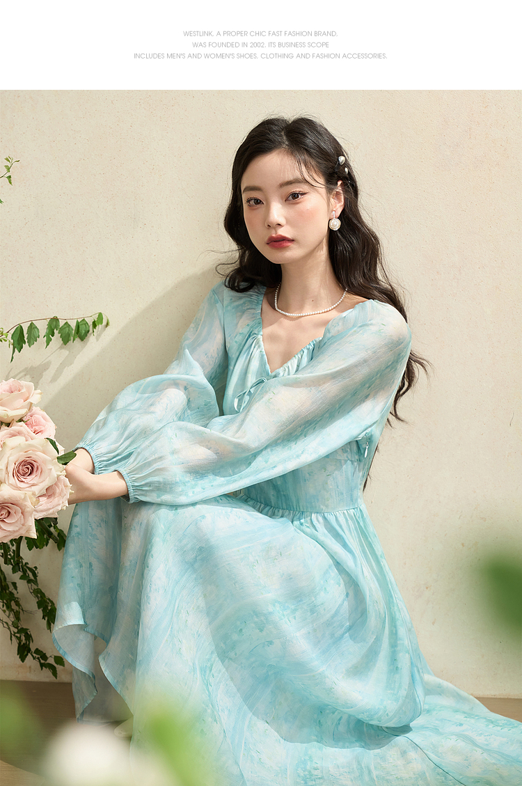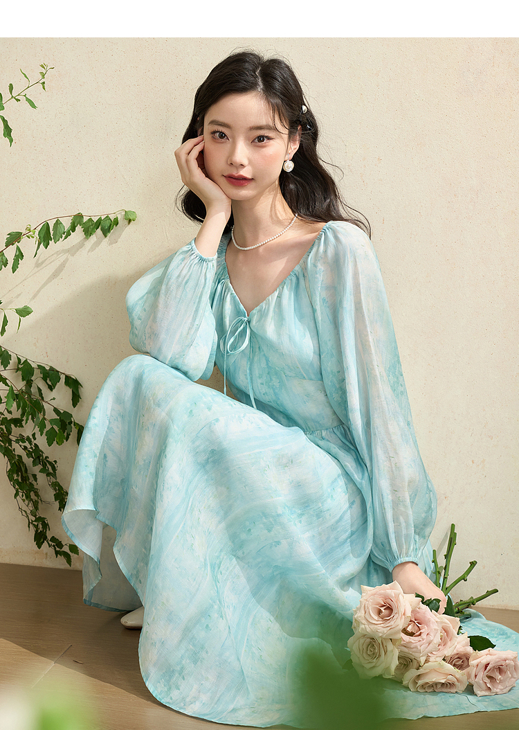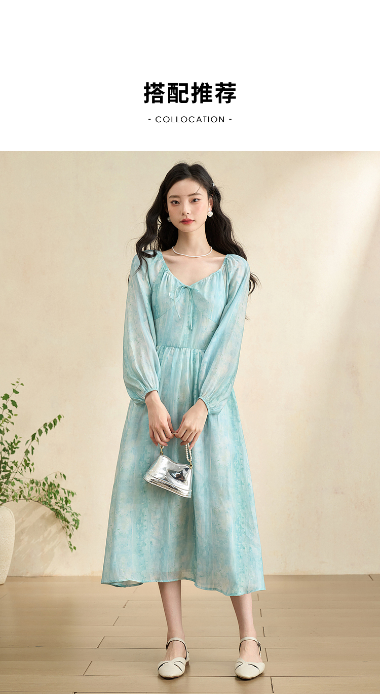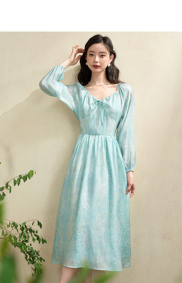 薄荷曼波晕染泡泡袖碎花裙女V领收腰长袖连衣裙V2842235