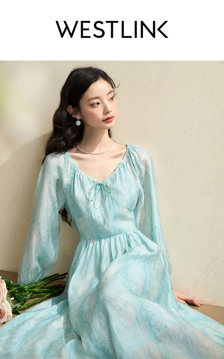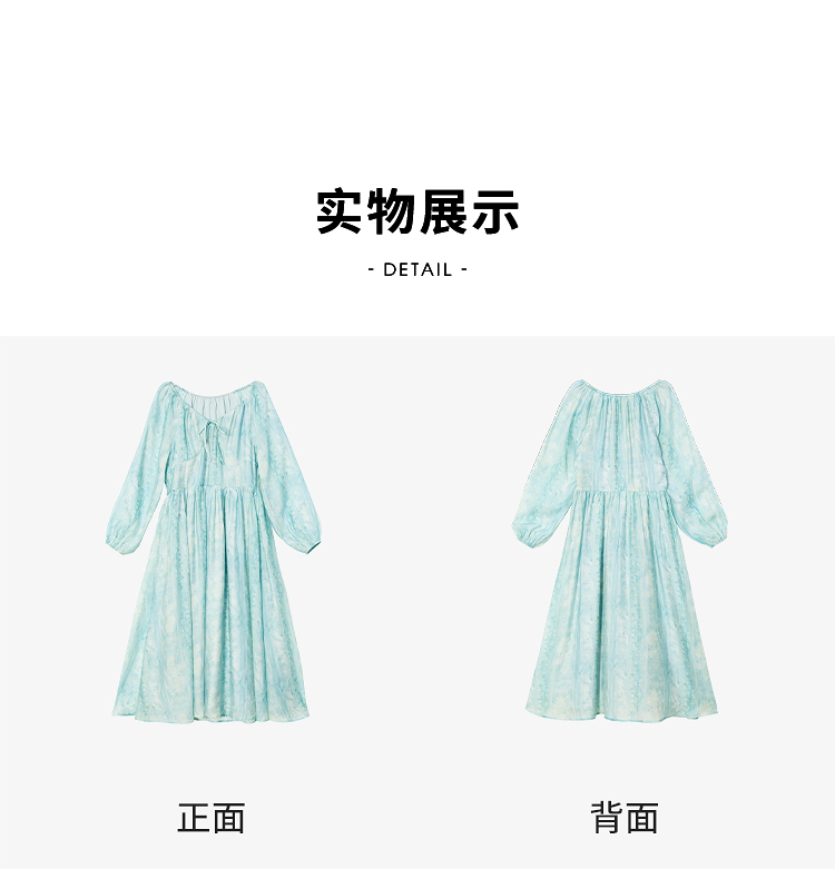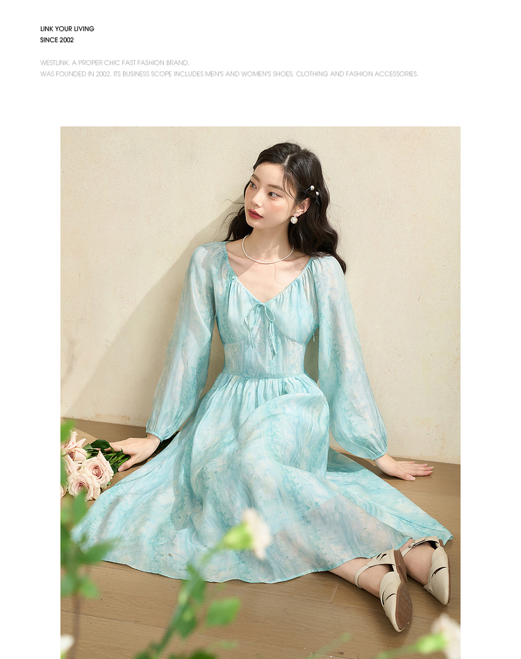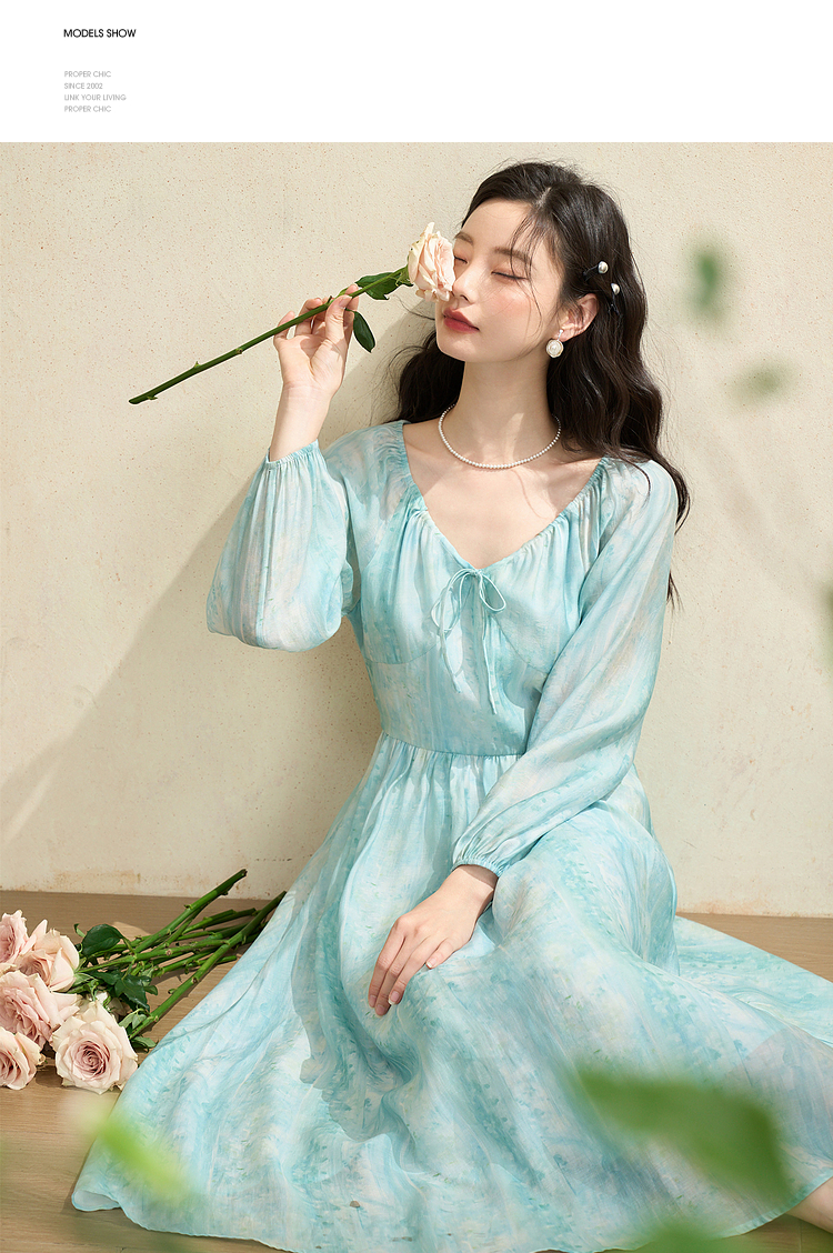 薄荷曼波晕染泡泡袖碎花裙女V领收腰长袖连衣裙V2842235