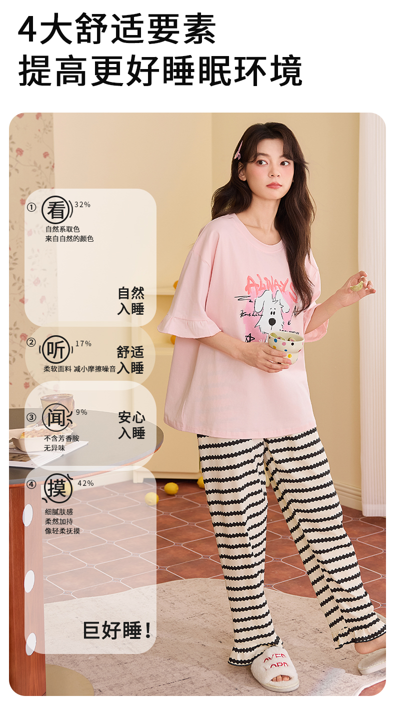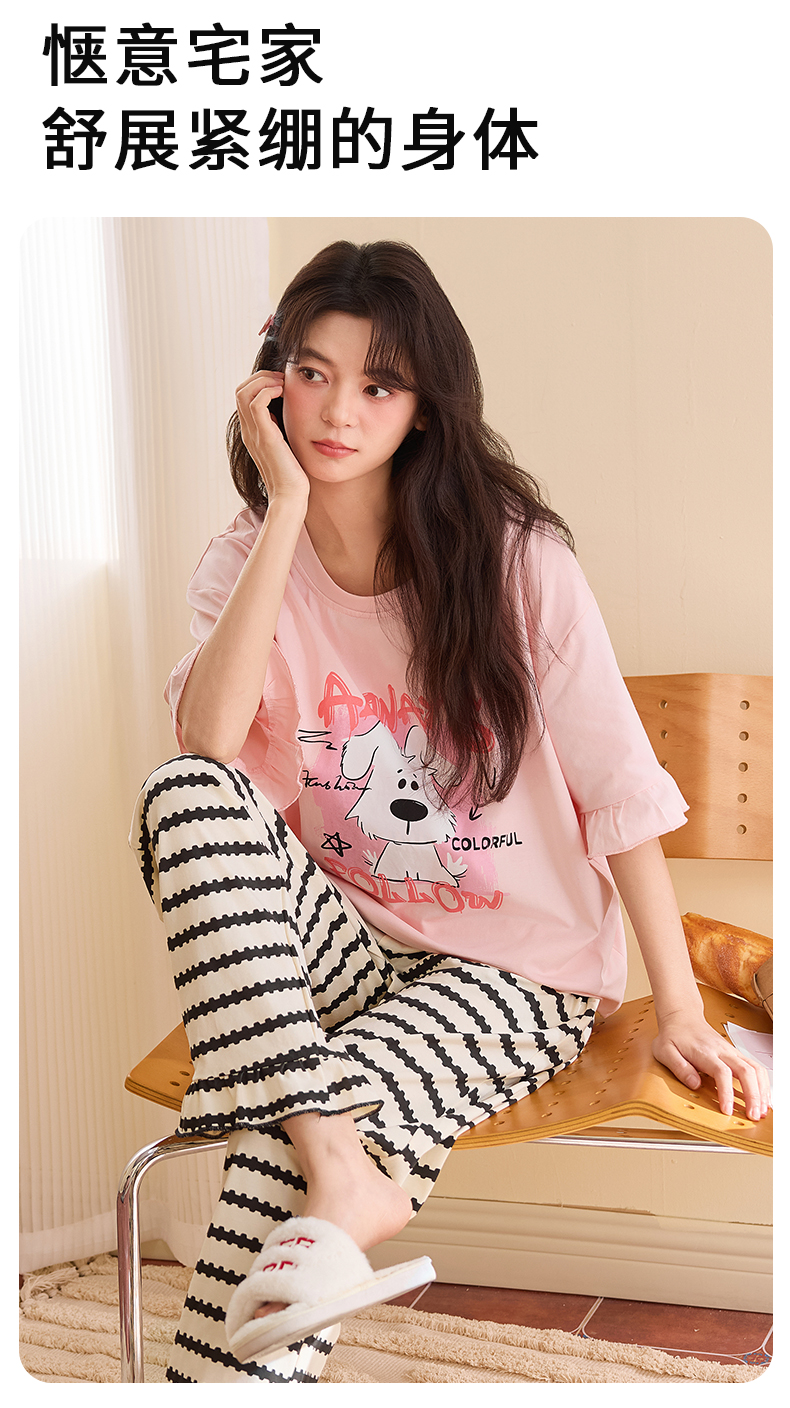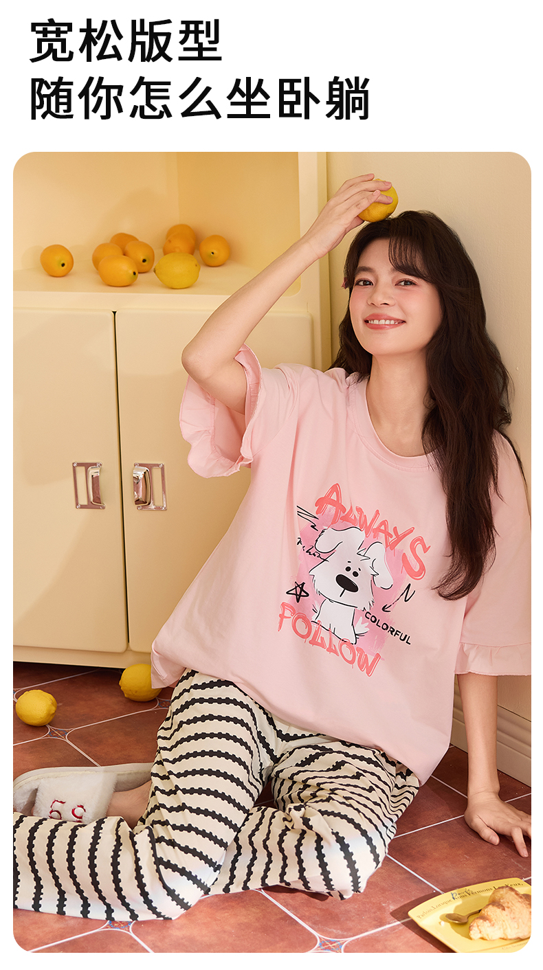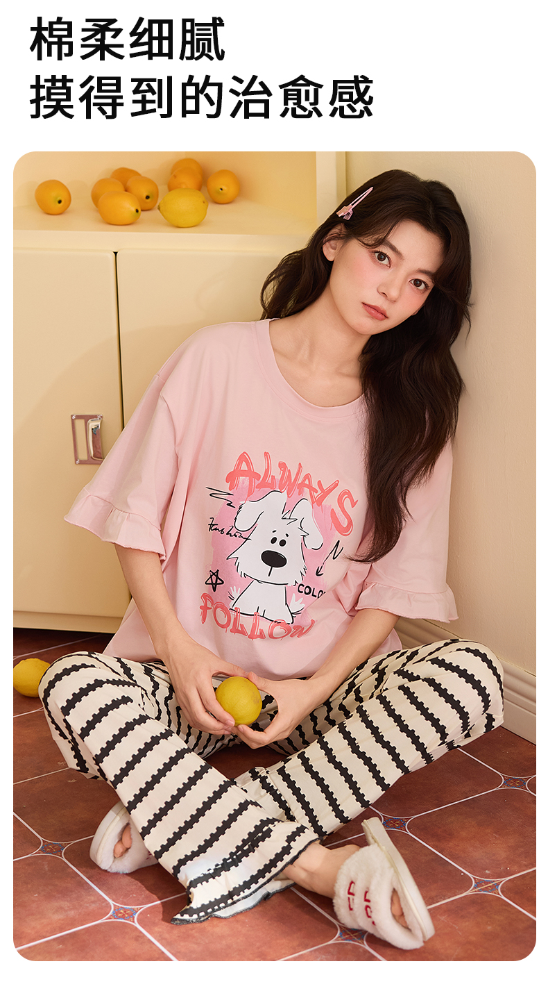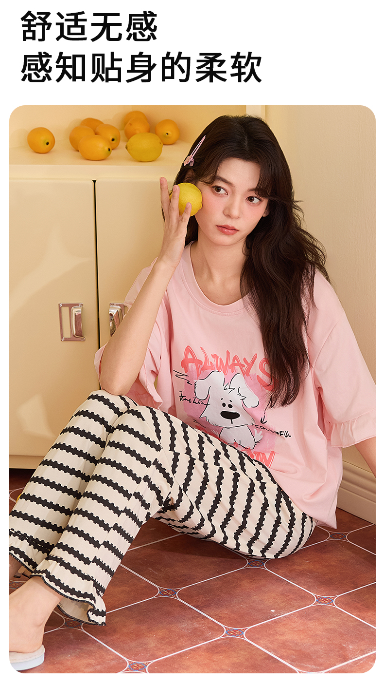 【初夏焕新】自然醒桃气家居服睡衣女款夏季100%纯棉短袖长裤少女夏家居服全棉套装QH