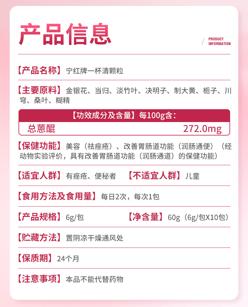 华喜达宁红牌一杯清颗粒金银花当归改善胃肠道功能润肠通便祛痤疮