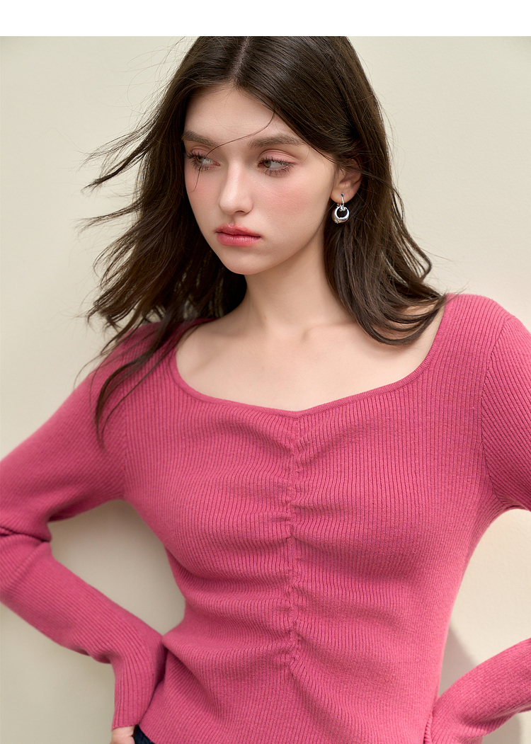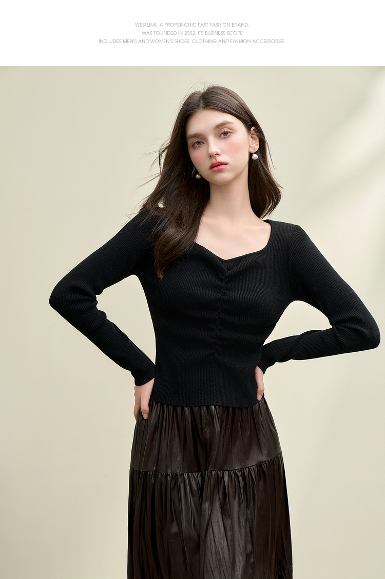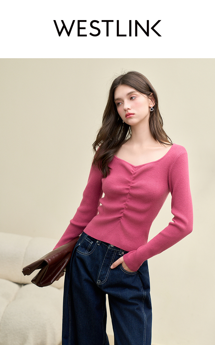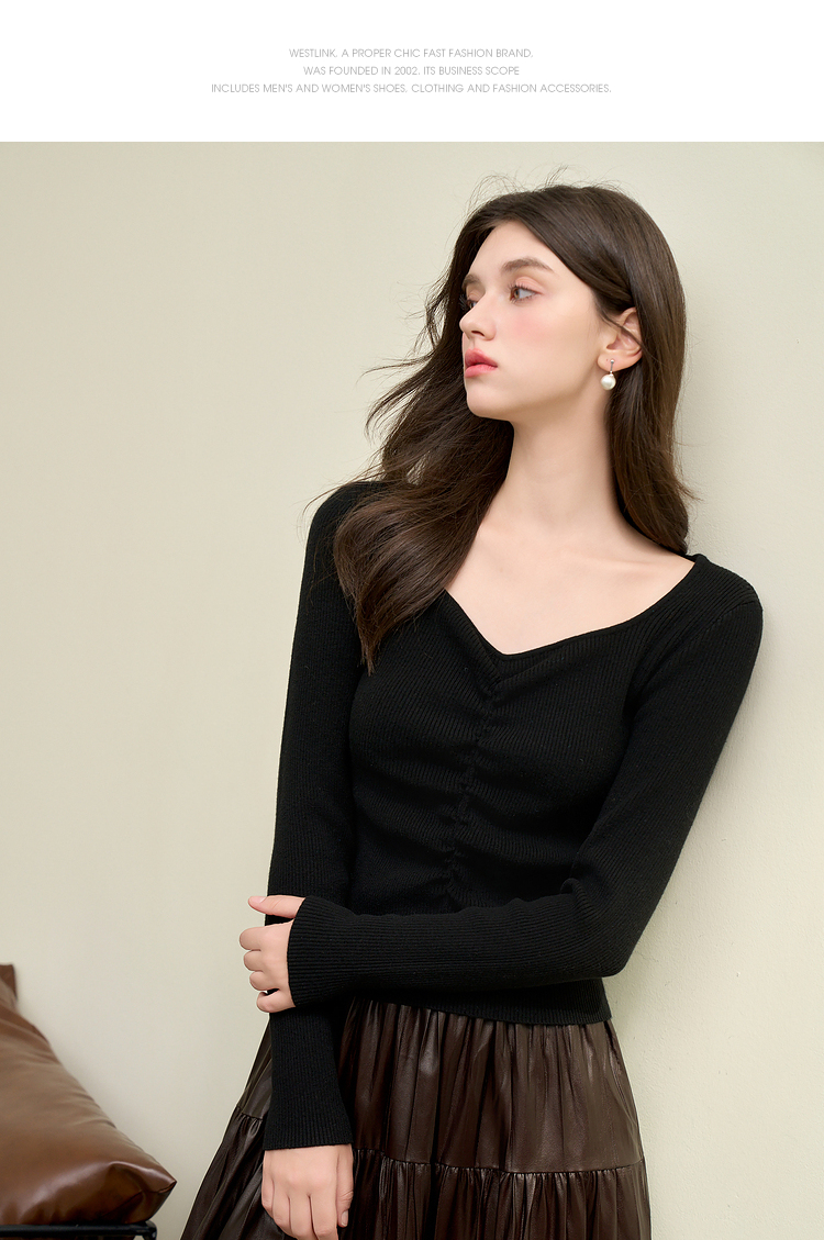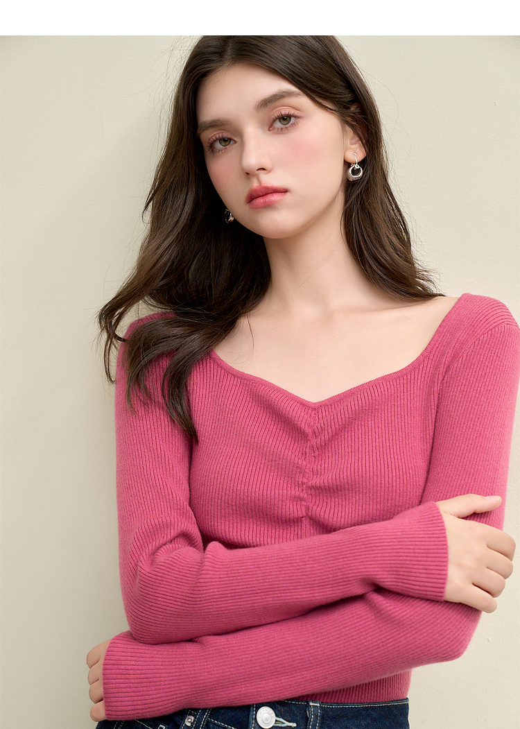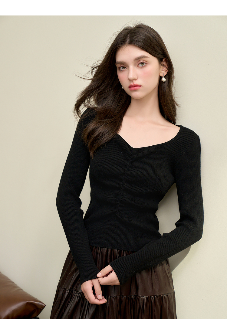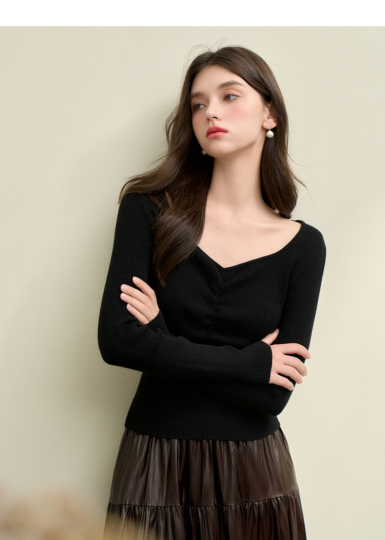 绵羊毛简约设计感针织衫女早春轻薄捏褶高弹桃心领打底衫V4142675