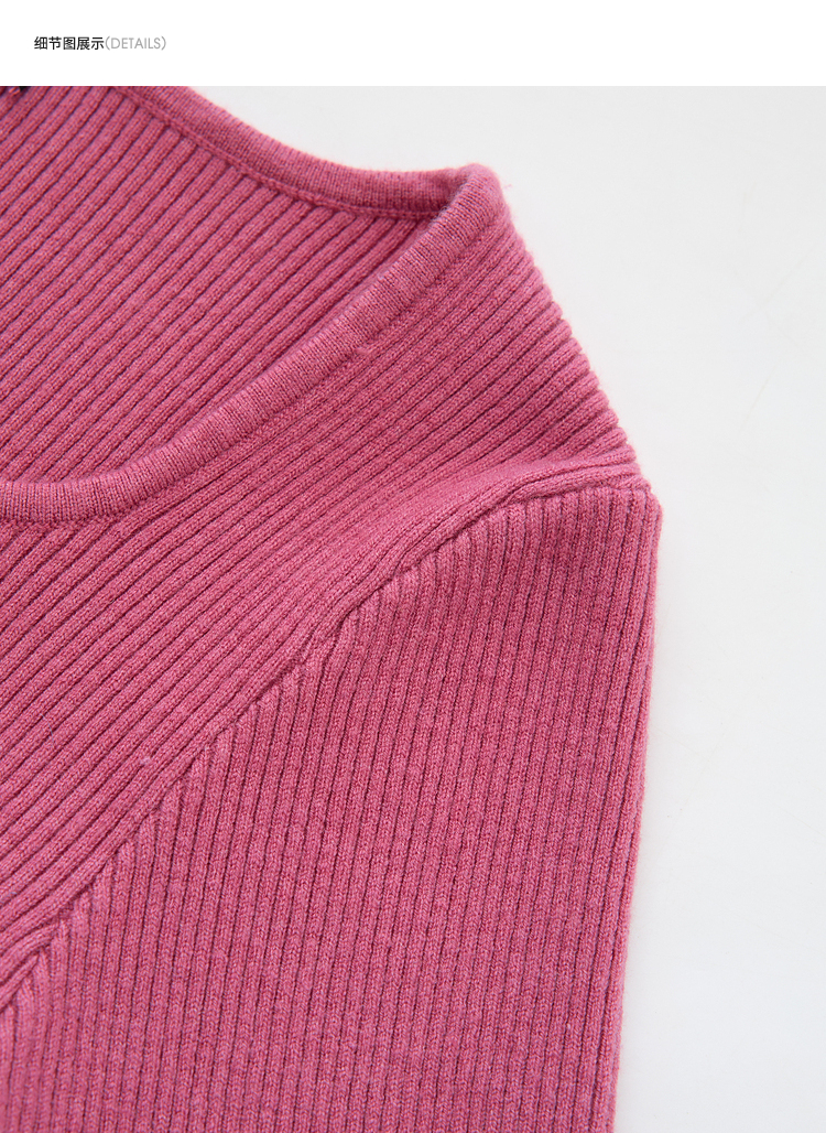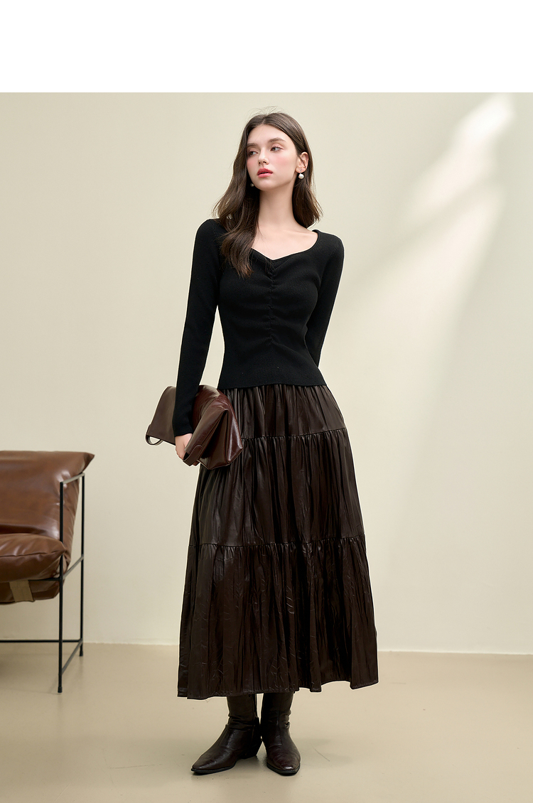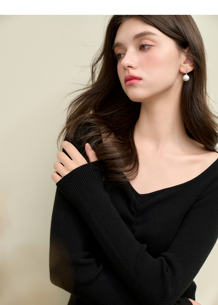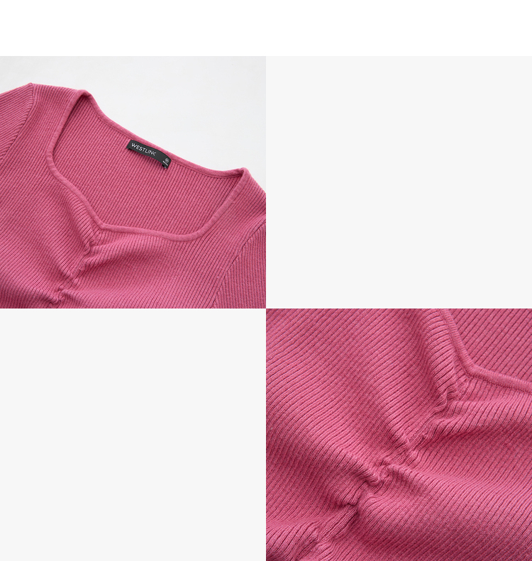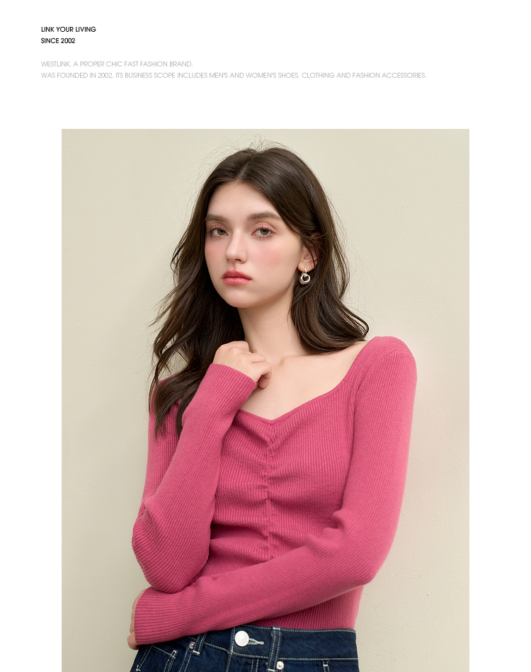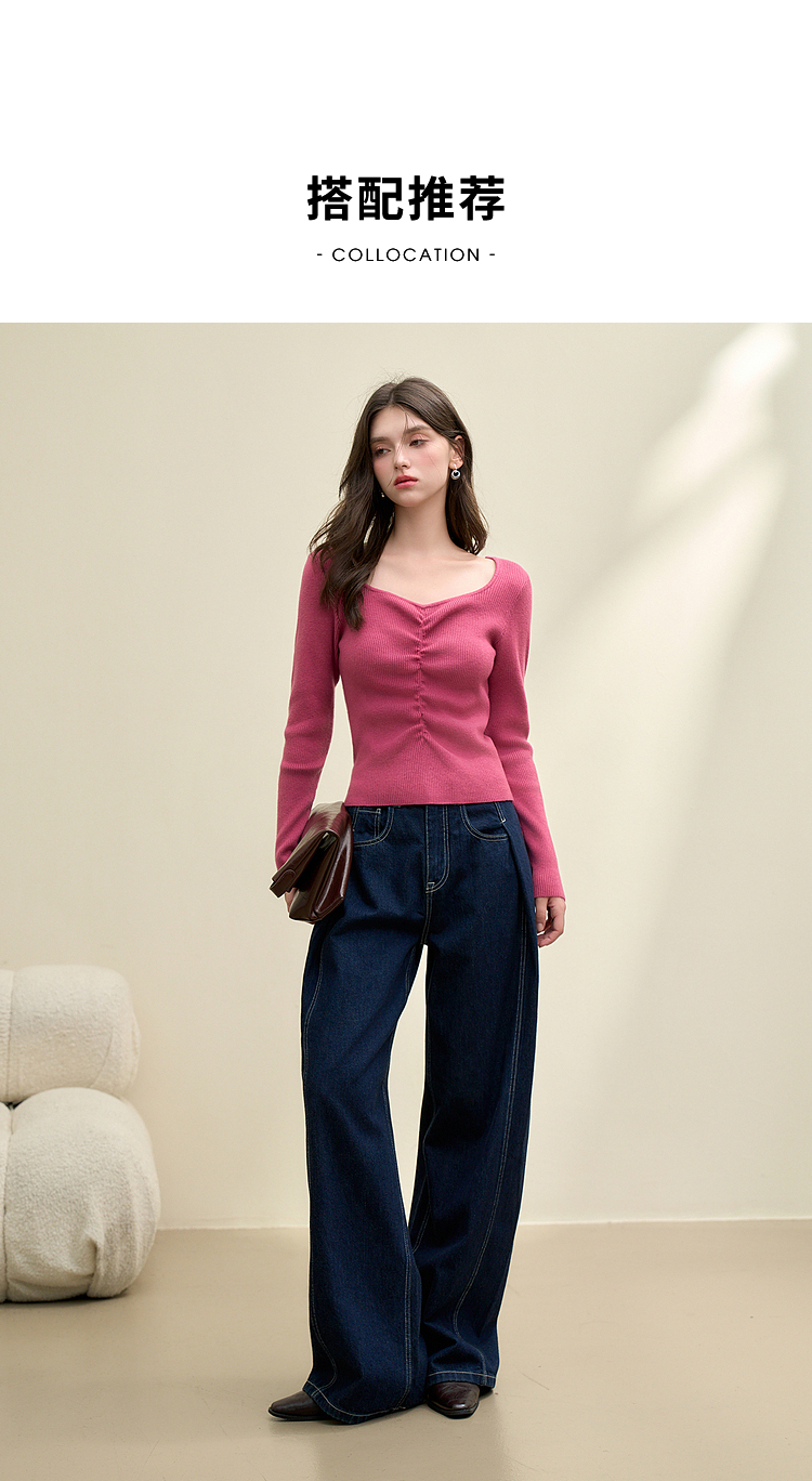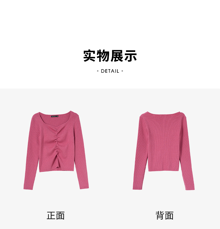 绵羊毛简约设计感针织衫女早春轻薄捏褶高弹桃心领打底衫V4142675