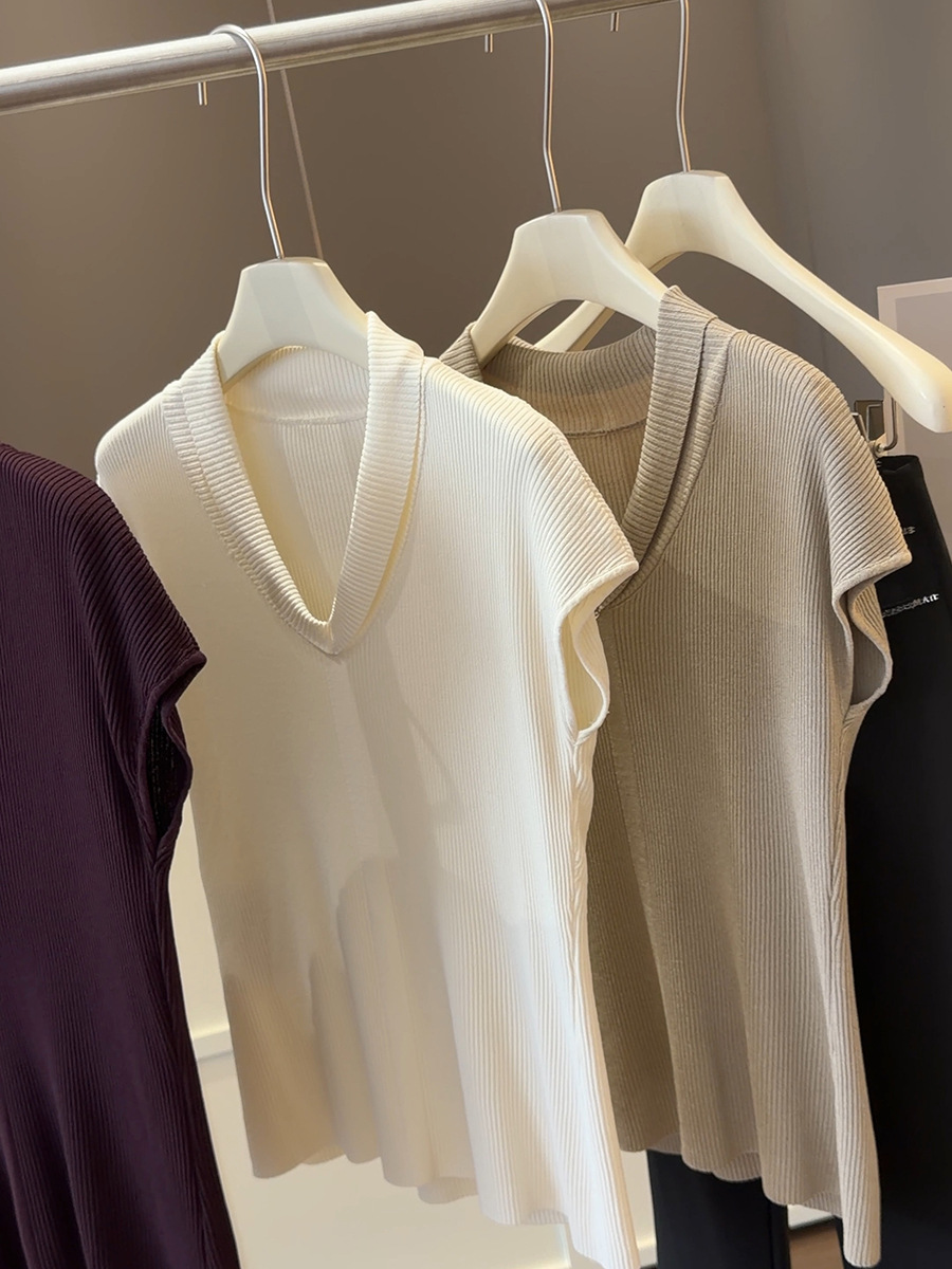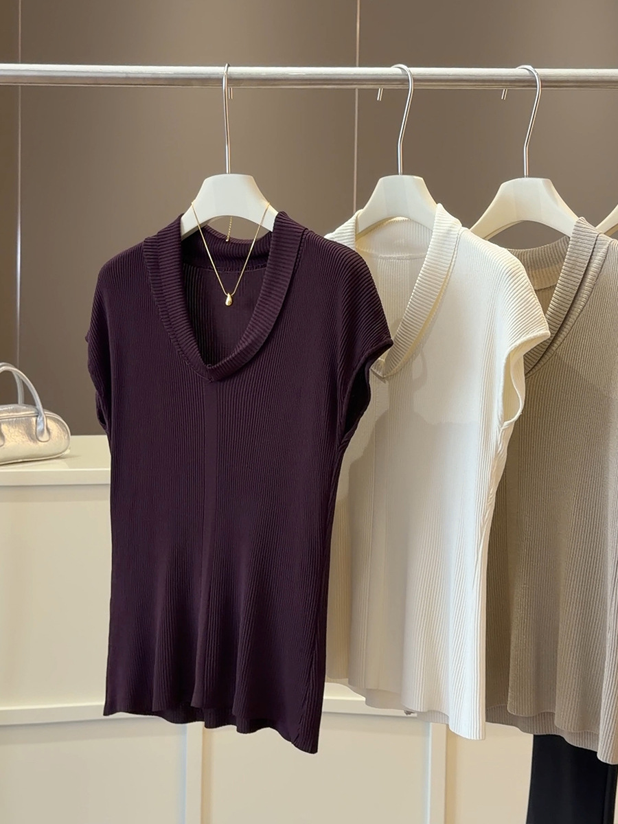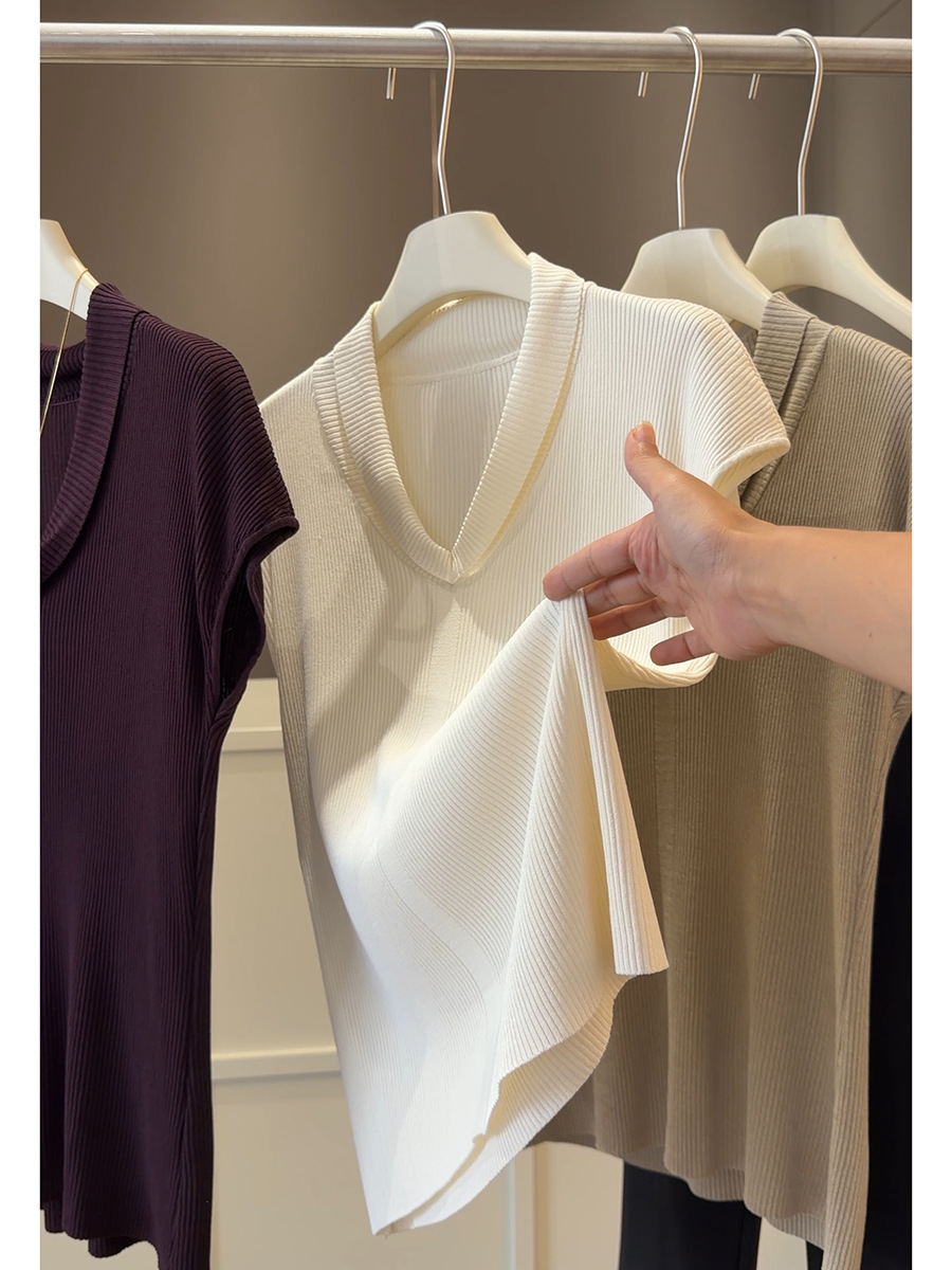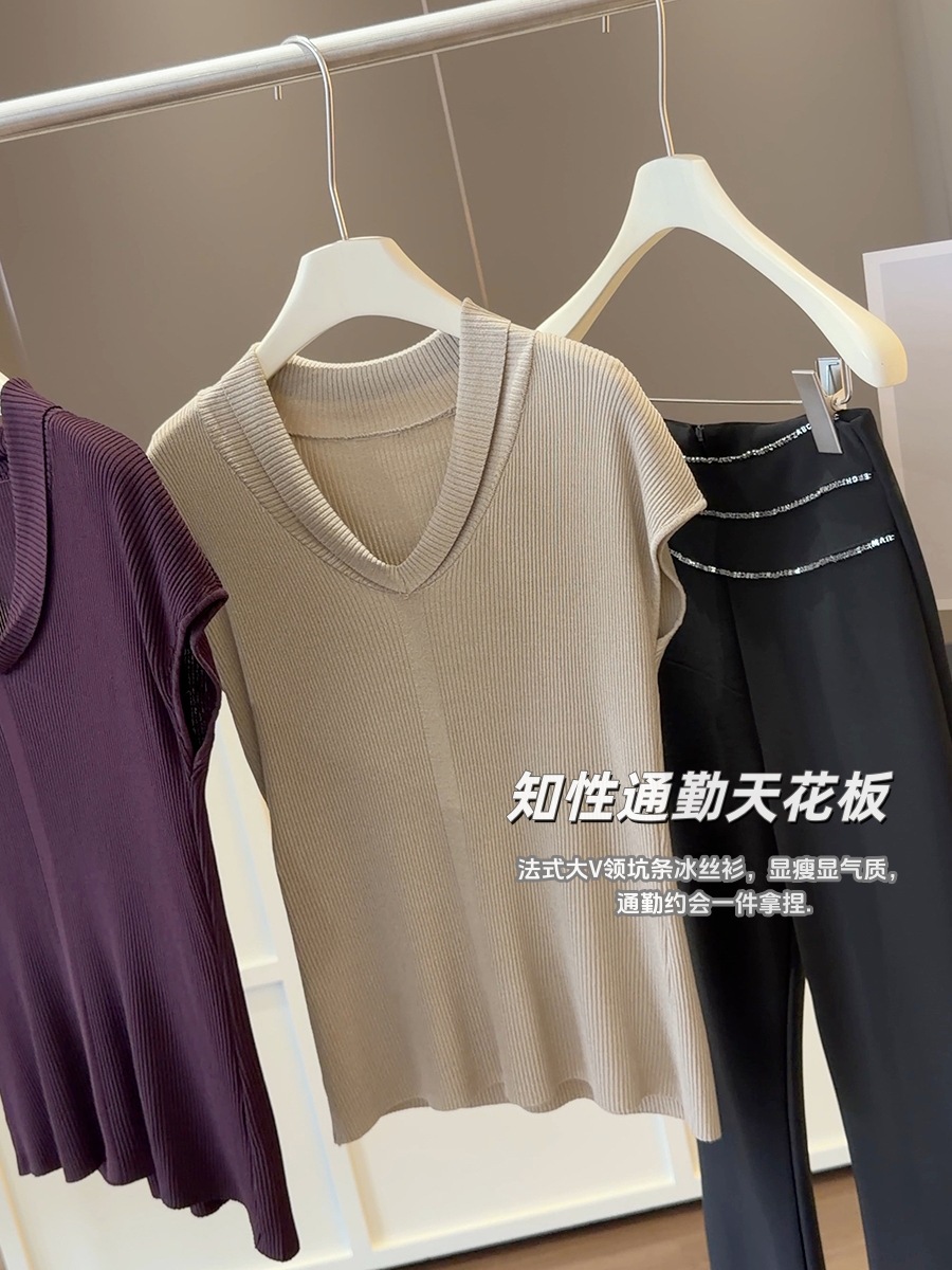 法式气质V领短袖 针织衫 女夏季新款修身显瘦百搭纯欲冰丝坑条上衣