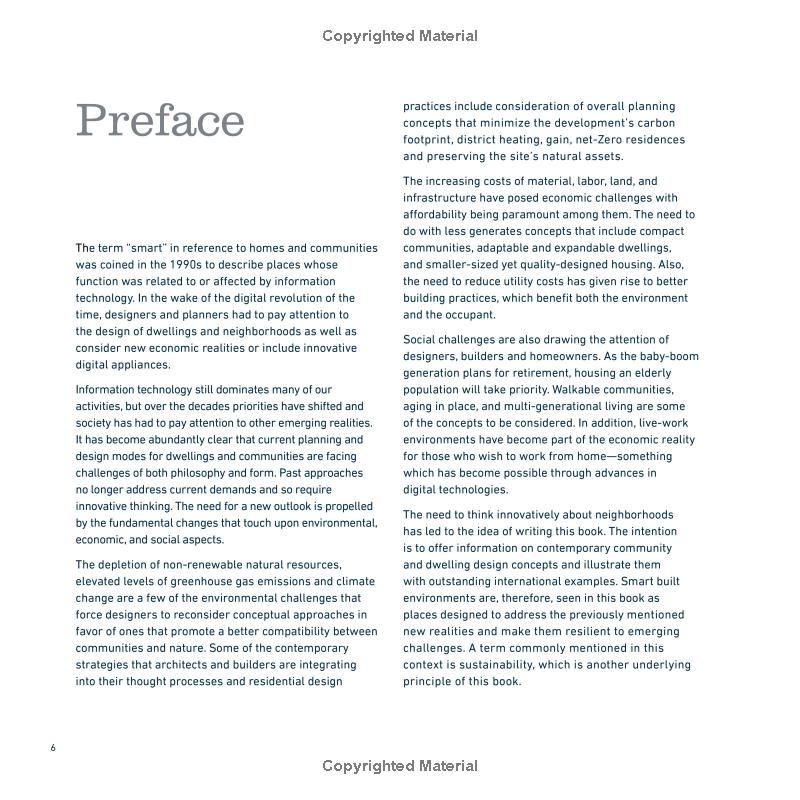 "智能"一词指的是家庭和社区,描述了其功能与信息技术相关或受信息技术影响的地方。随着21世纪正在进行的数字革命,设计师和规划师正在高度关注住宅和社区的设计,并通过整合创新的数字电器来考虑新的经济现实,这也有助于促进子孙后代的经济可持续性。该书全面探讨了几个关键主题,即建筑与自然环境及其生态属性之间的相关性;行动和交通问题;设施和住宅的混合;区域供热和其他能源效率;规划绿色开放空间,同时考虑居民的生活方式;可食用景观和新型城市农业实践及其实施;减少社区在高密度生活演变方面的足迹;社区内的遗产保护原则,其中社会,经济和环境问题都存在,新旧混合;当住宅设计并配备先进的"绿色"技术,适应性强的住宅,多代住宅,附加和附加单元以及即插即用等时,如何实现可持续性。