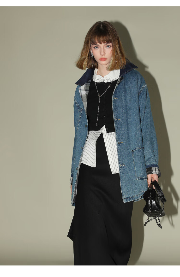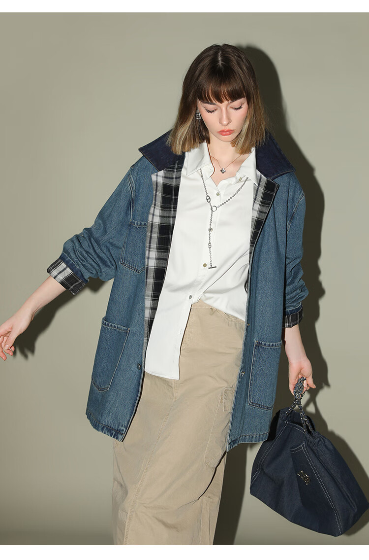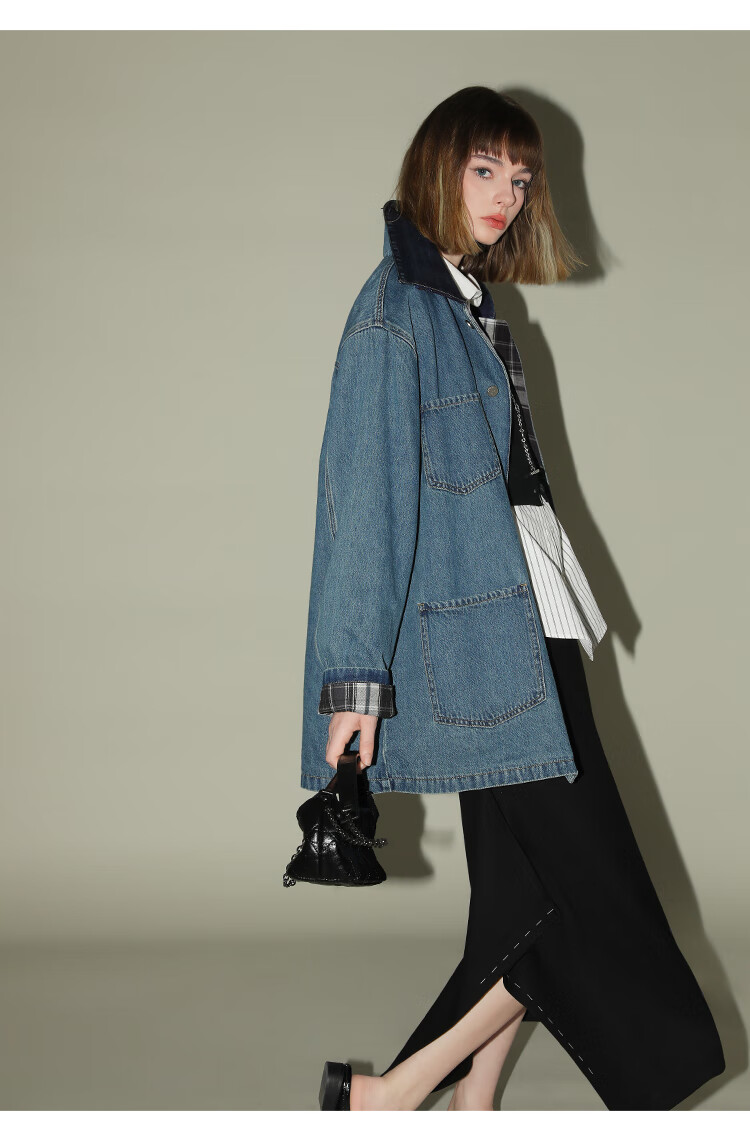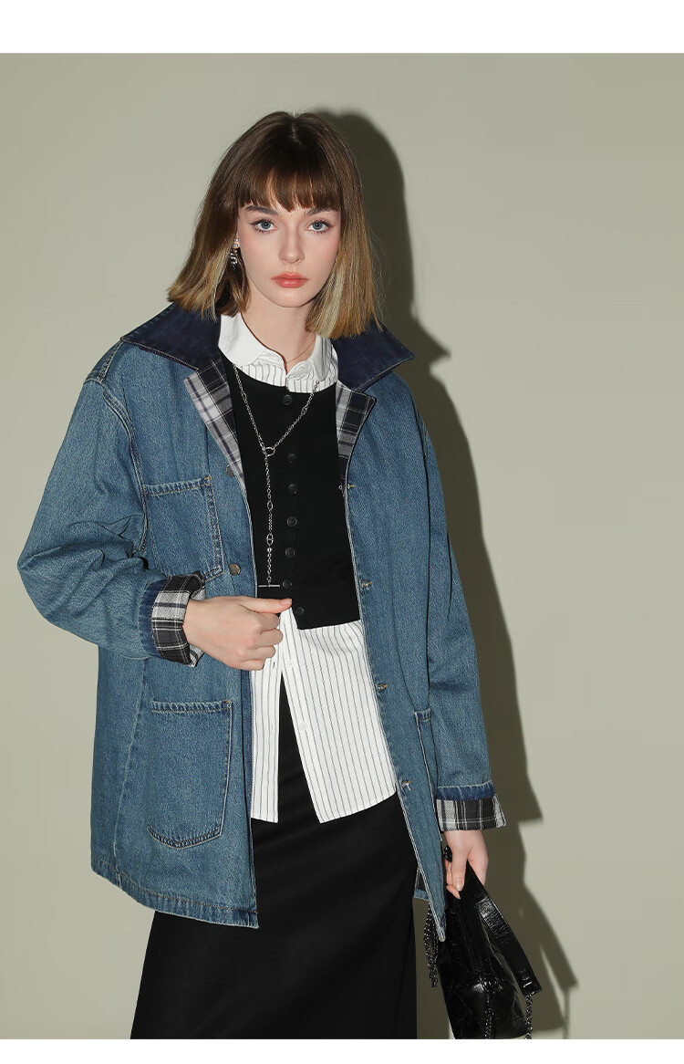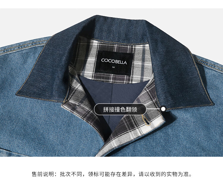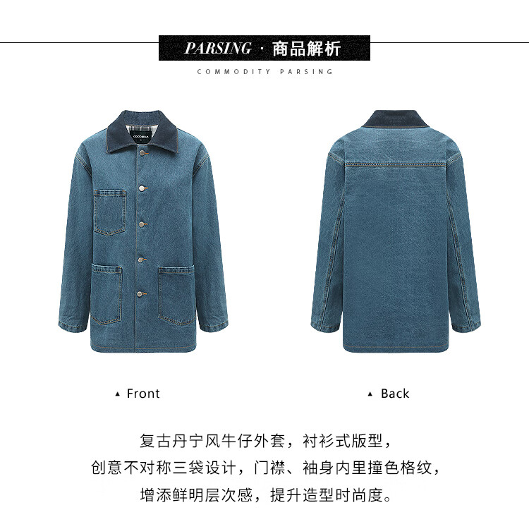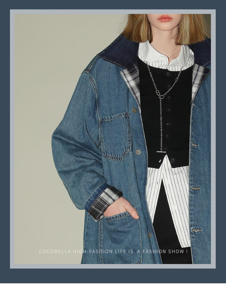 【限时特惠】COCOBELLA复古撞色格子重工牛仔外套休闲宽松丹宁风衣DN0008