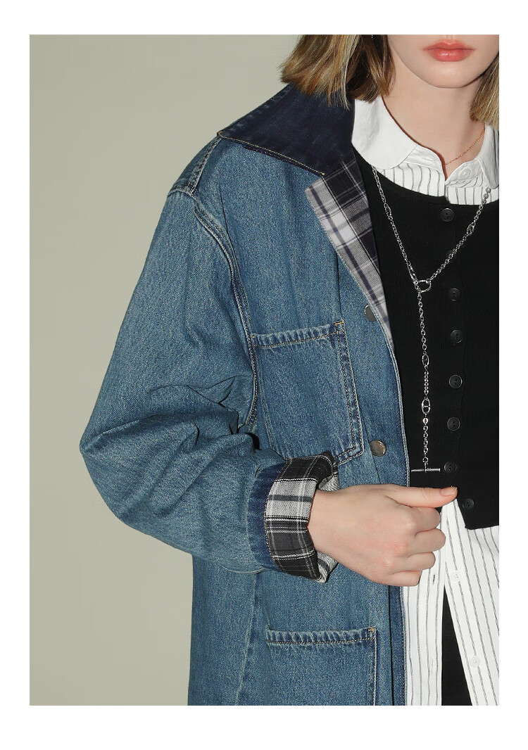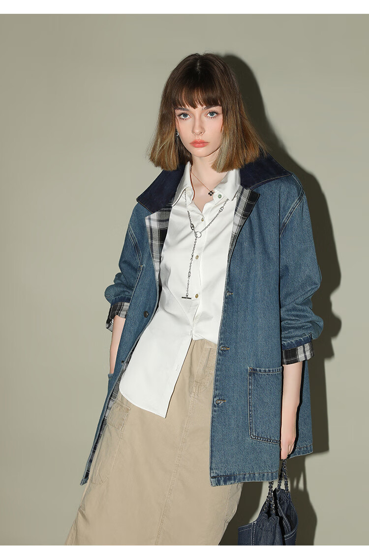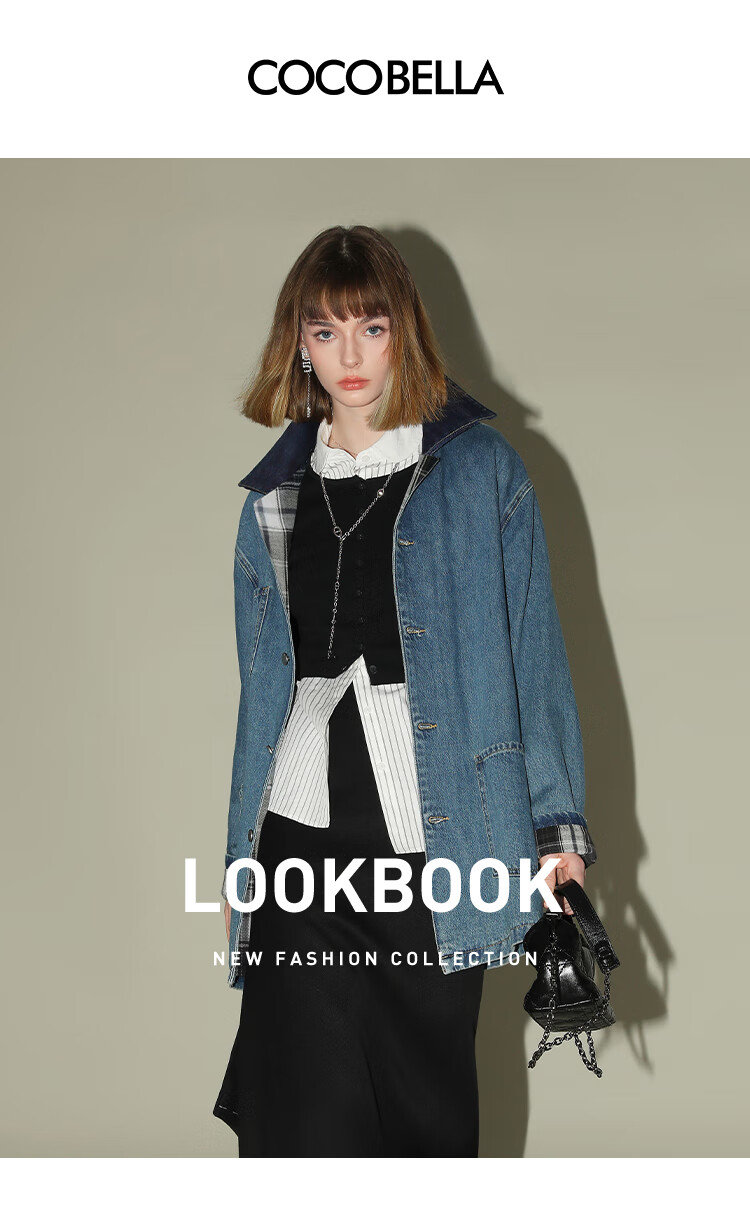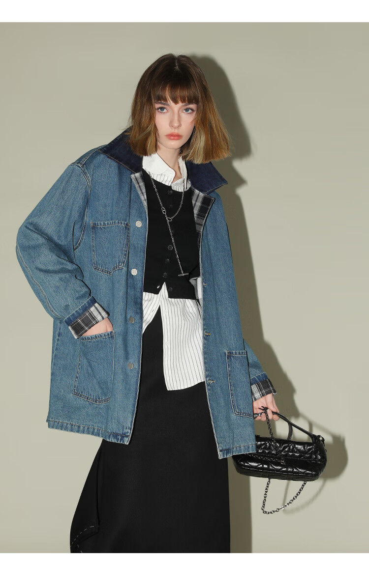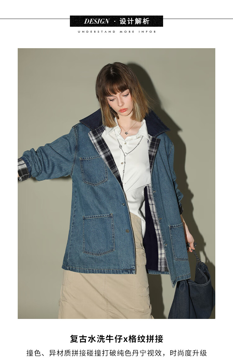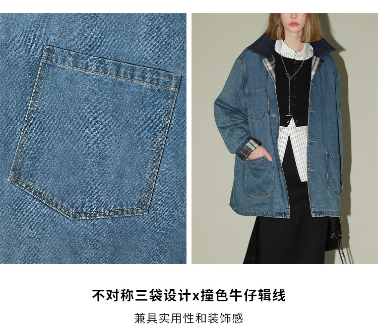 【限时特惠】COCOBELLA复古撞色格子重工牛仔外套休闲宽松丹宁风衣DN0008