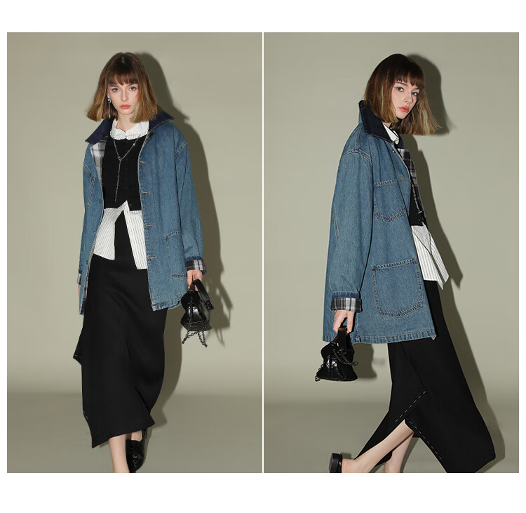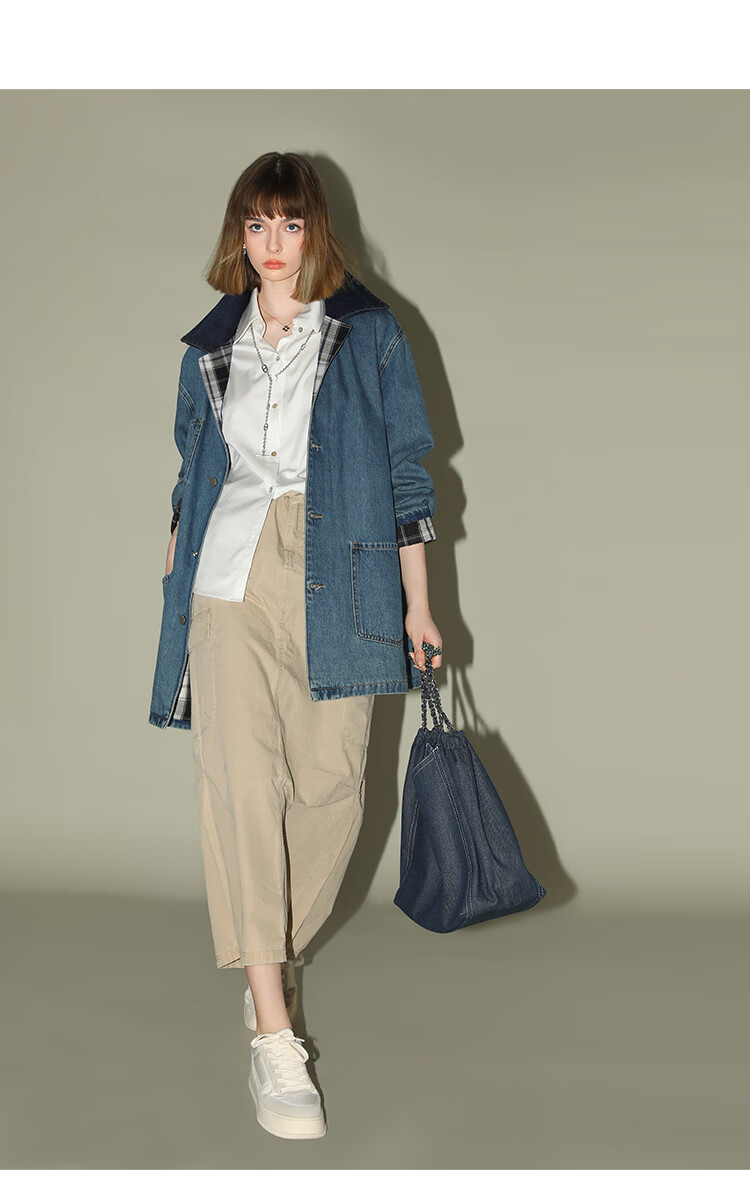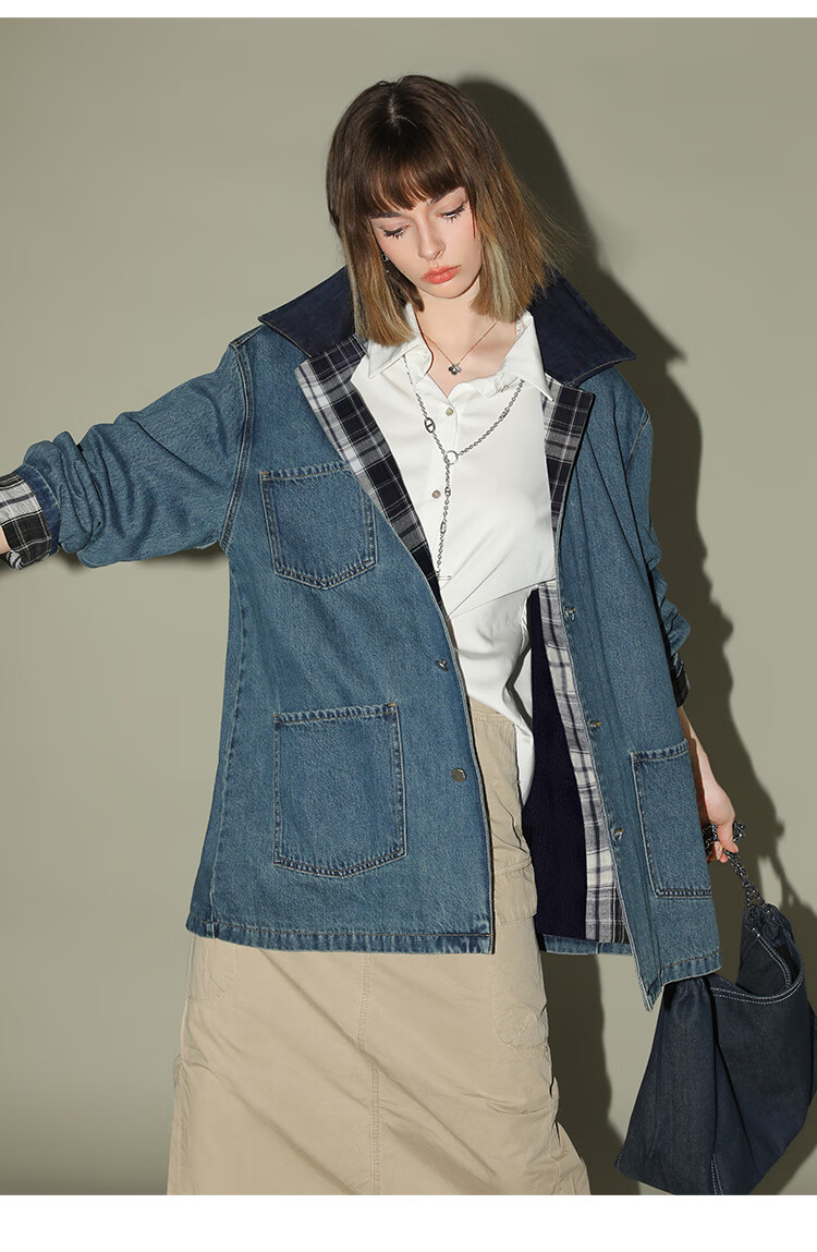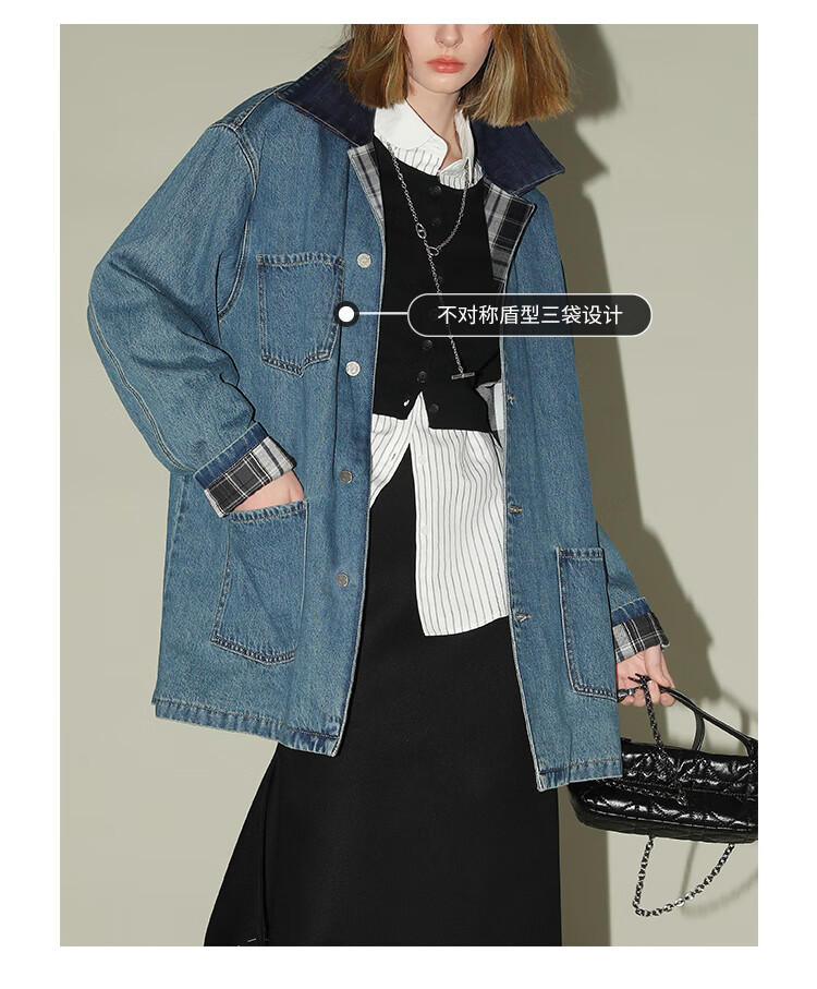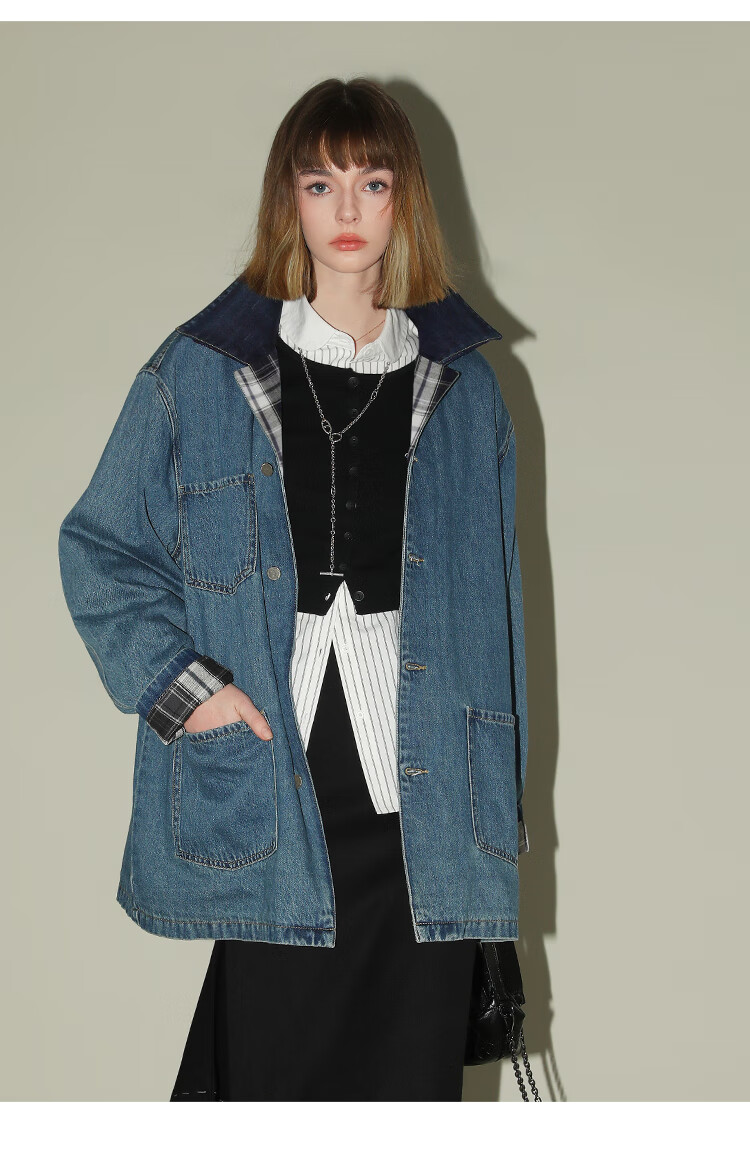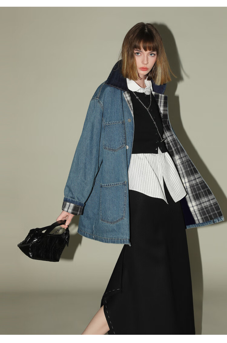 【限时特惠】COCOBELLA复古撞色格子重工牛仔外套休闲宽松丹宁风衣DN0008