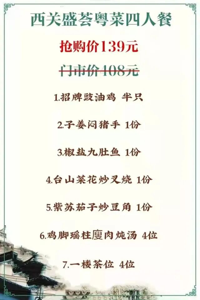 抢购截止日期12月12日【荔湾区·唐铭广场·西关盛荟】领略岭南风情,品味匠心粤菜!仅¥139抢粤菜4人餐=招牌豉油鸡+子姜闷猪手+椒盐九肚鱼+紫苏豆角炒茄子等