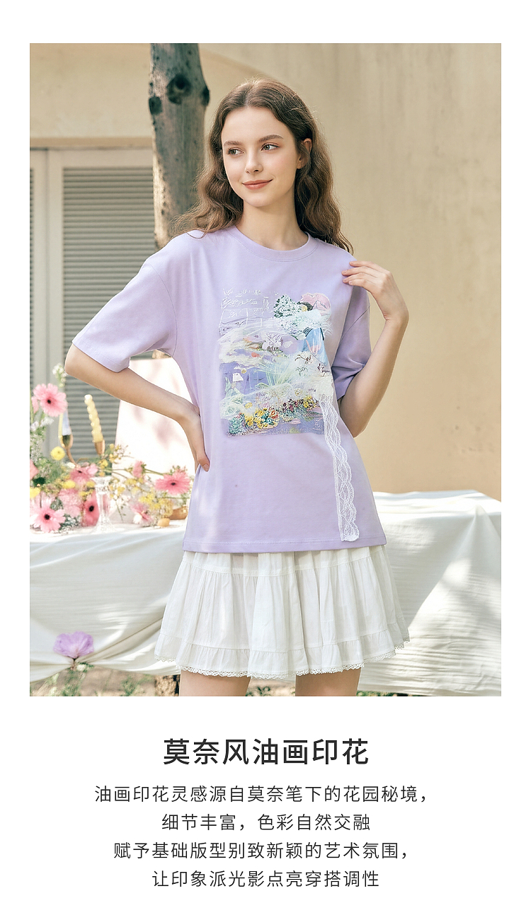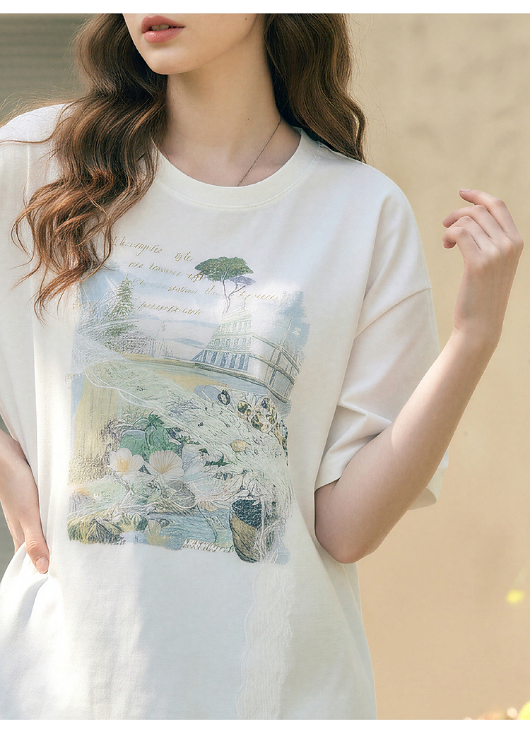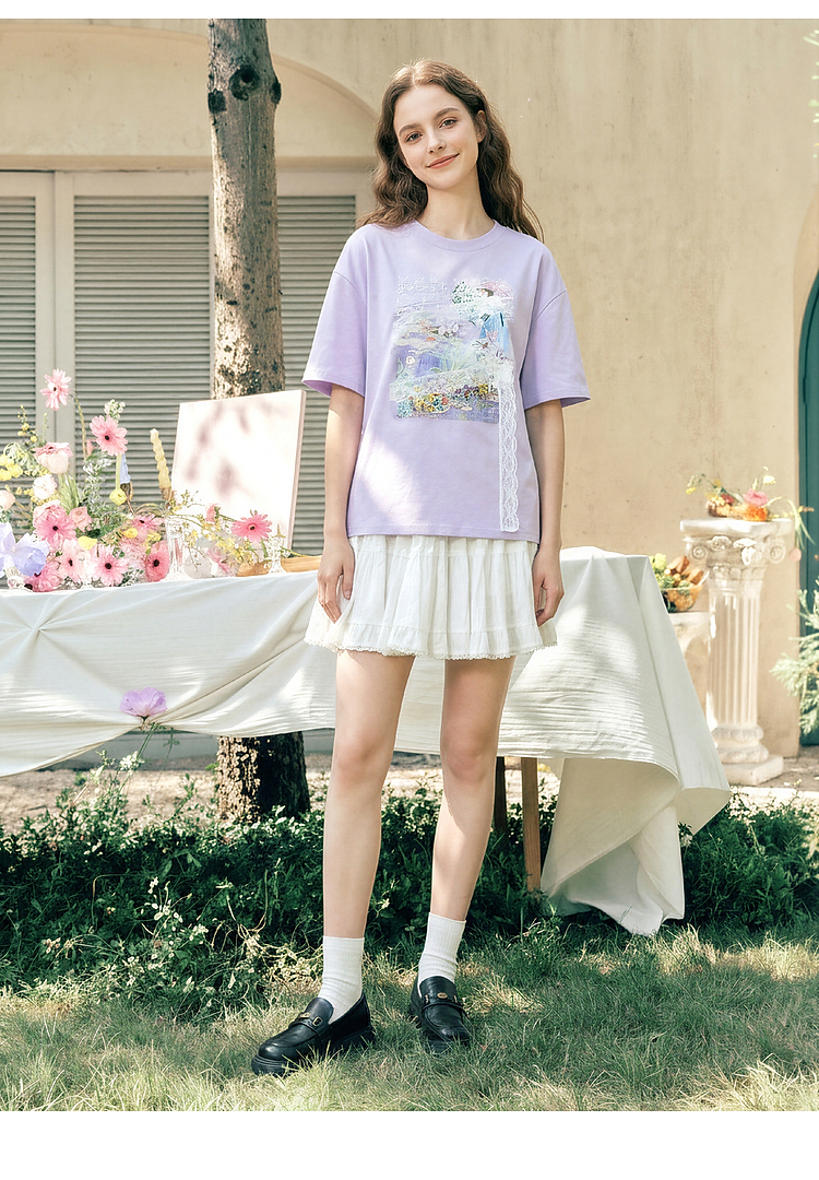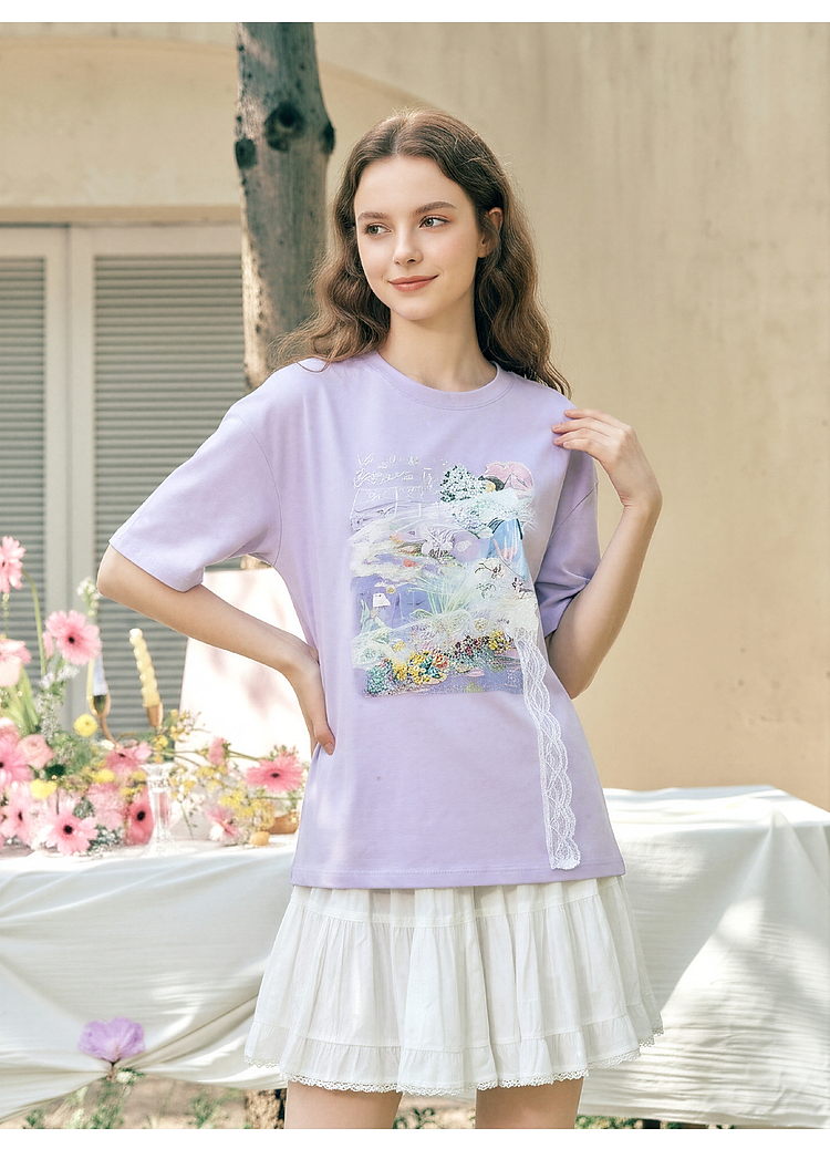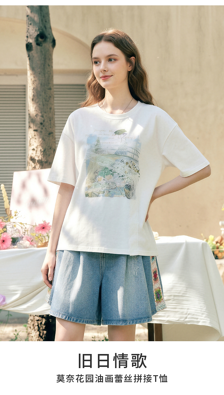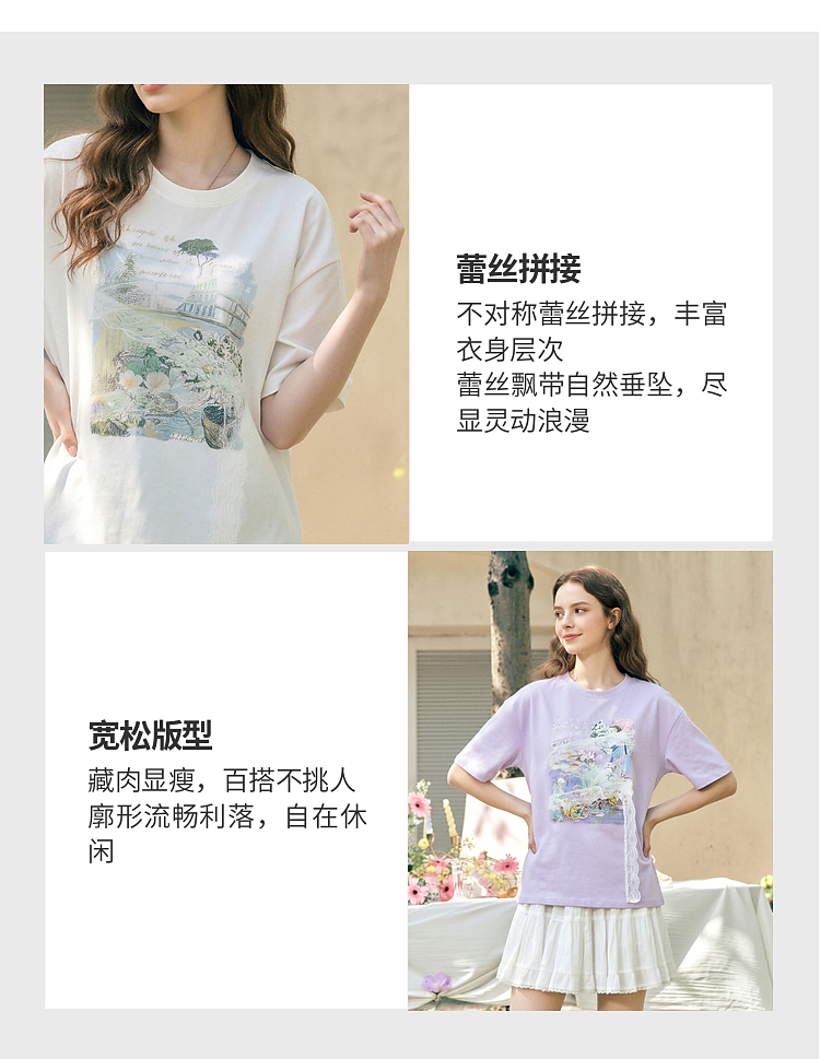 两三事 旧日情歌 2026春季新款小清新蕾丝拼接印花短袖T恤女宽松