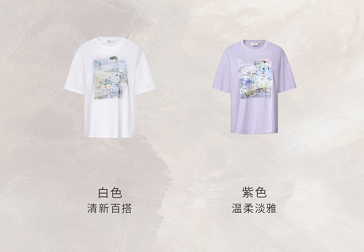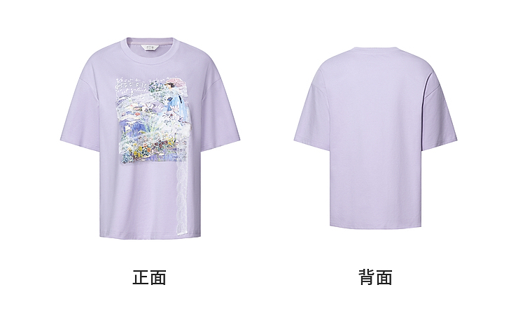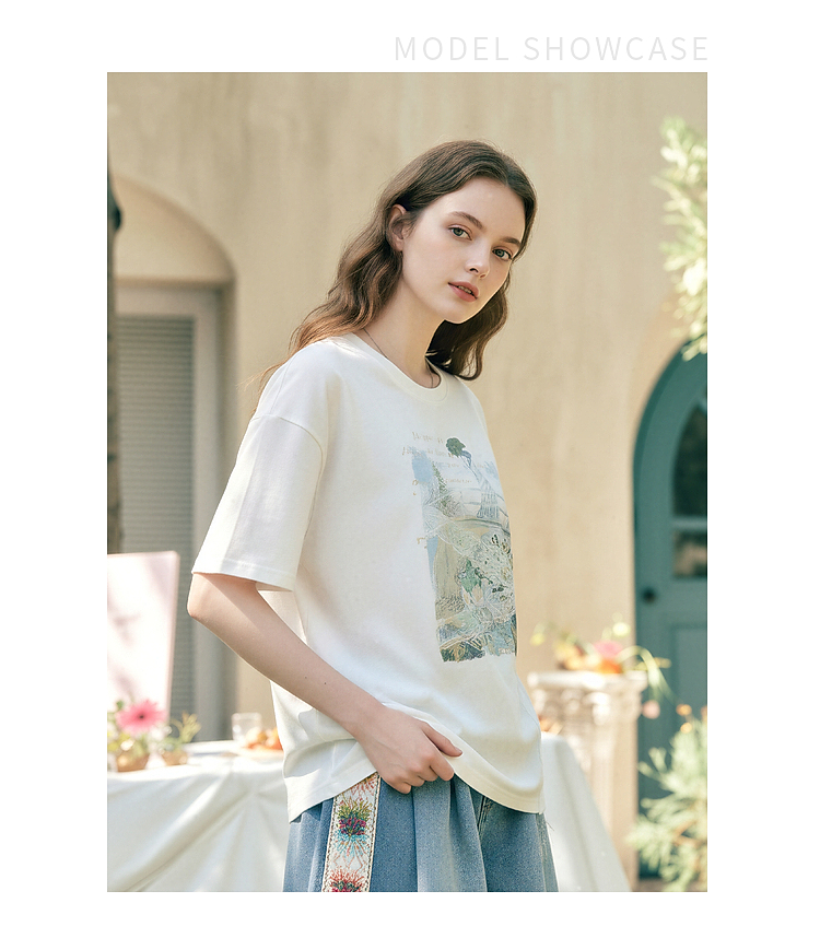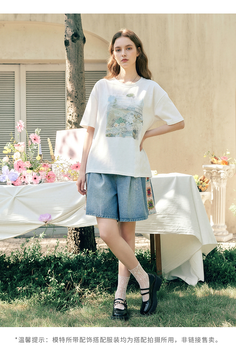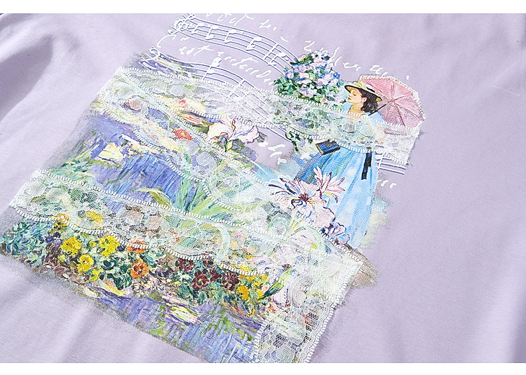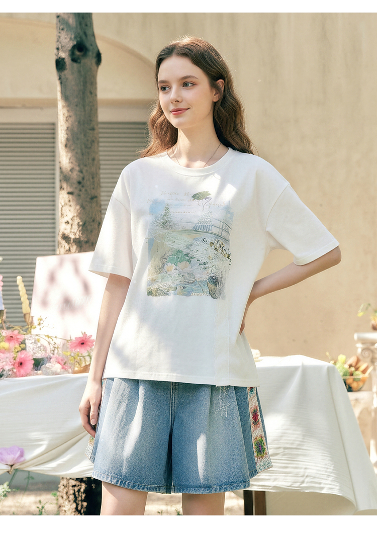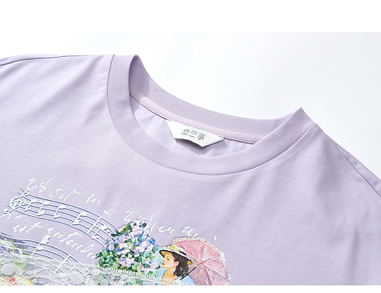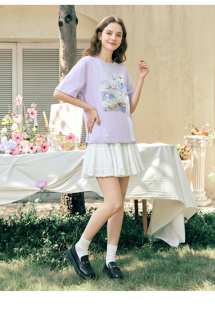 两三事 旧日情歌 2026春季新款小清新蕾丝拼接印花短袖T恤女宽松