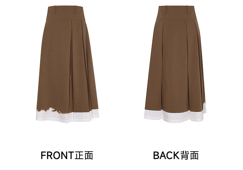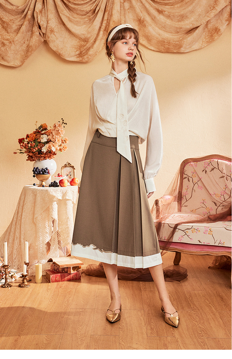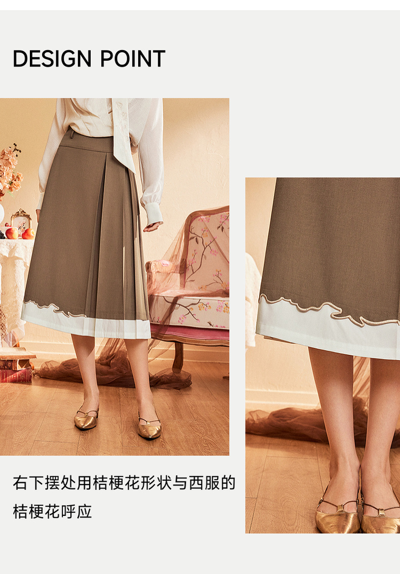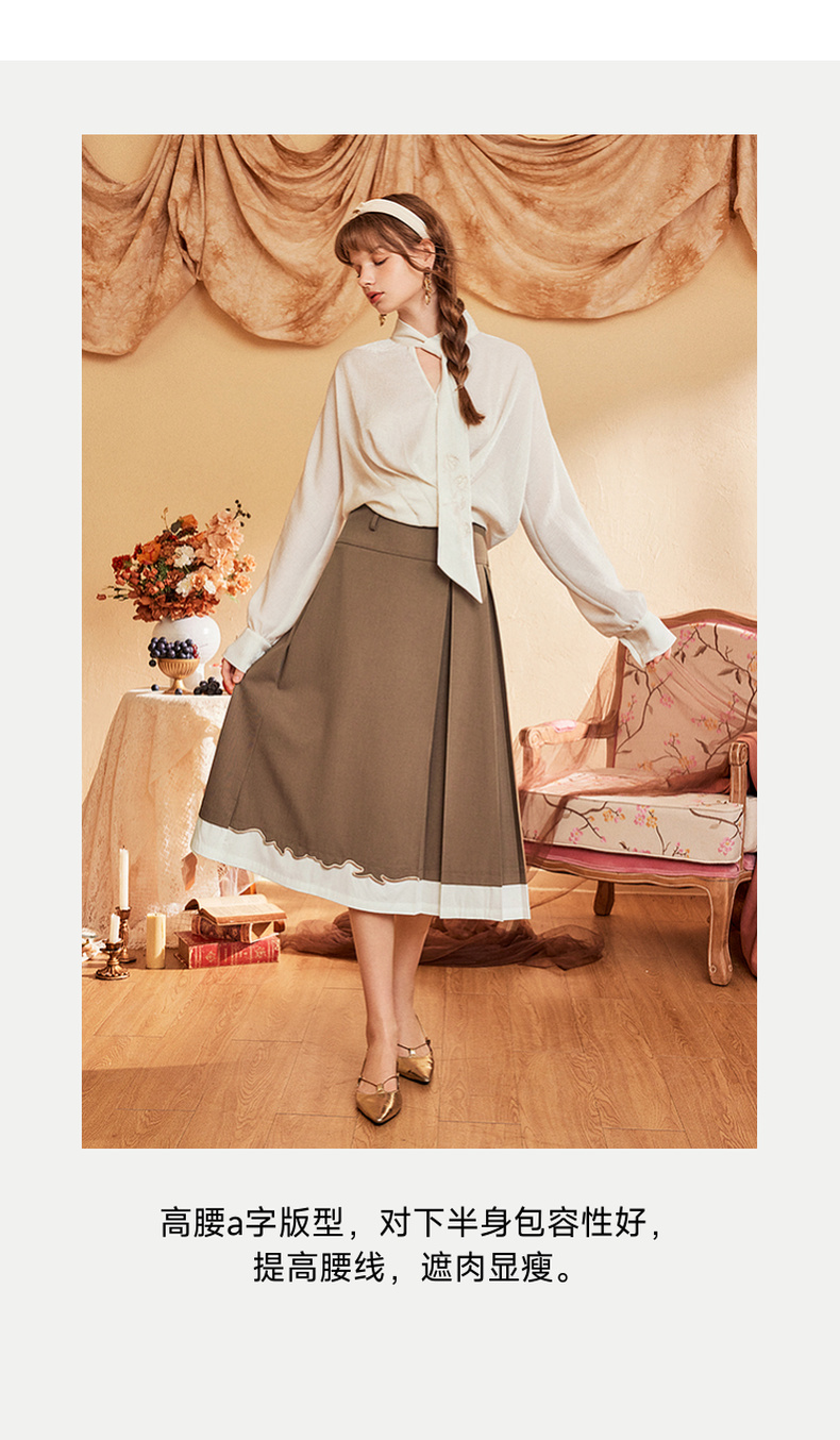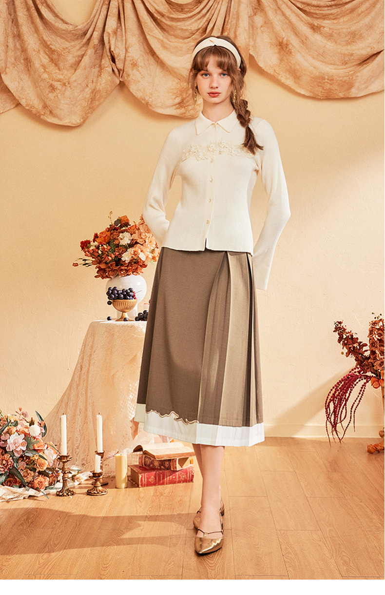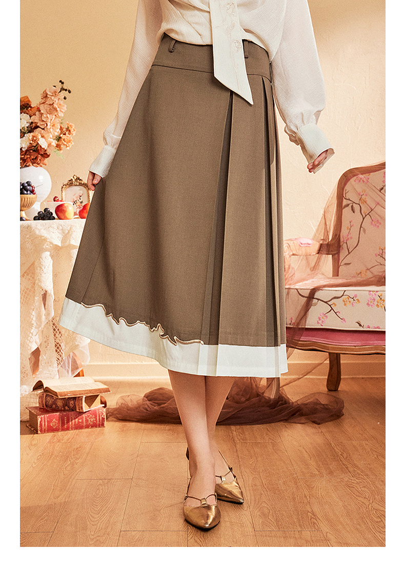 两三事爱久弥新2024秋季新款简约拼色刺绣裙摆百褶裙A字半身裙