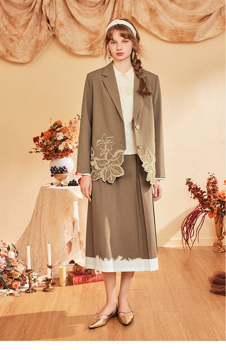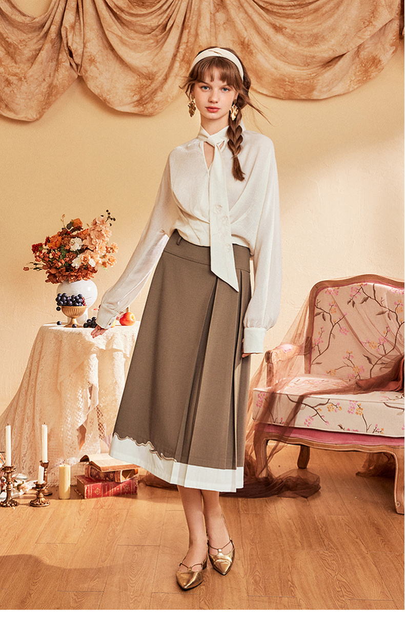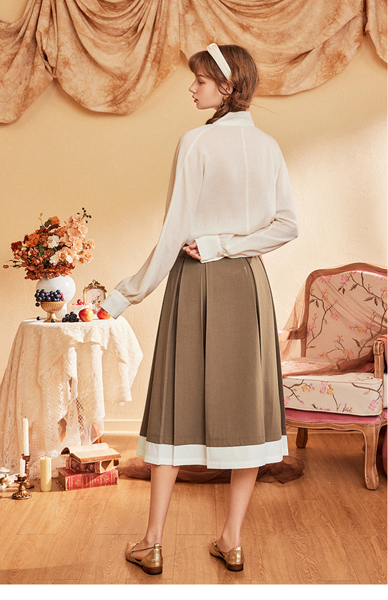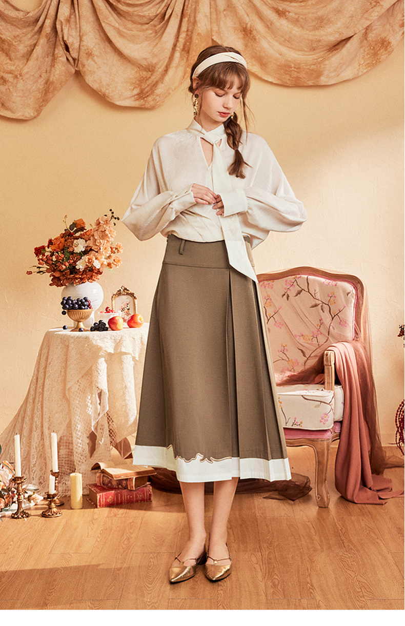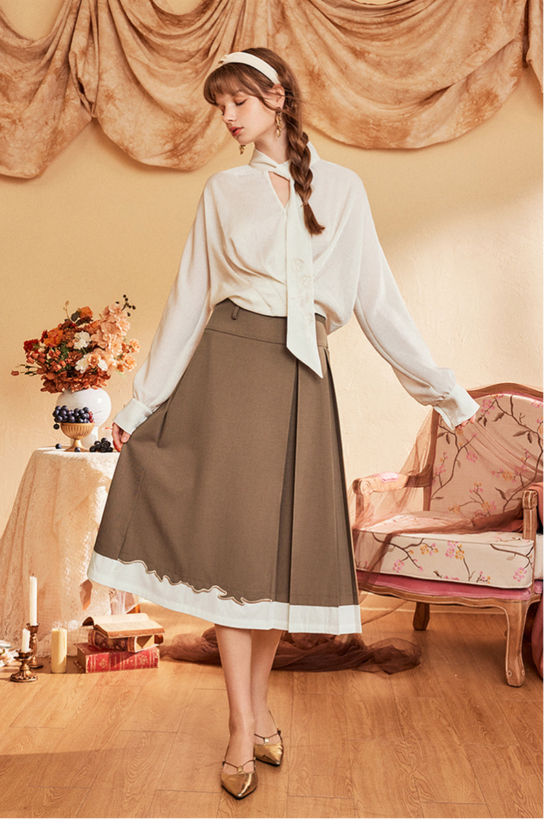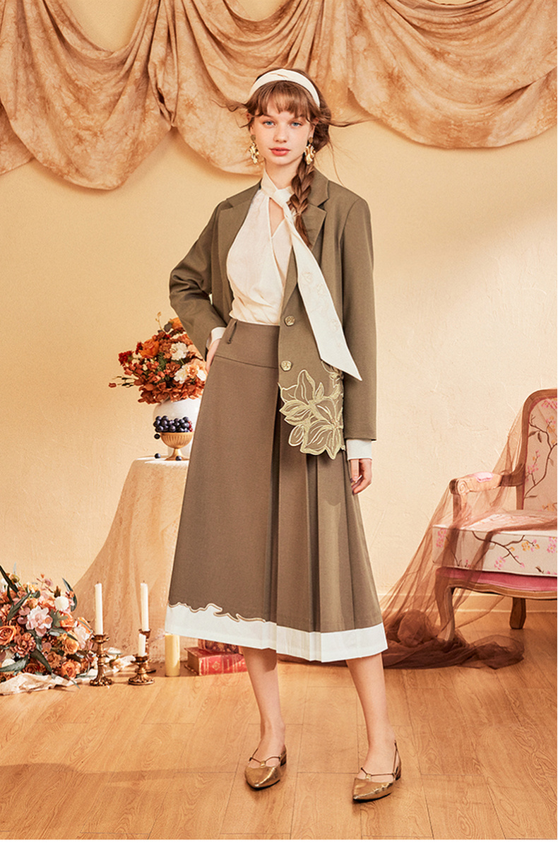 两三事爱久弥新2024秋季新款简约拼色刺绣裙摆百褶裙A字半身裙