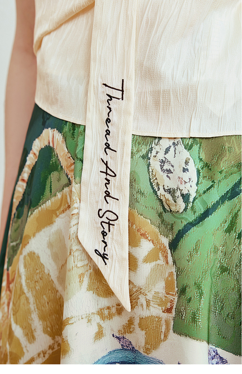 两三事 森灵绮梦 2025夏季新款小清新印花拼色绑带吊带裙连衣裙