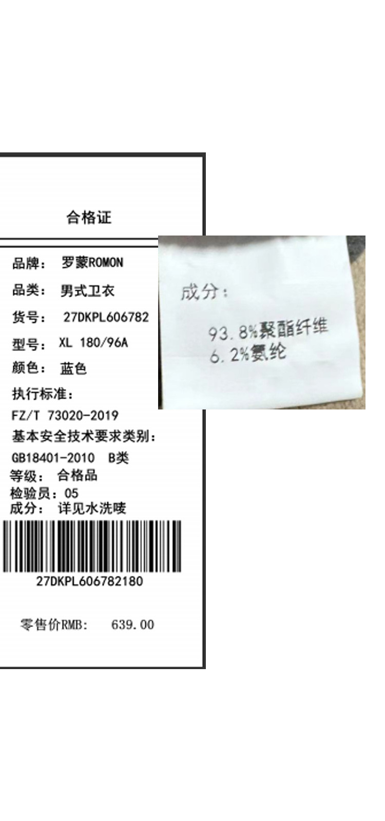 面料:93.8%聚酯纤维 6.2%氨纶