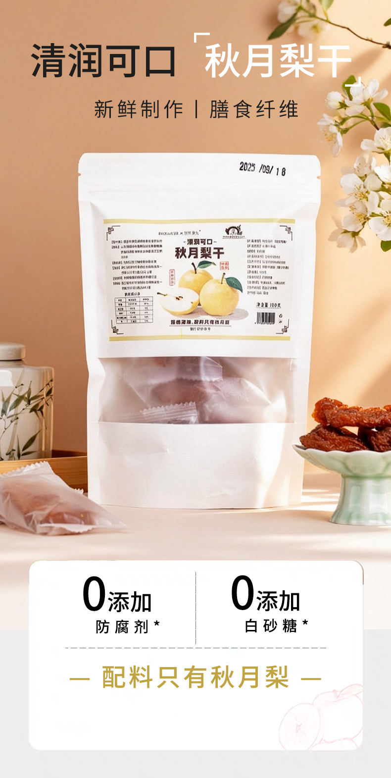 这款秋月梨干的配料表仅有秋月梨1个食材,没有添加蔗糖、 防腐剂、香精!