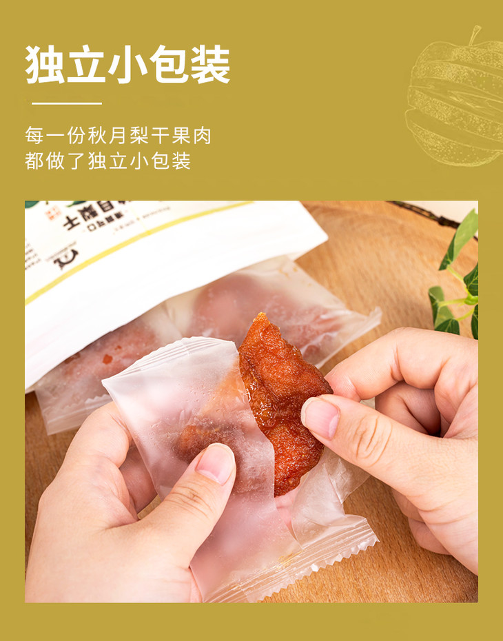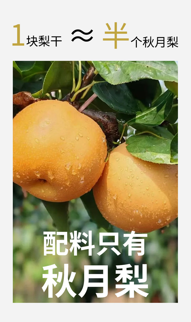 每个果子都经由逐个挑选,个大饱满,不用烂果、坏果,10斤新鲜秋月梨才能制成1斤秋月梨干,每块秋月梨干相当于半颗梨!