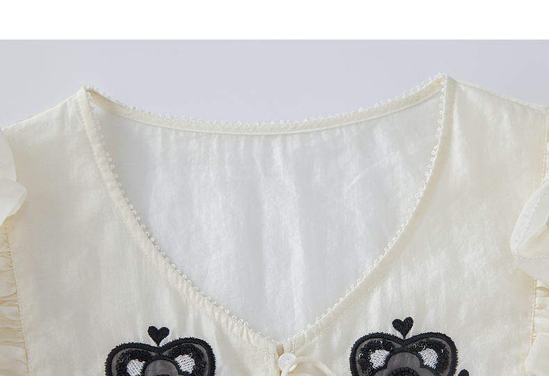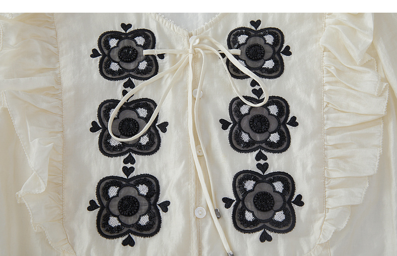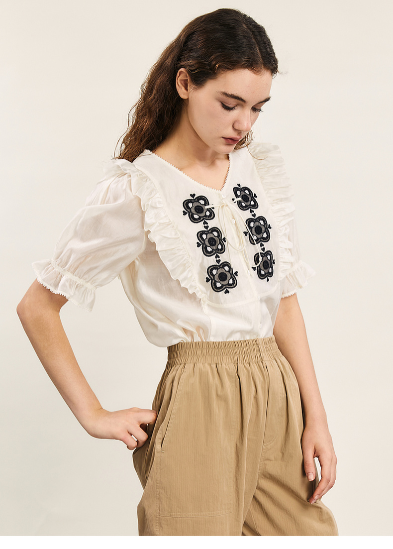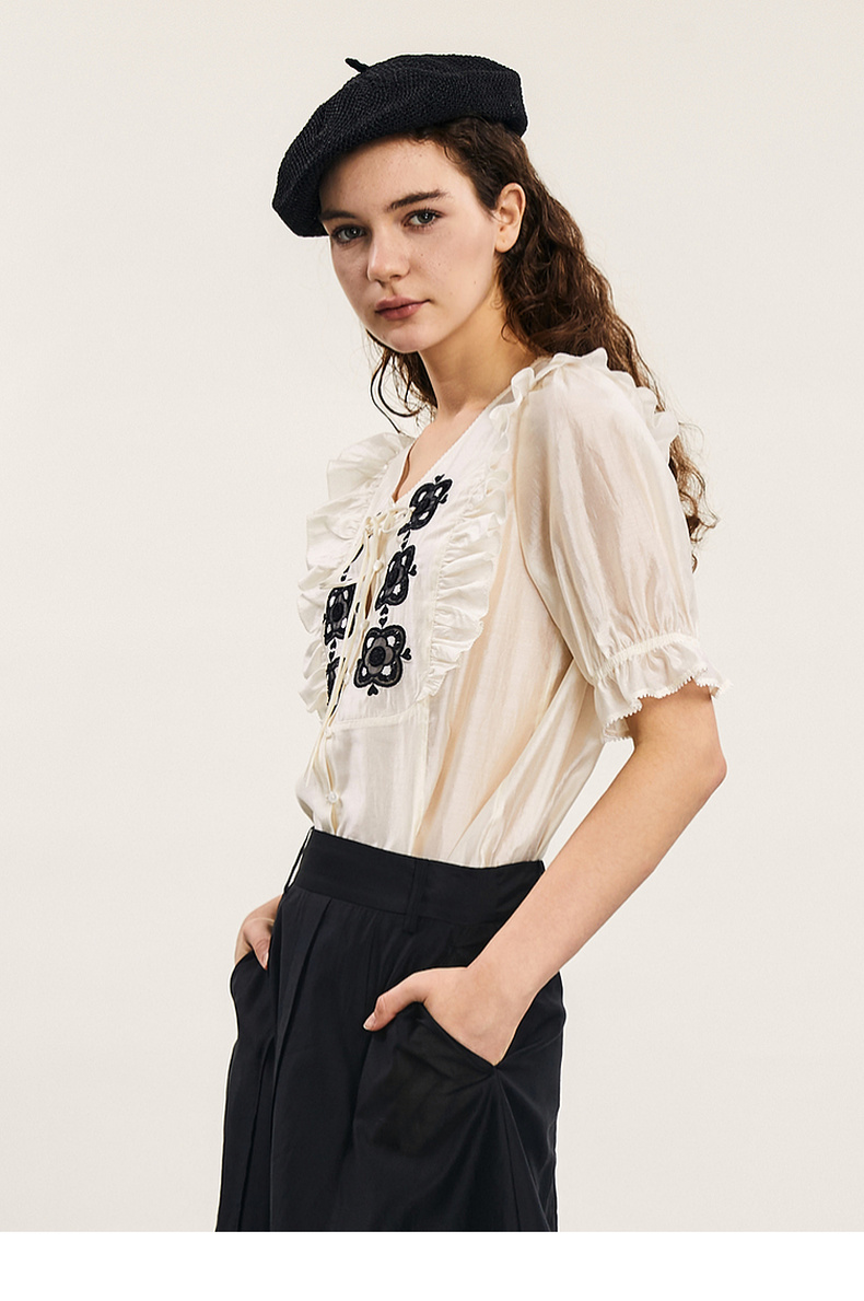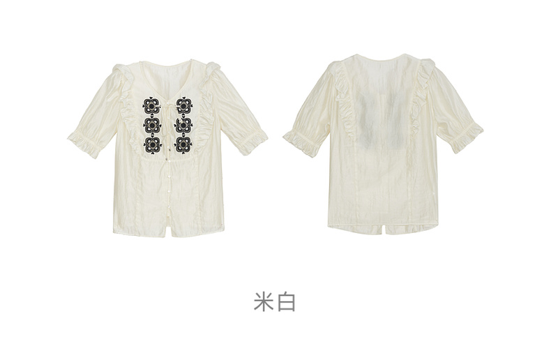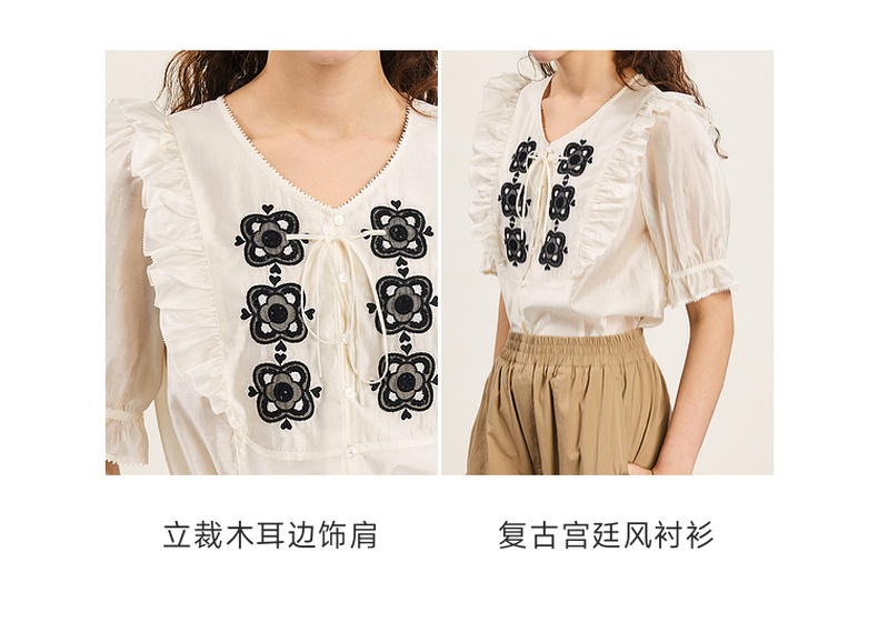 谜底绣花上衣短袖女2024年夏新品复古宫廷风木耳边衬衣242MS0603