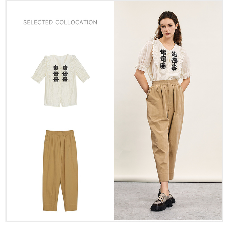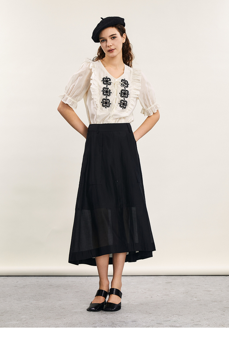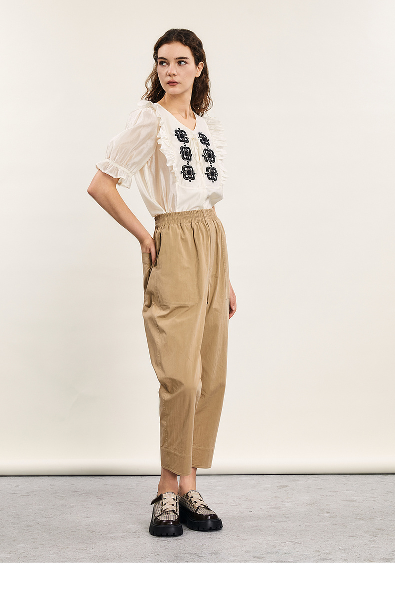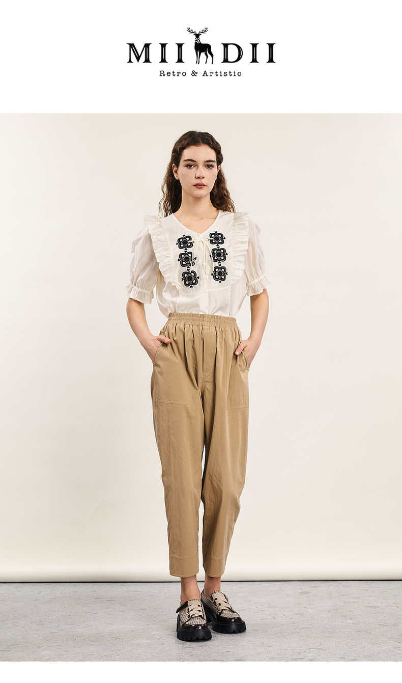 谜底绣花上衣短袖女2024年夏新品复古宫廷风木耳边衬衣242MS0603