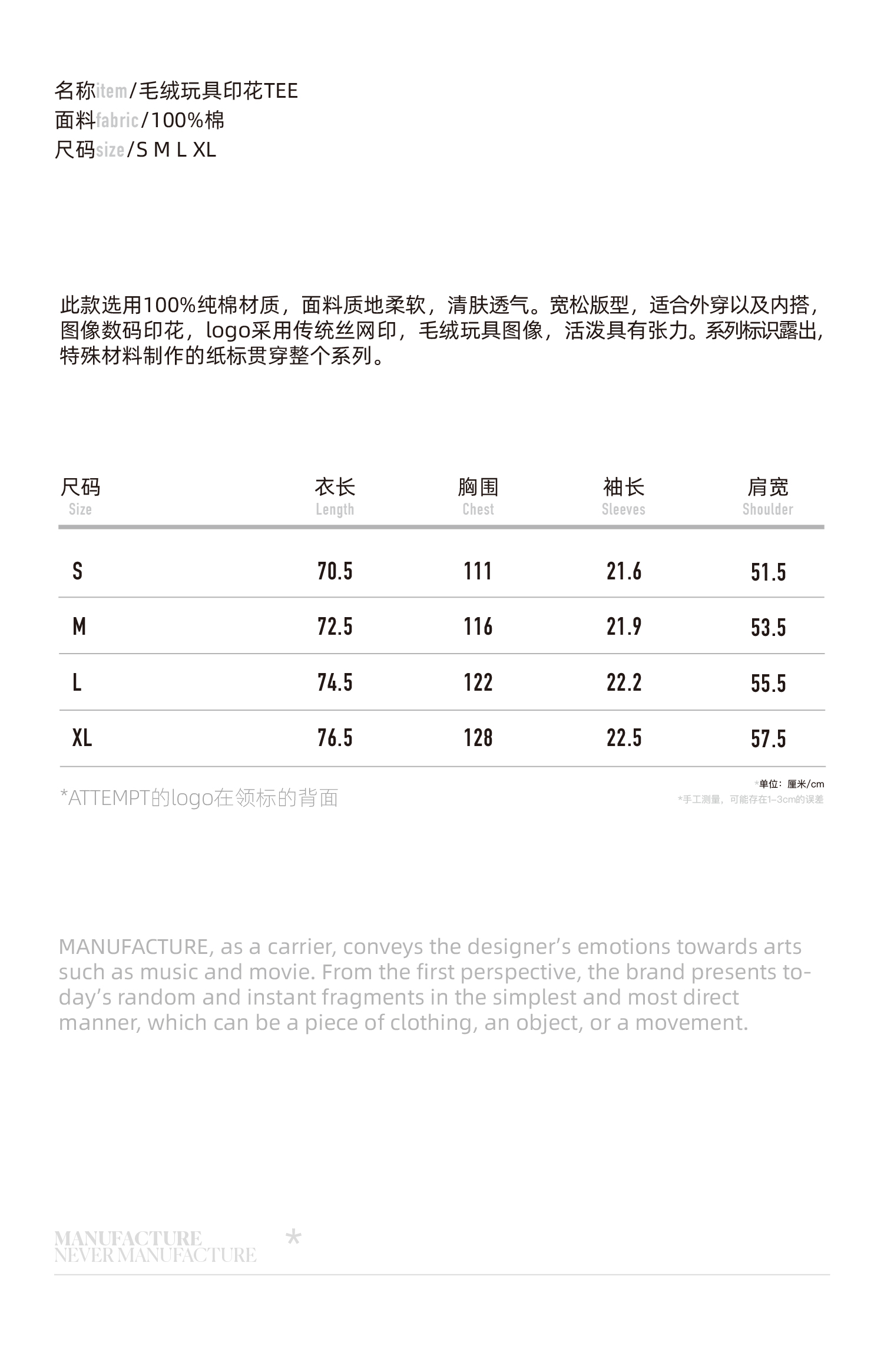 MANUFACTURE BY ATTEMPT 毛绒玩具印花短袖T恤