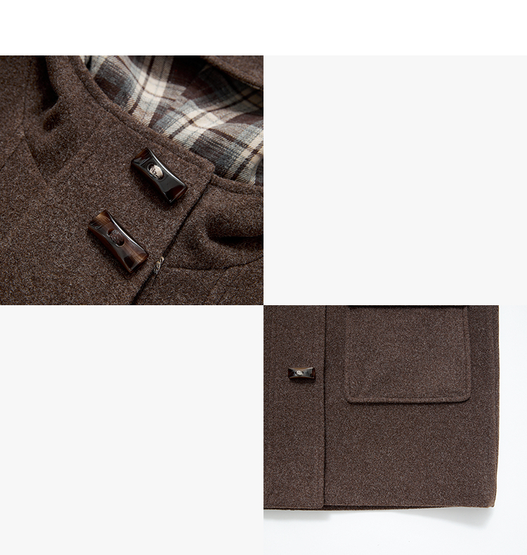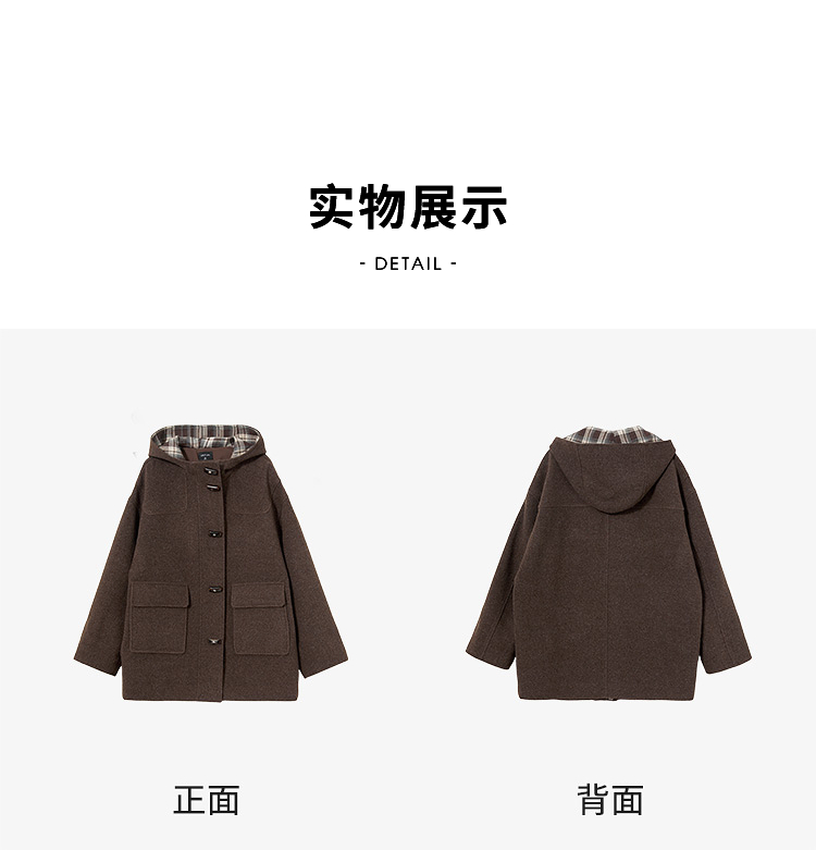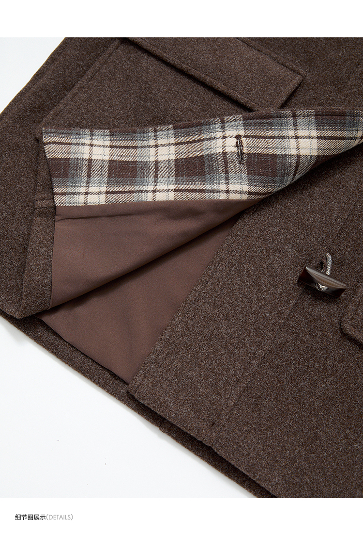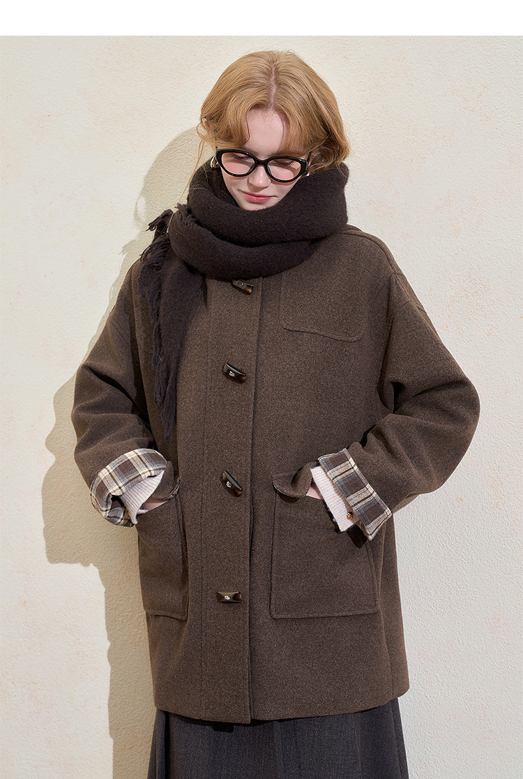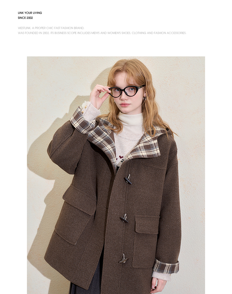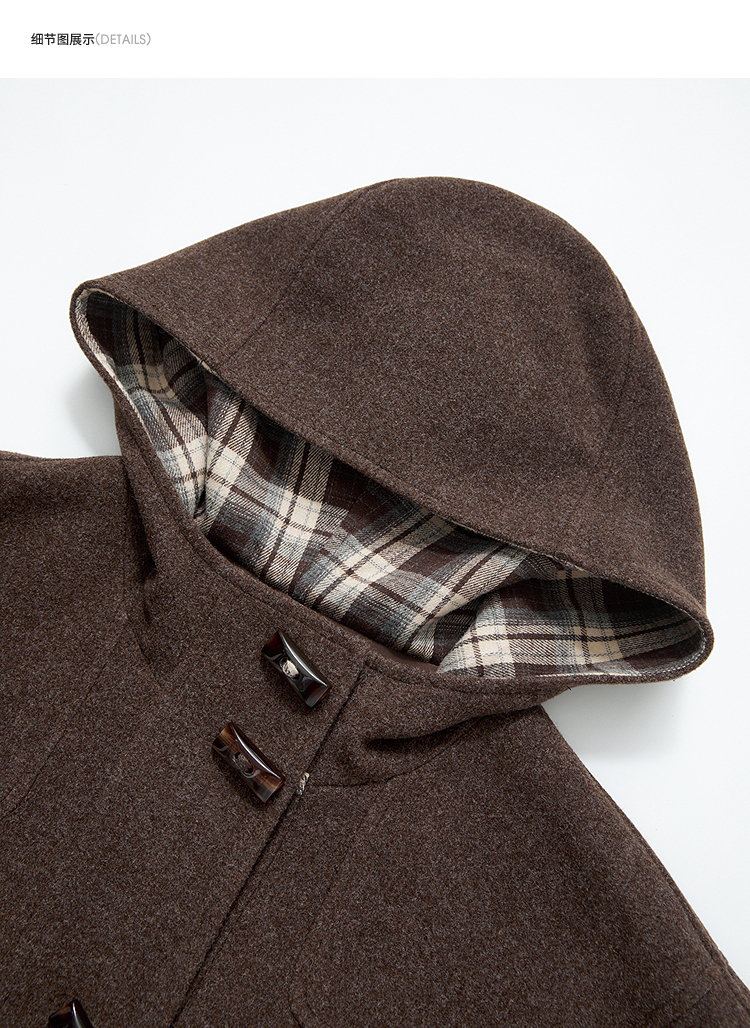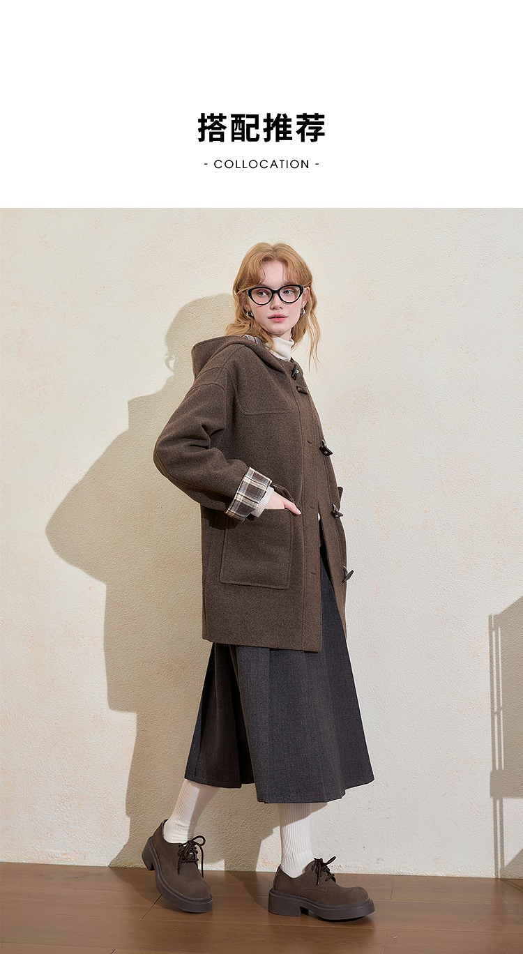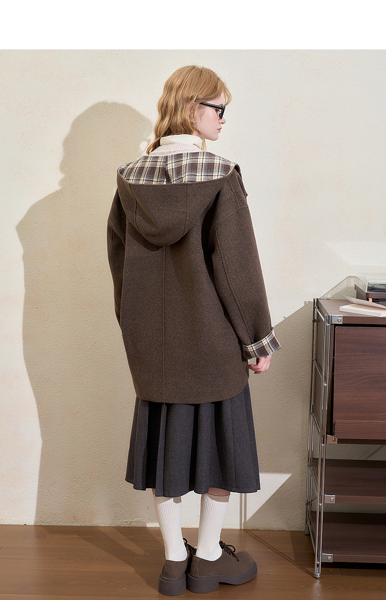 西遇美拉德羊角扣毛呢大衣女冬季新款格纹撞色中长款连帽外套V3955356