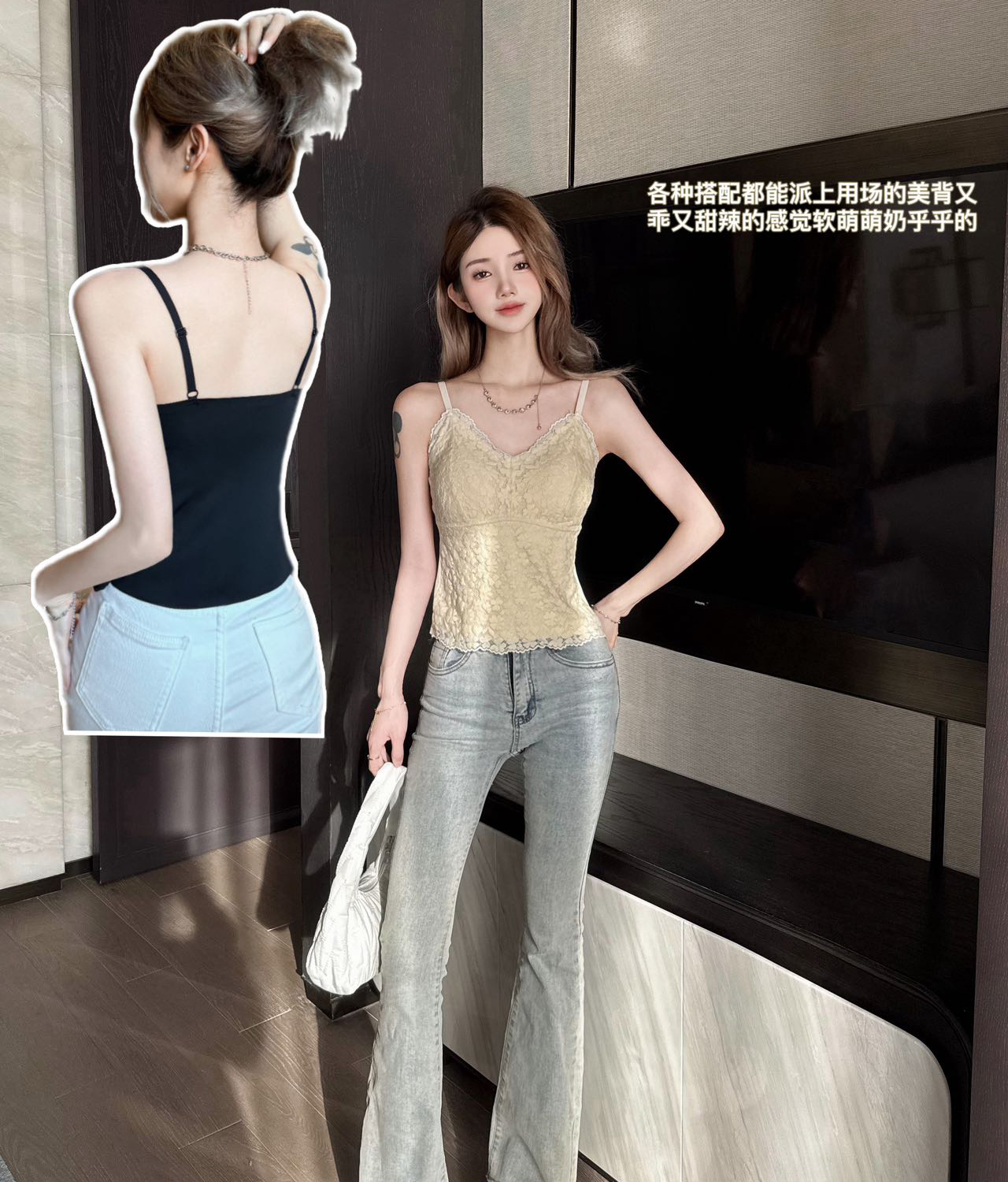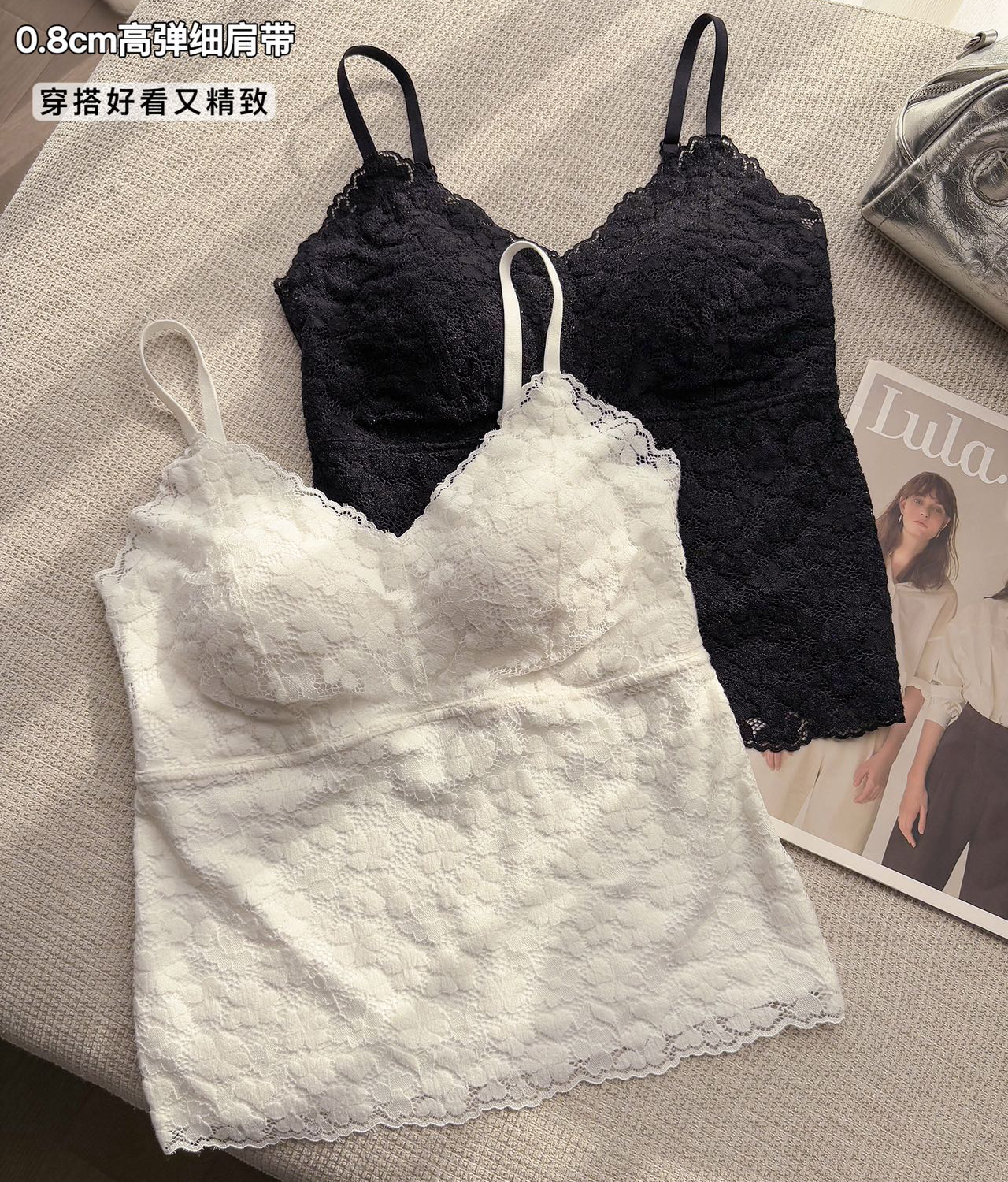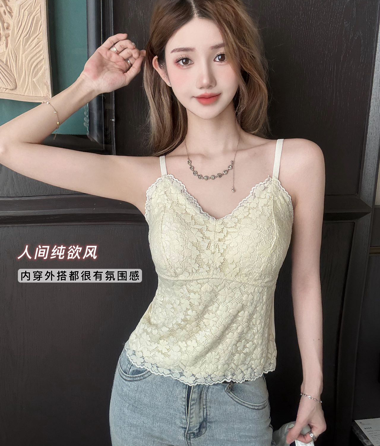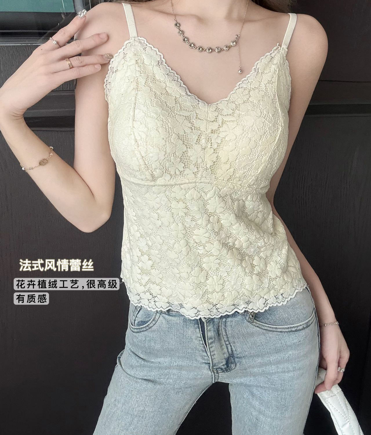 【99元2件】法式小蕾丝深V领美背细肩带吊带背心(带胸垫)【FF25509】