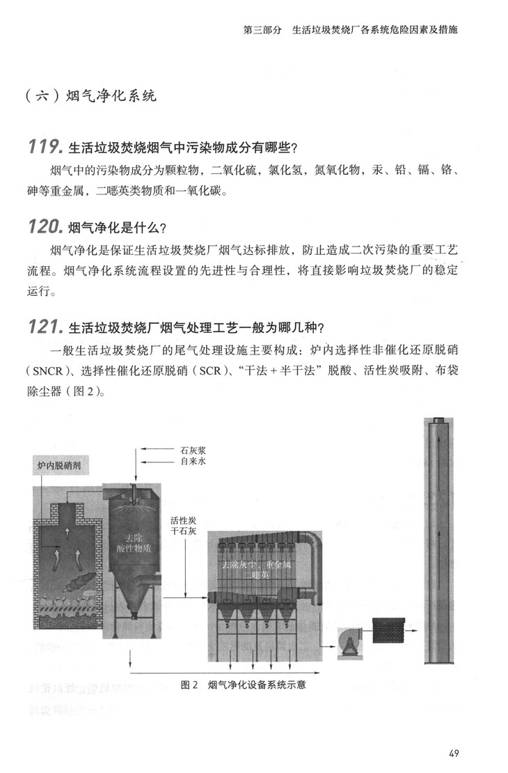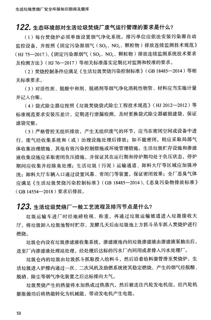 《生活垃圾焚烧厂安全环保知识指南及题库》包含六个部分,以“安全、环保”为主线,从生活垃圾焚烧厂的基本常识入手,以问答形式由浅入深地普及有关生活垃圾焚烧的安全环保法律法规、政策、各系统危险因素、应急处理措施、消防、危险作业、职业健康的知识。