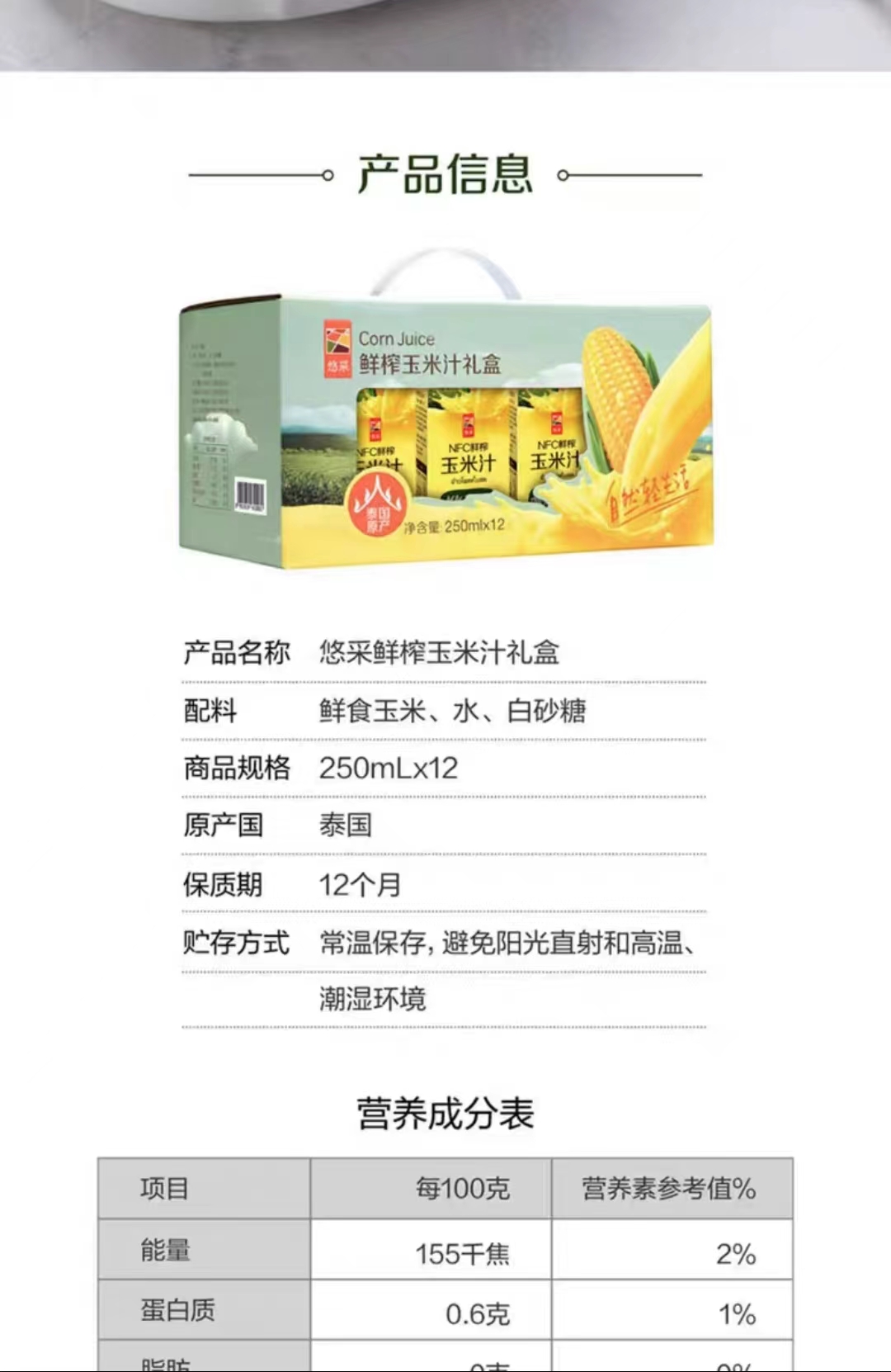 中粮悠采 泰国原产鲜榨玉米汁礼盒 250ml*12盒(效期至2025年11月18日,介意勿拍)