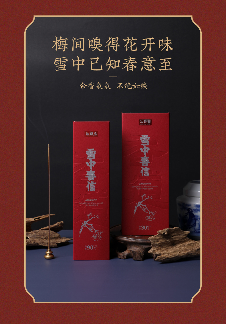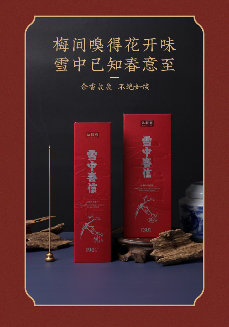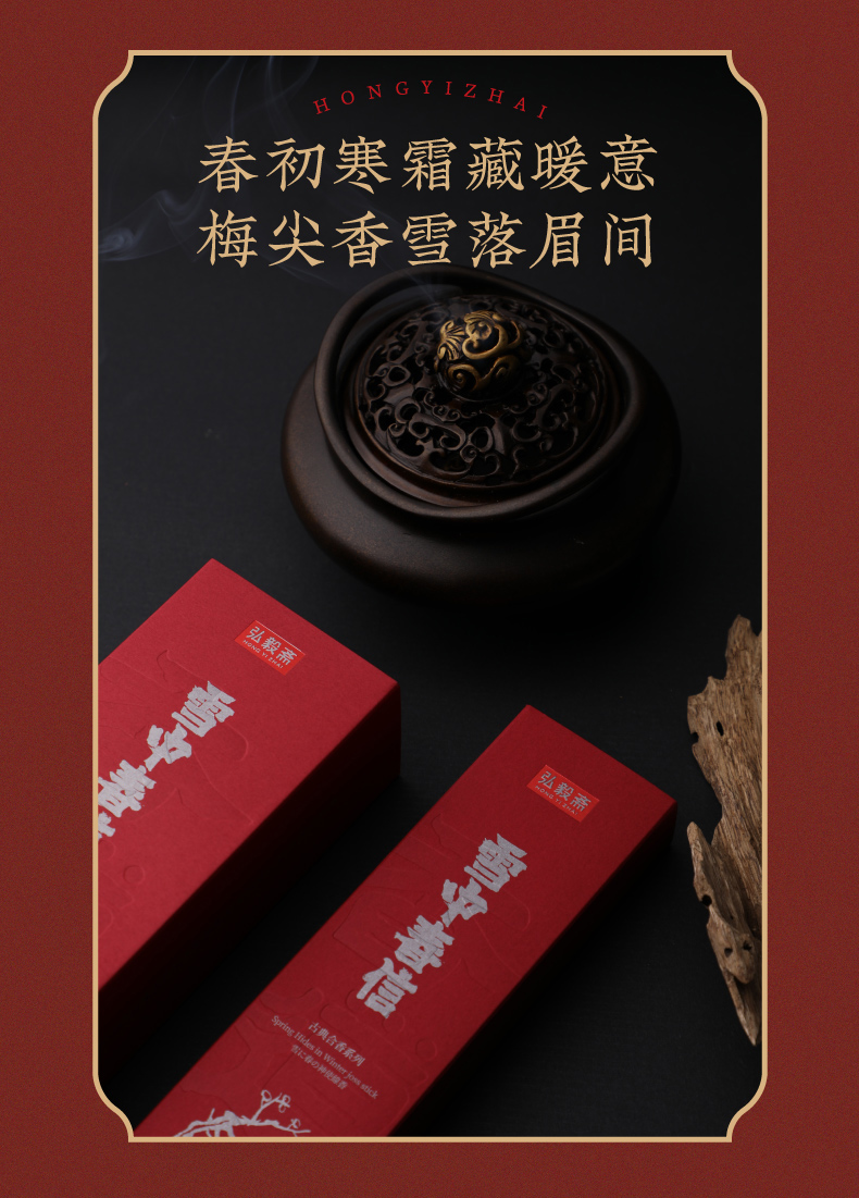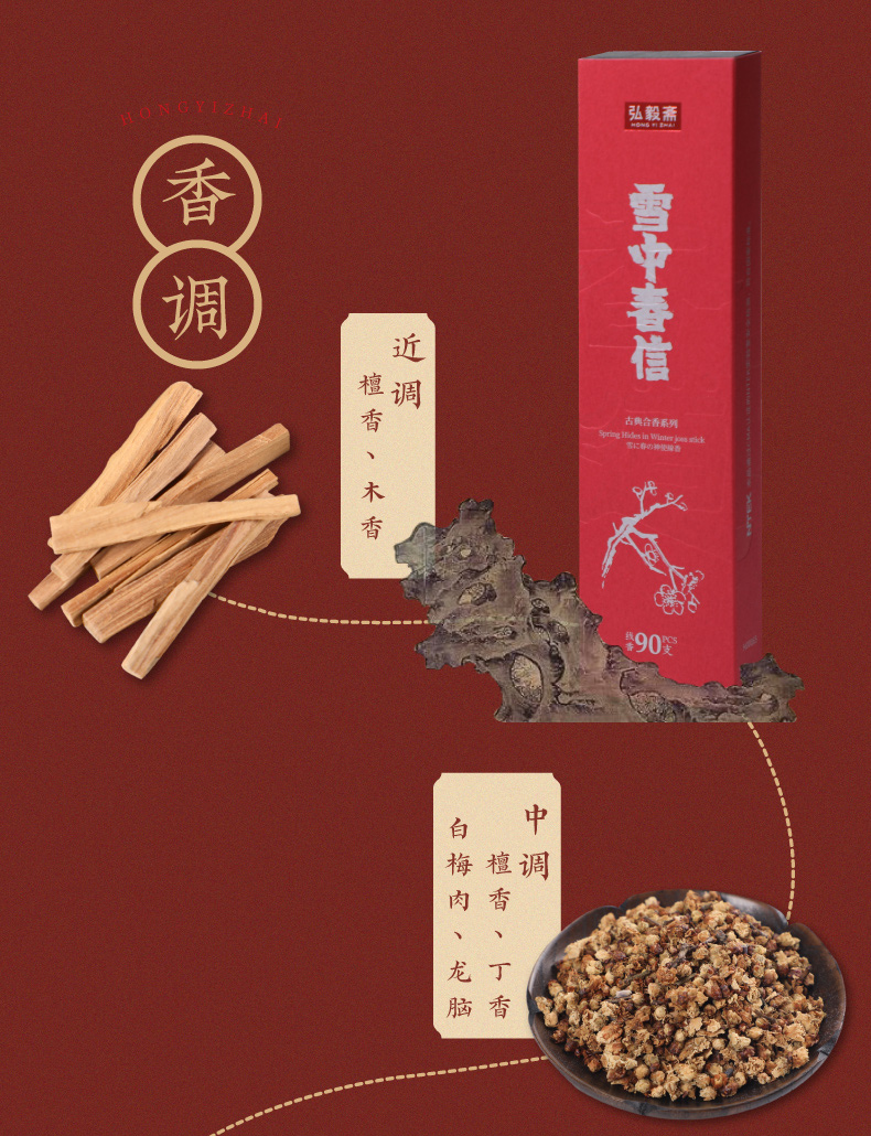 雪中春信,于清冷中见暖意,藉由檀香的辛暖香调来中和龙脑的凉意,沿用古方拟梅韵的传统搭配,以丁香、白梅肉、脑麝的和合来表现梅香的清幽;
