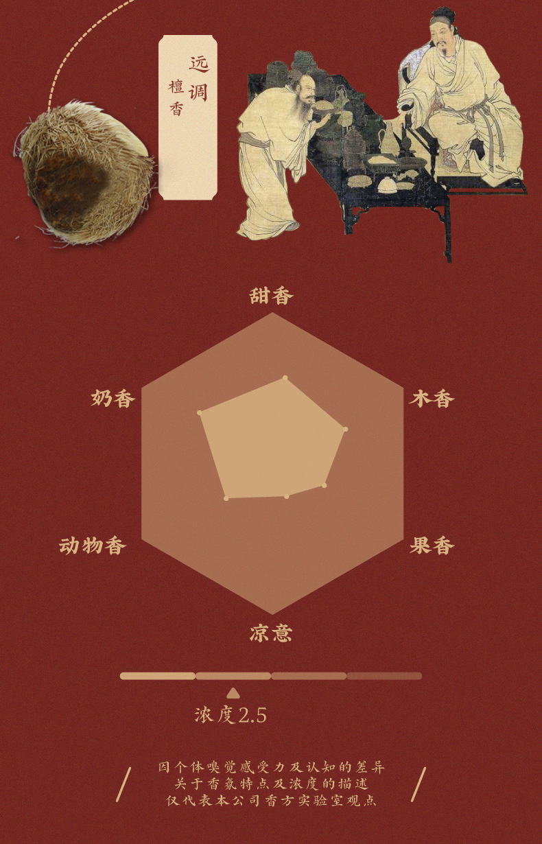 近调:檀香、木香—气味清甜(奶香+甜香)、感觉醇厚绵长;