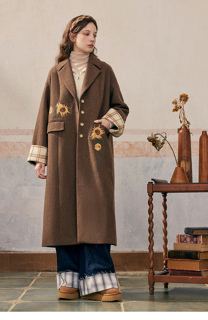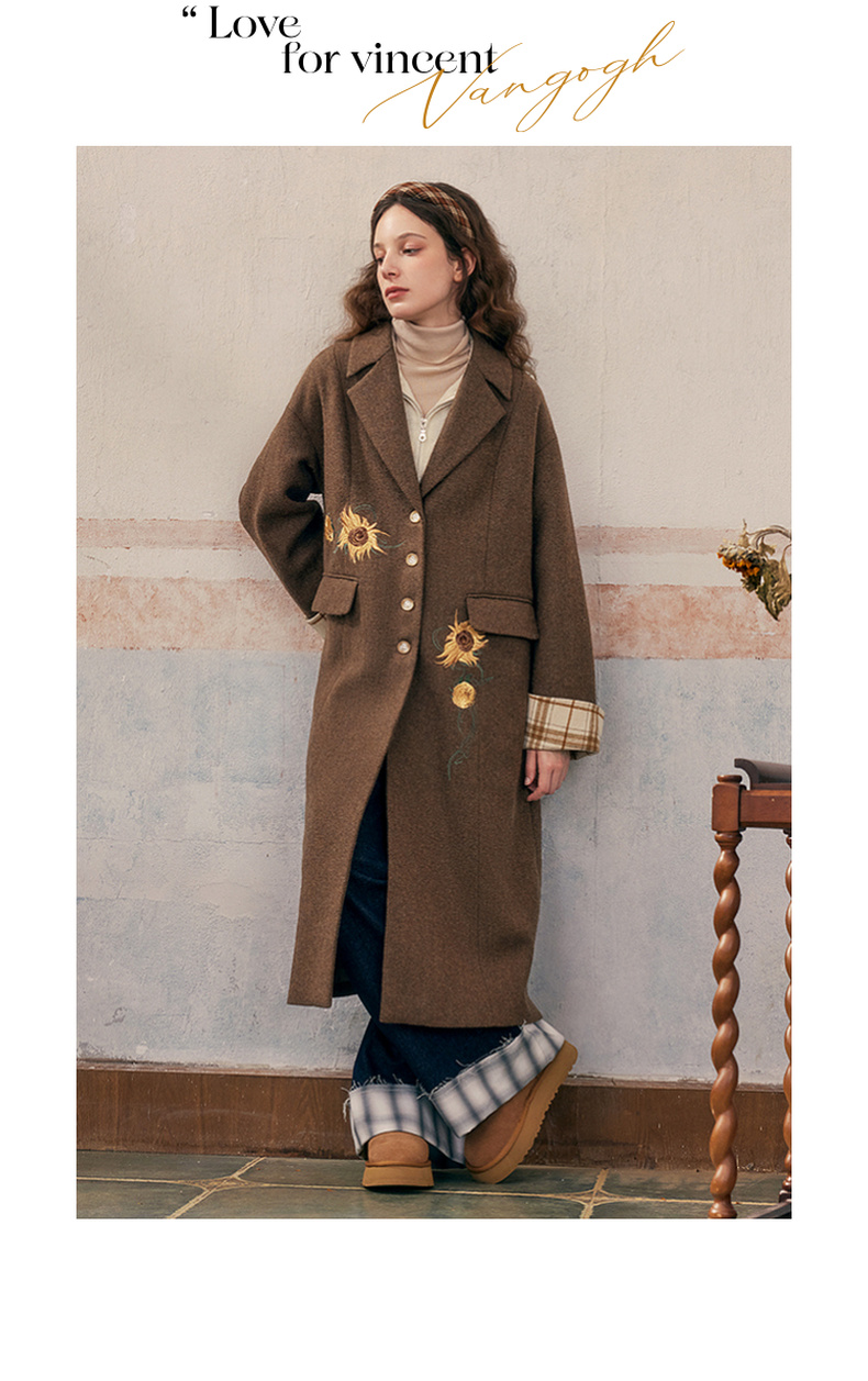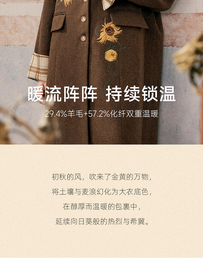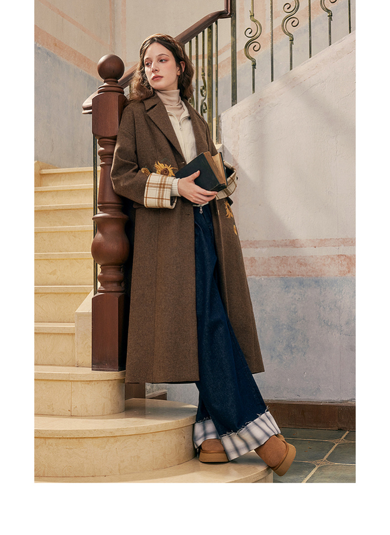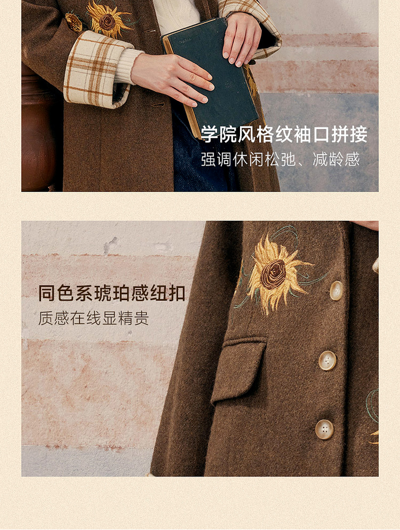 【暖冬内购】两三事梵高文艺秋叶依山2024冬季新款复古格子拼接绣花毛呢外套女