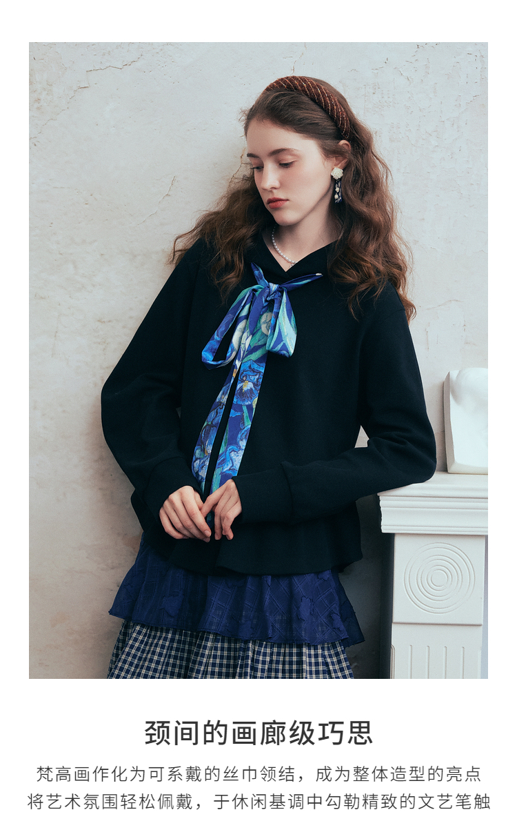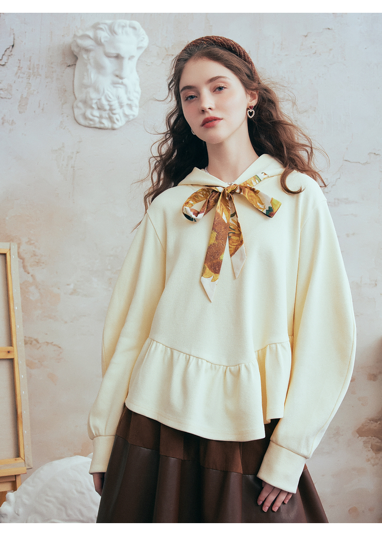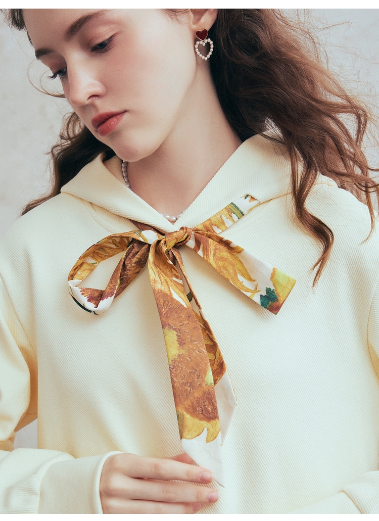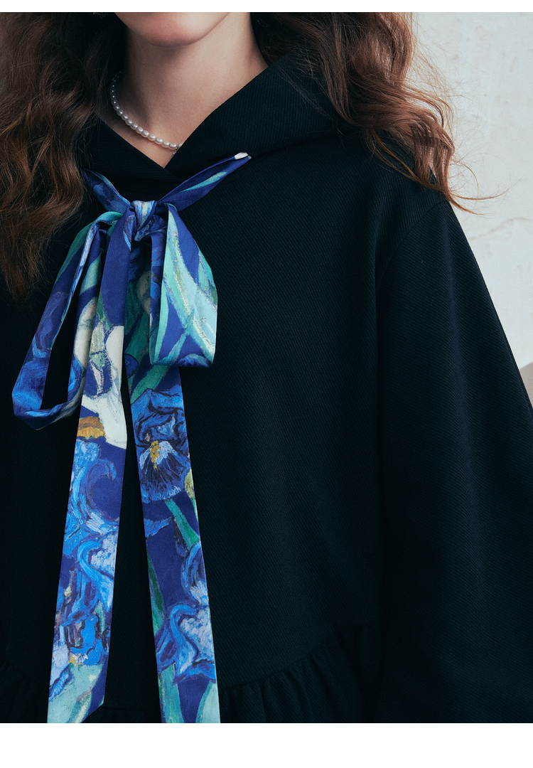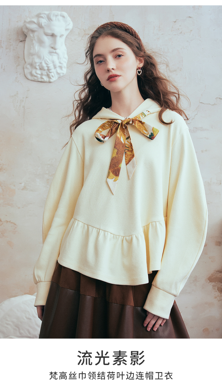 两三事梵高文艺 流光素影 2026春季新款印花绑带连帽卫衣女宽松