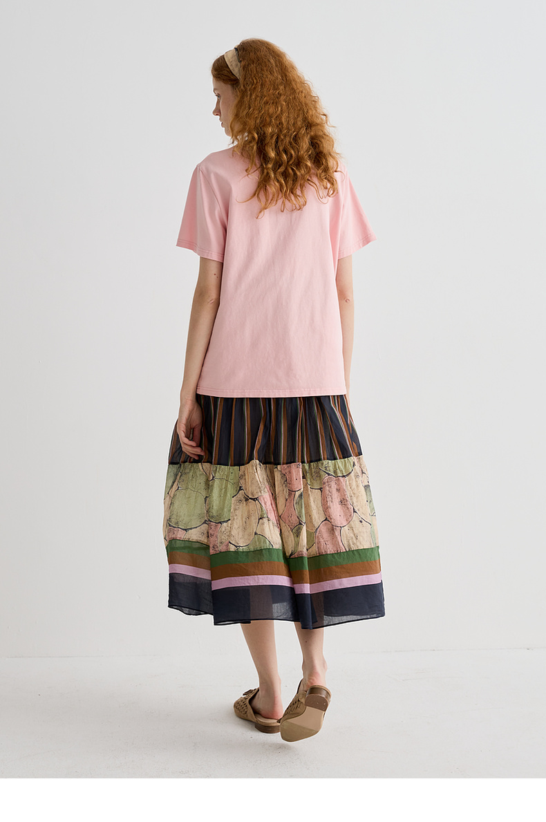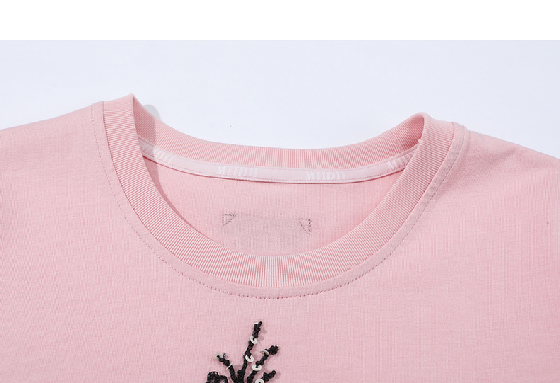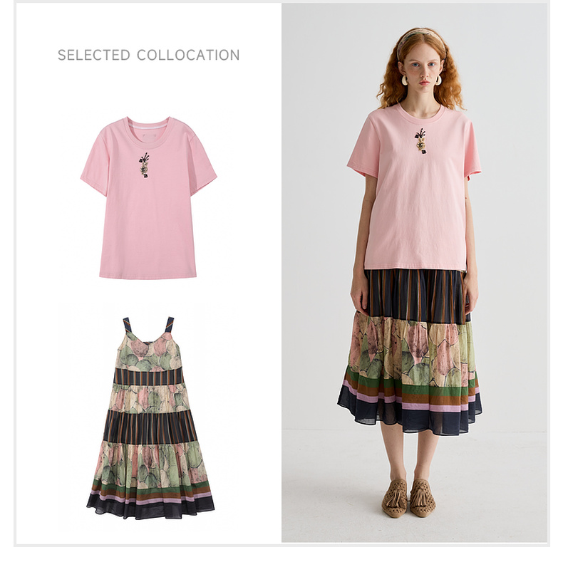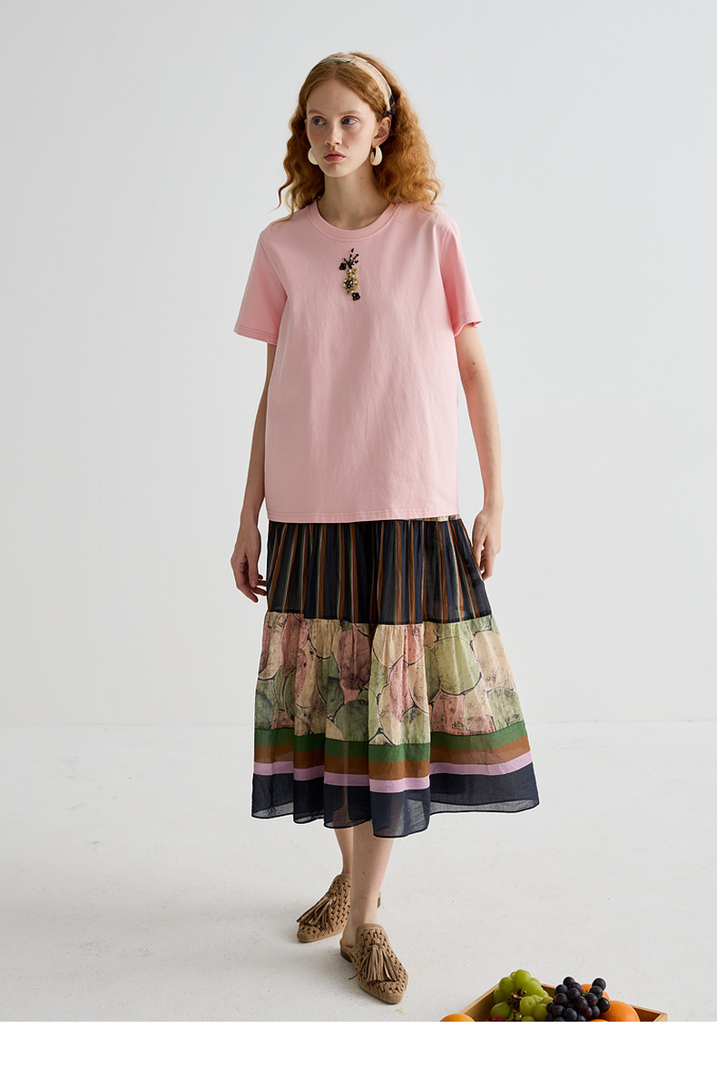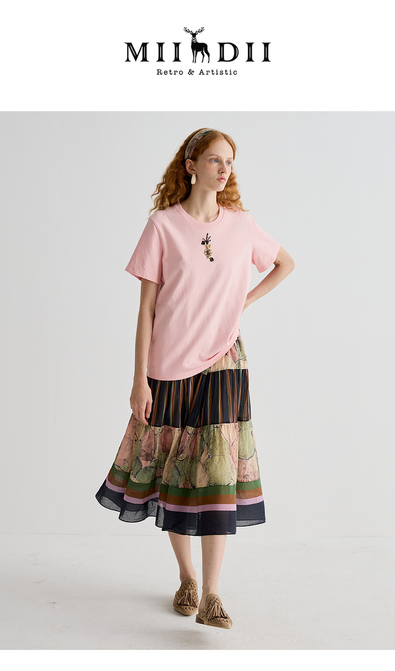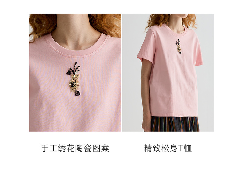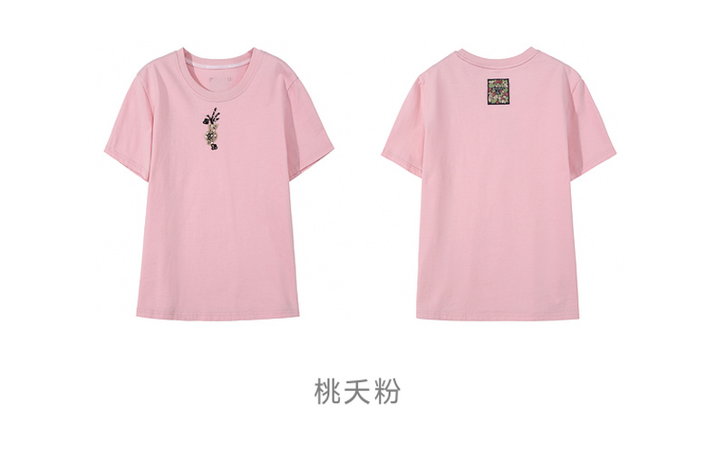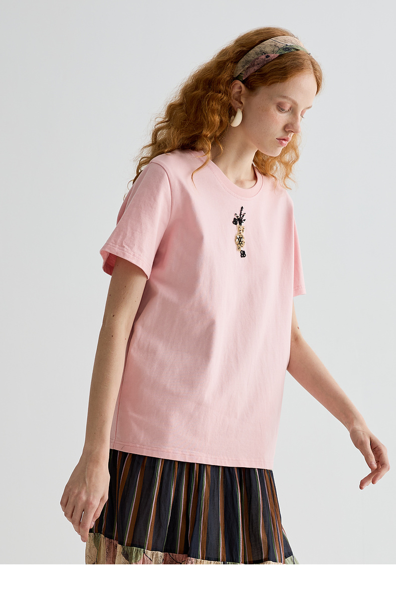 谜底T恤短袖女2025夏季新品休闲日常粉绣花宽松H型上衣252MT0587