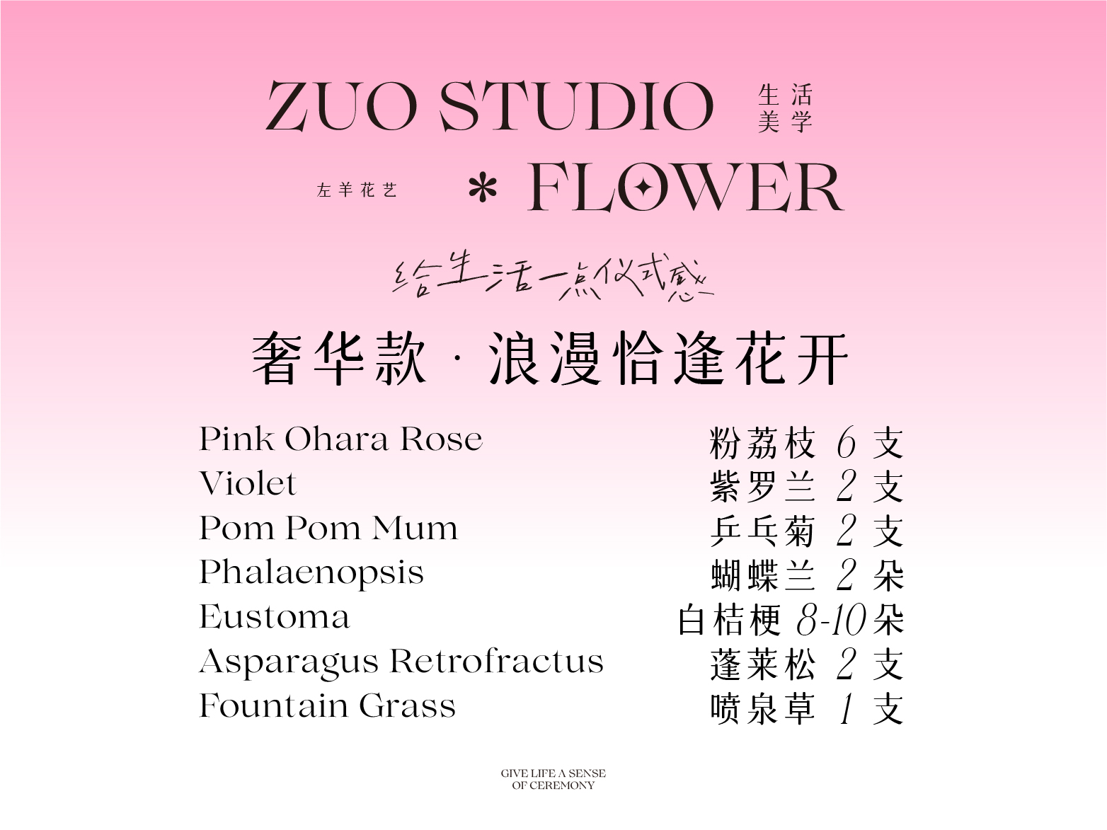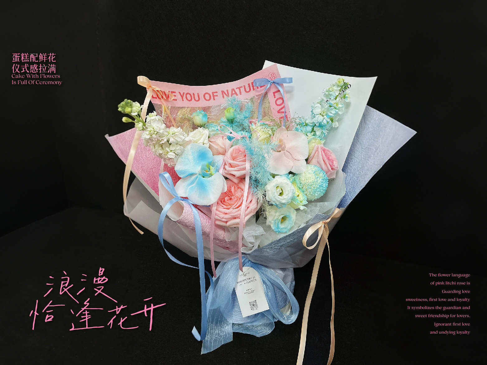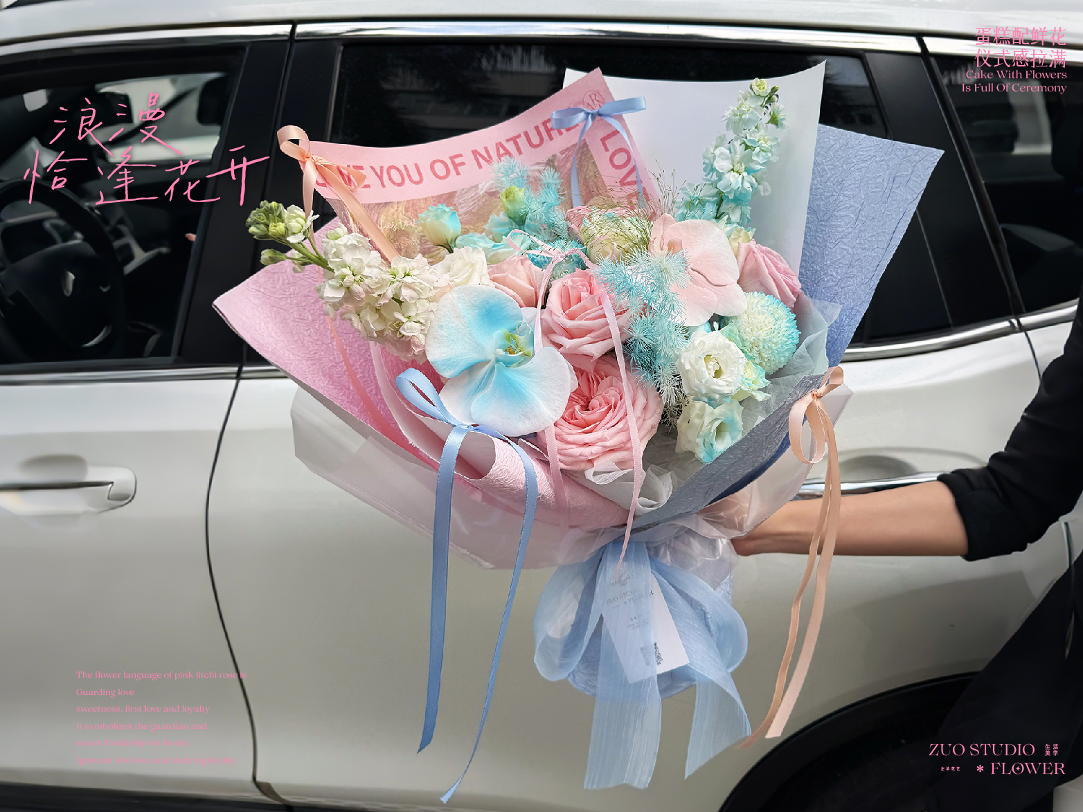 奢华款鲜花【浪漫恰逢花开】粉荔枝6支/紫罗兰2支/兵乓菊2支/蝴蝶兰2朵/白桔梗8-10朵/蓬莱松2支/喷泉草1支/氛围感鲜花/仪式感鲜花