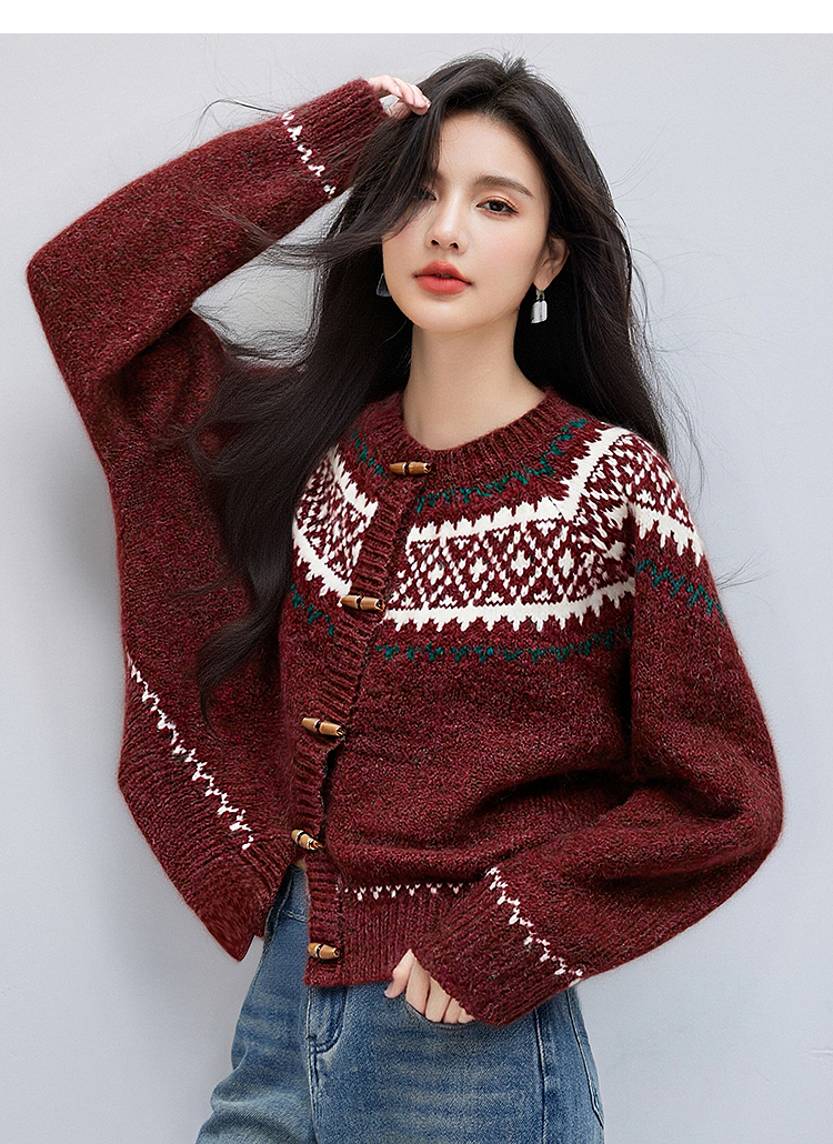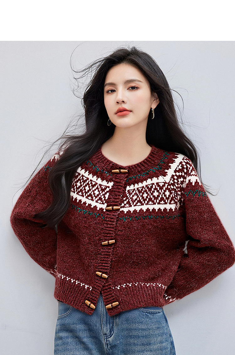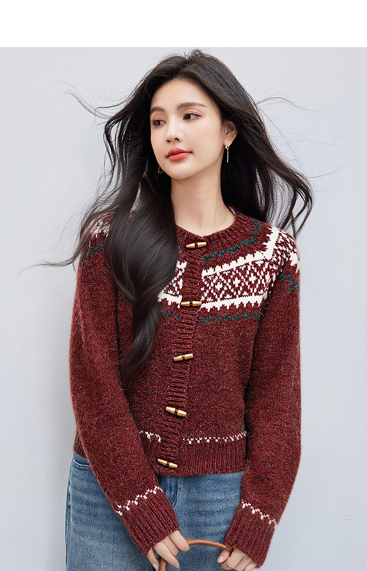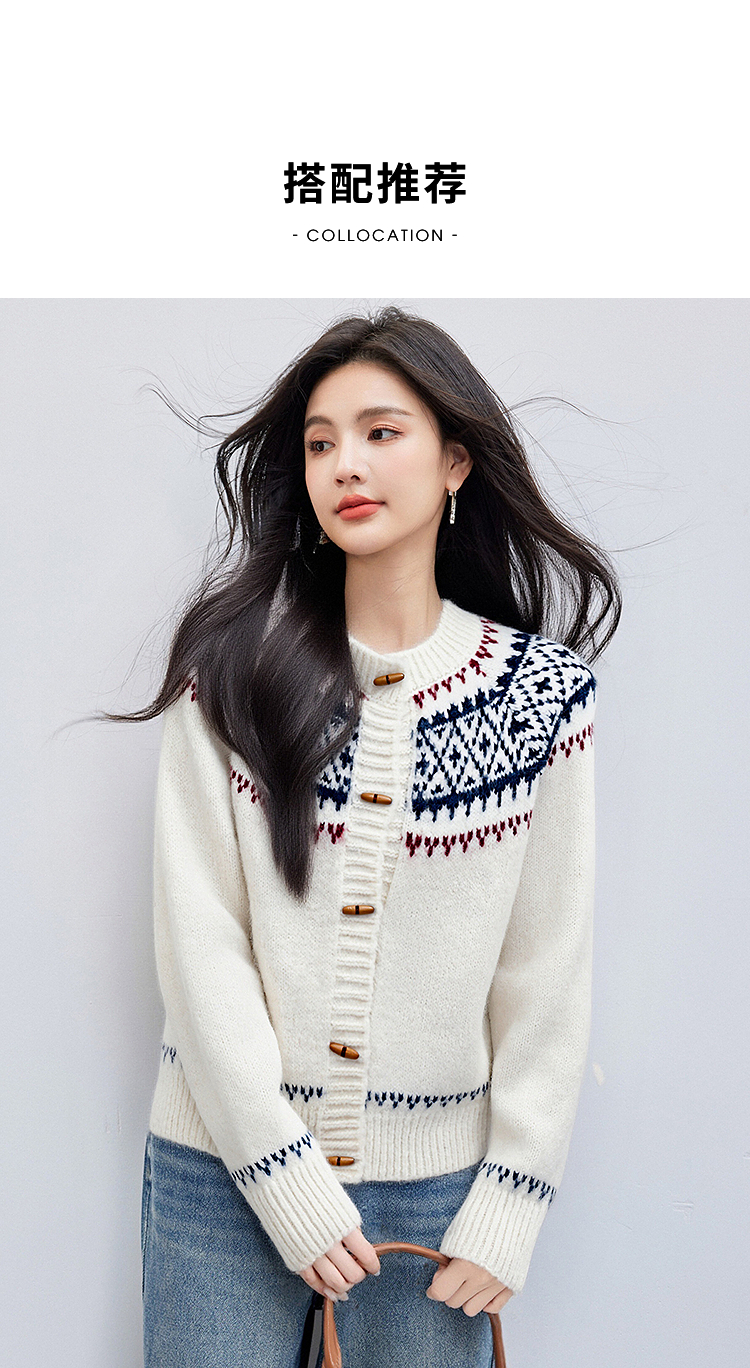 西遇氛围穿搭女2025冬季新款圆领短款保暖费尔岛毛衣开衫外套SS051891