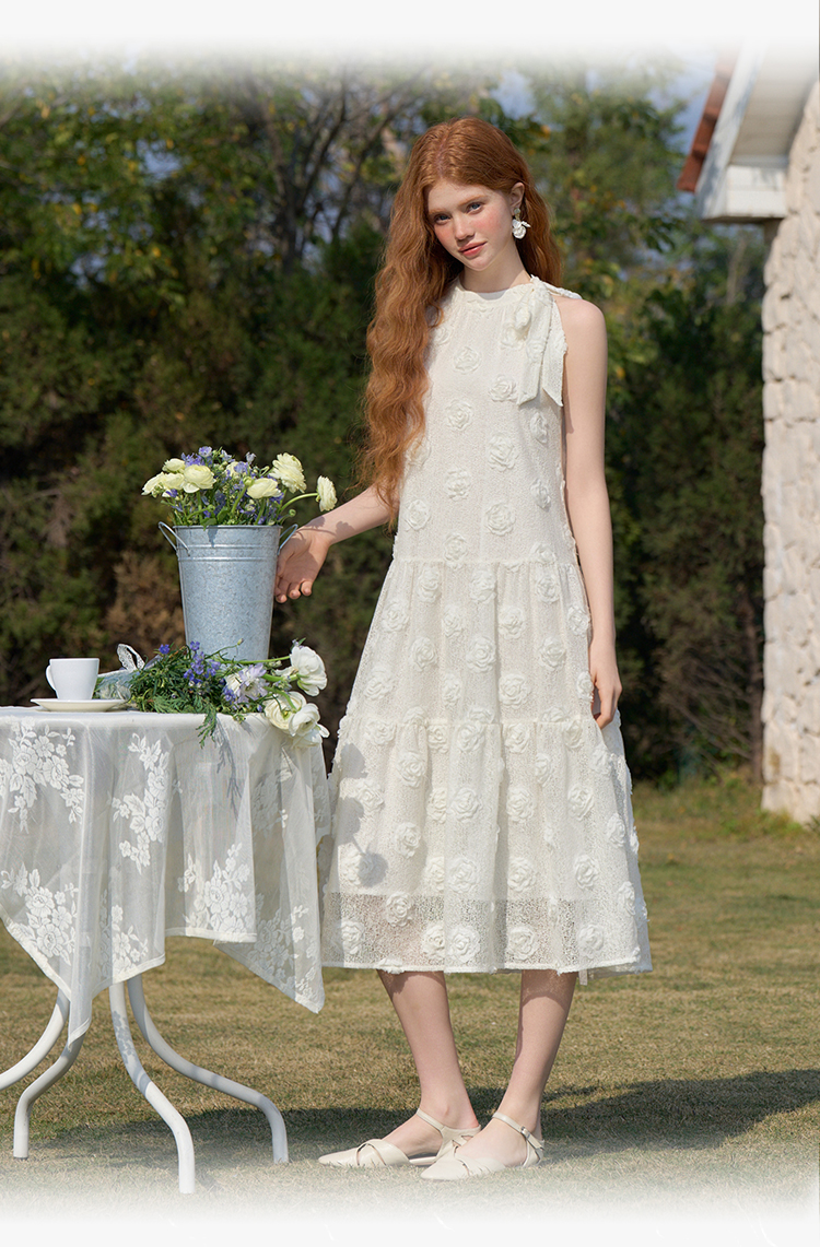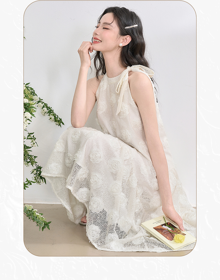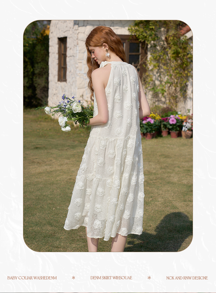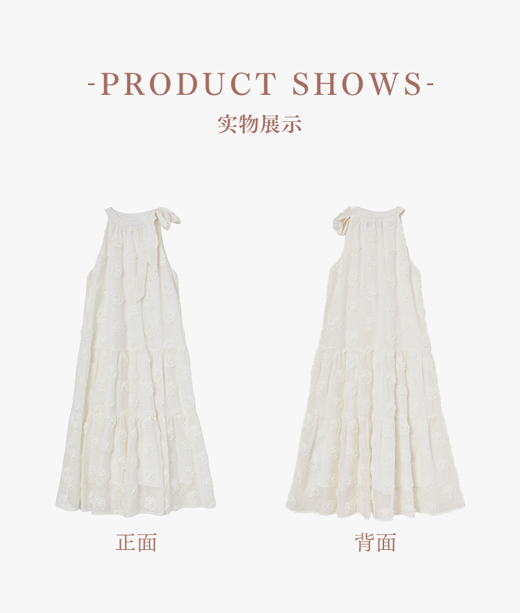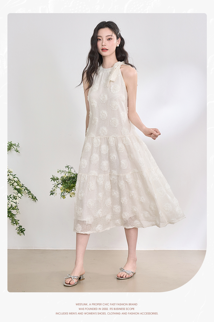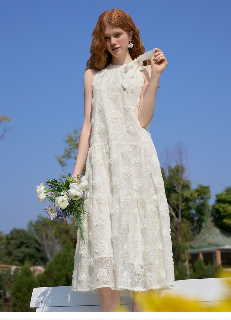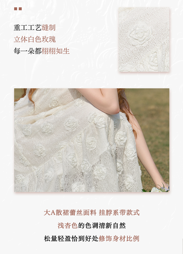 优雅重工满幅立体玫瑰连衣裙女挂脖露肩系带A字长裙V0550198
