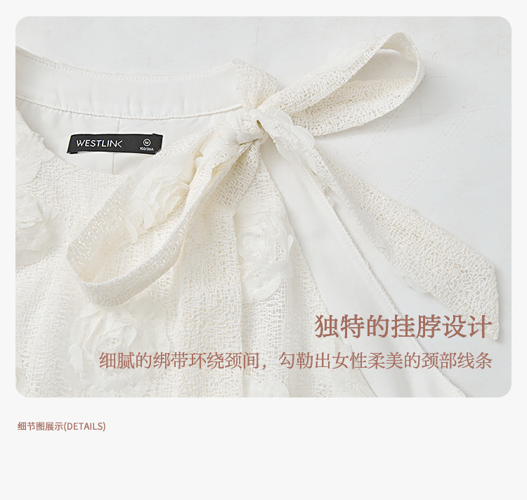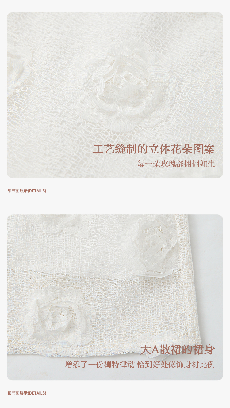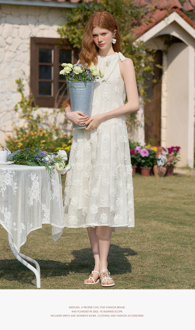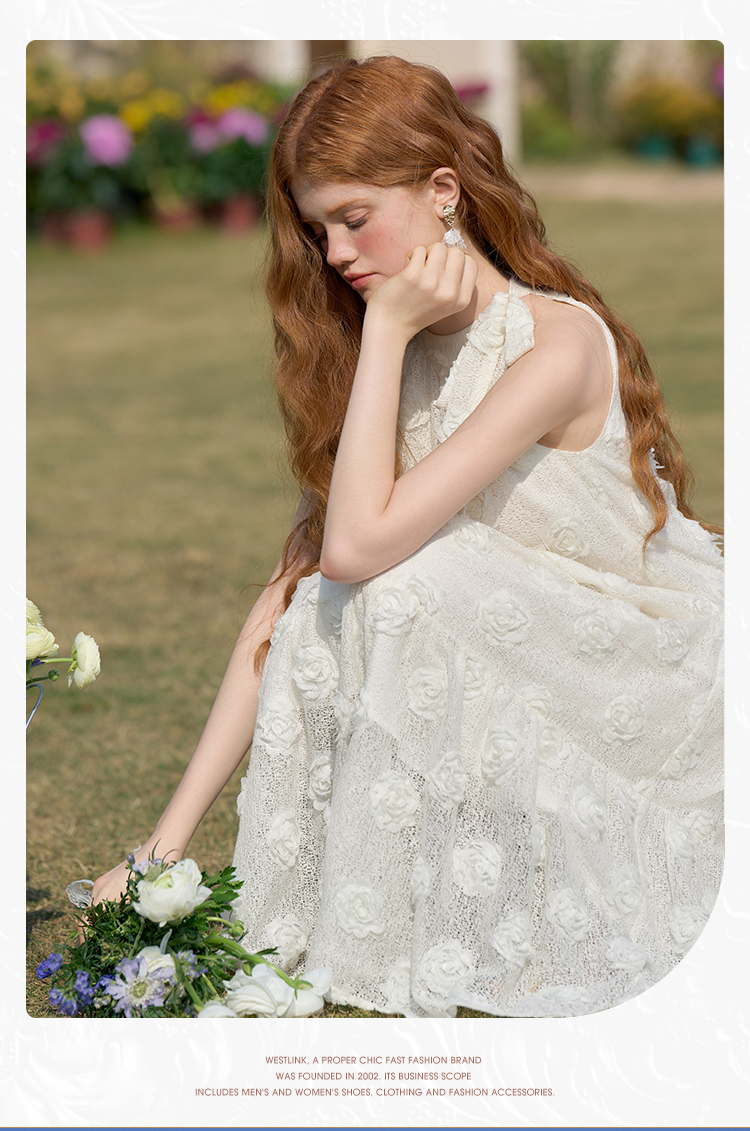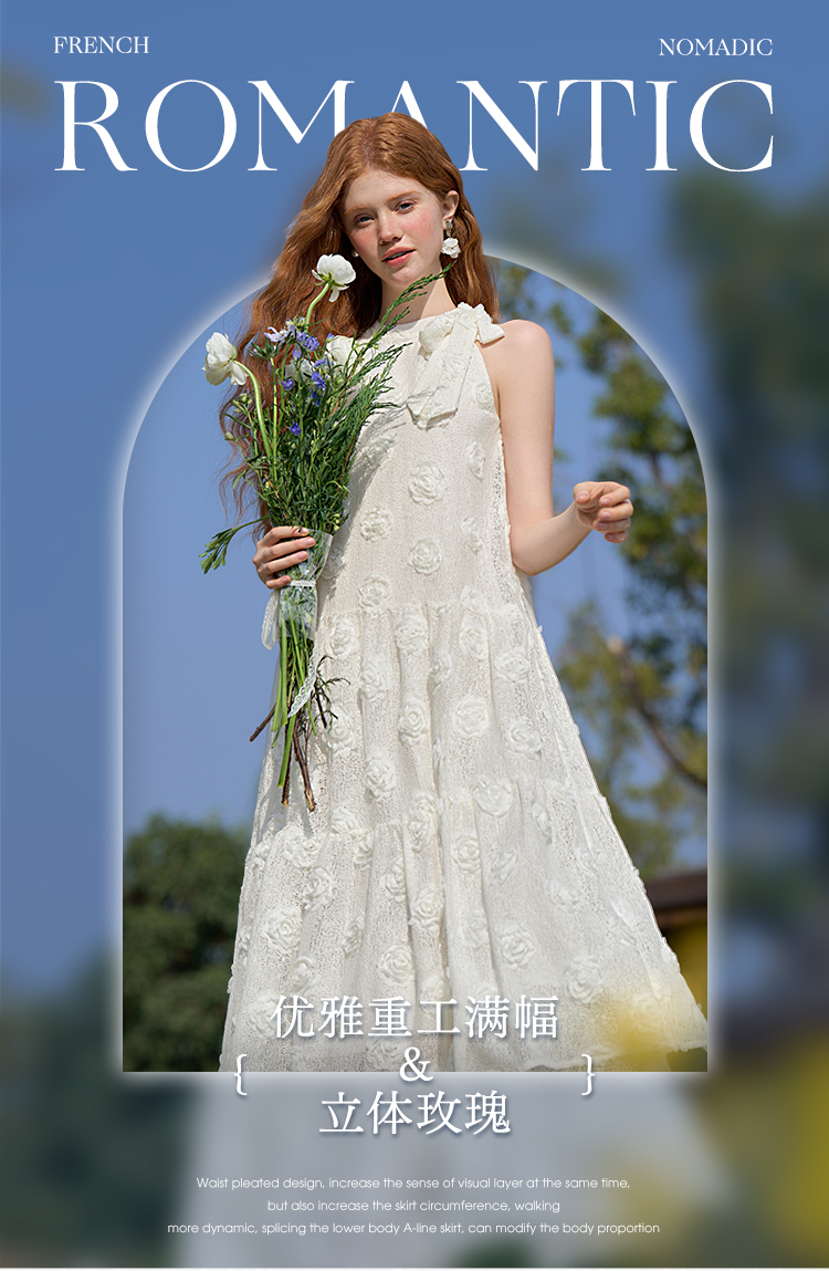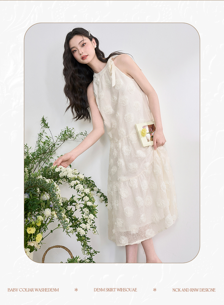 优雅重工满幅立体玫瑰连衣裙女挂脖露肩系带A字长裙V0550198