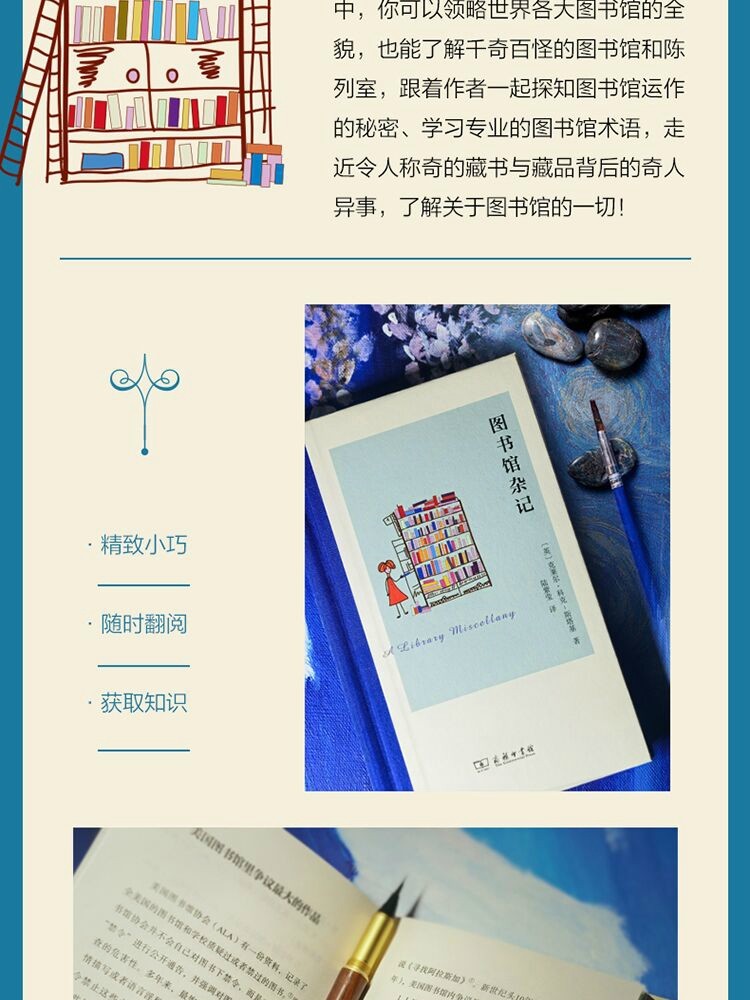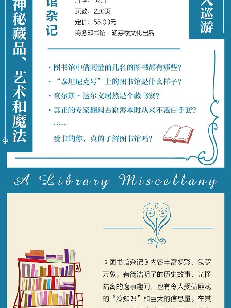 《图书馆杂记》内容丰富多彩、包罗万象,有简洁明了的历史故事、光怪陆离的逸事趣闻,也有令人受益匪浅的“冷知识”和巨大的信息量。在其中,你可以领略世界各大图书馆的全貌,也能了解千奇百怪的图书馆和陈列室,跟着作者一起探知图书馆运作的秘密、学习专业的图书馆术语,走近令人称奇的藏书与藏品背后的奇人异事,了解关于图书馆的一切!