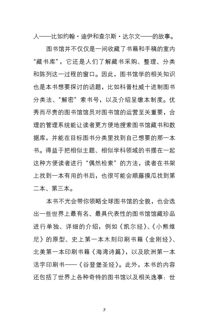 《图书馆杂记》带我们了解不一样的图书馆。本书不光是带你领略全球图书馆的全貌,也会选出一些世界上有名、具有代表性的图书馆馆藏珍品和工作细节进行单独、详细的介绍。此外,本书的内容还包括了世界上各种奇特的图书馆以及相关逸事。在其中,你可以领略世界各大图书馆的全貌,也能了解千奇百怪的图书馆和陈列室,跟着作者一起探知图书馆运作的秘密、学习专业的图书馆术语,走近令人称奇的藏书与藏品背后的奇人异事,了解关于图书馆的一切!