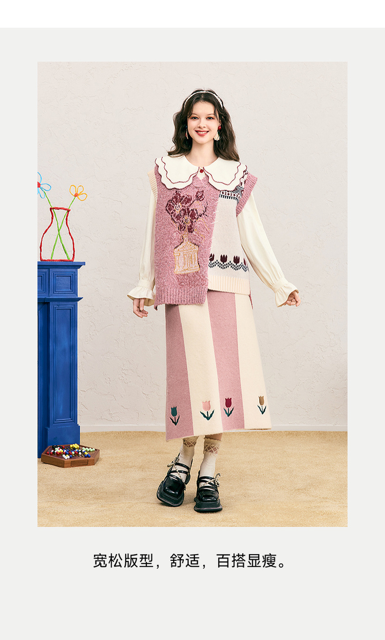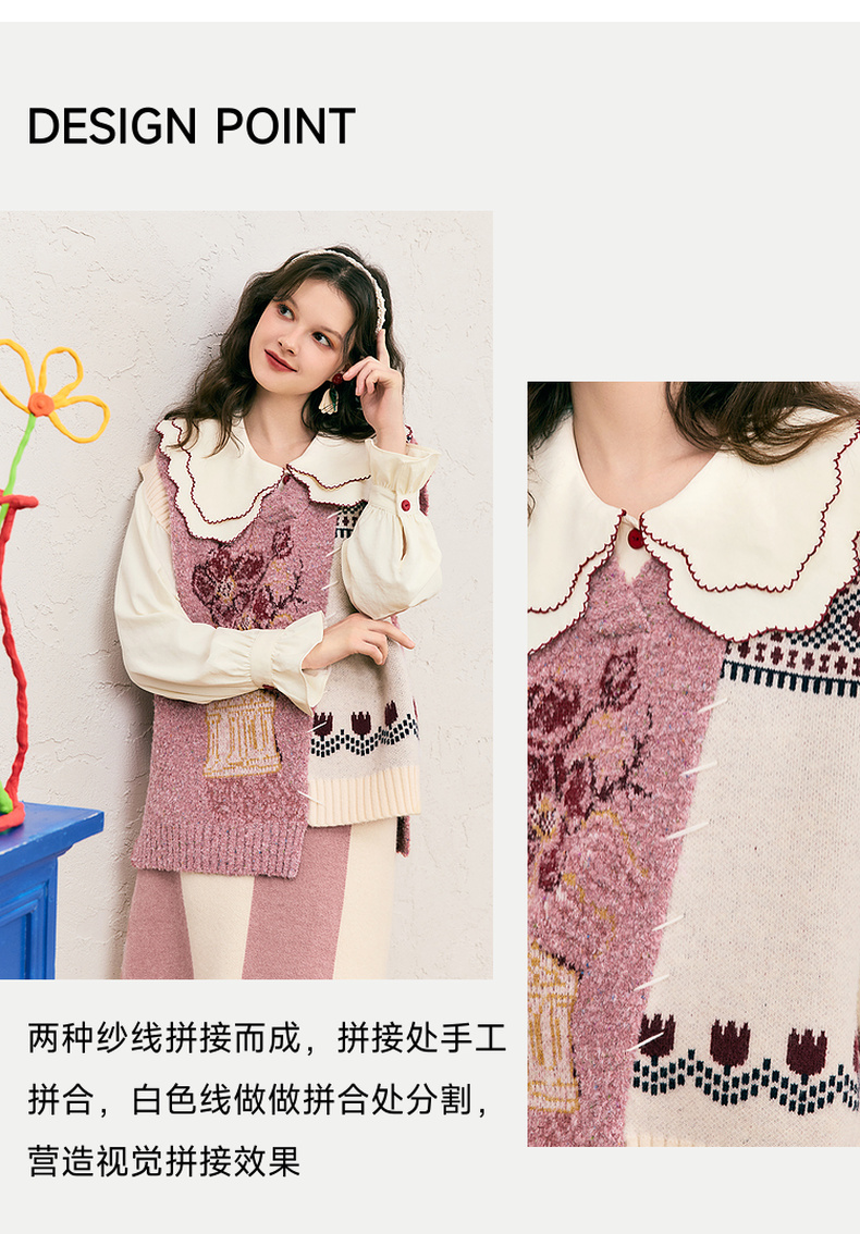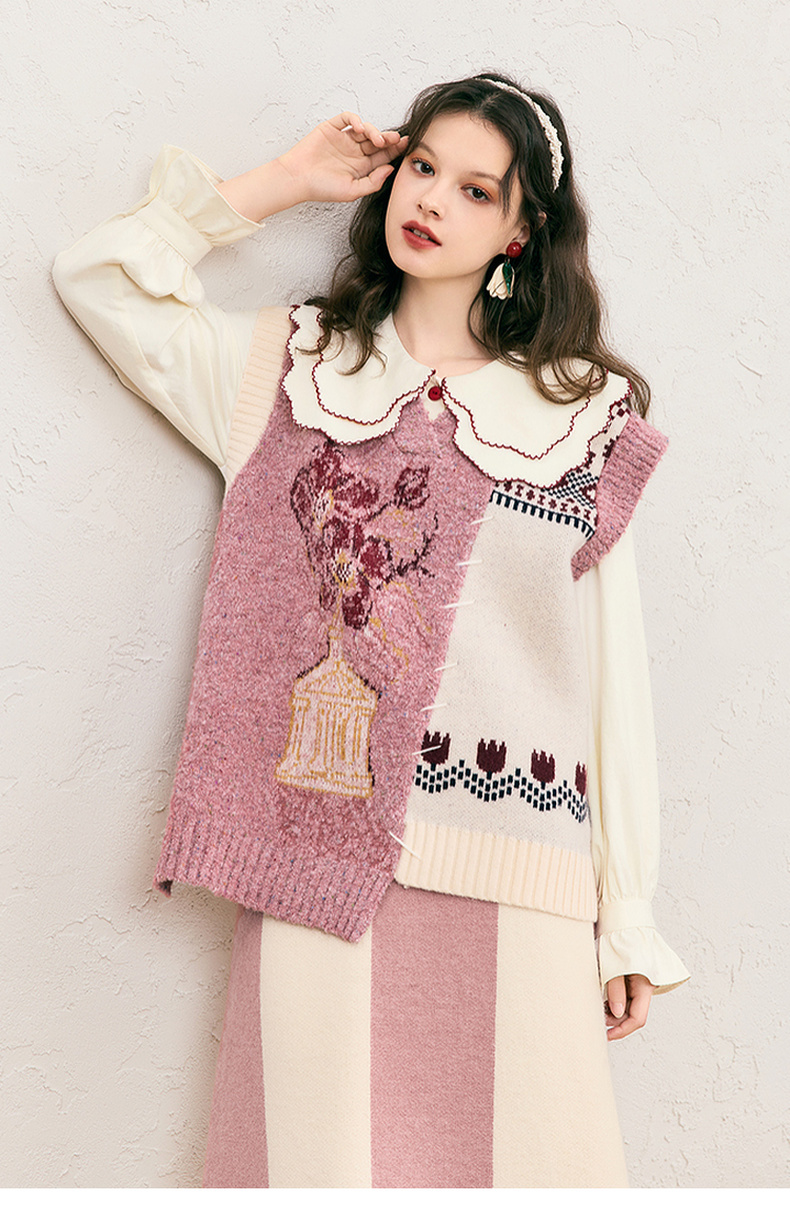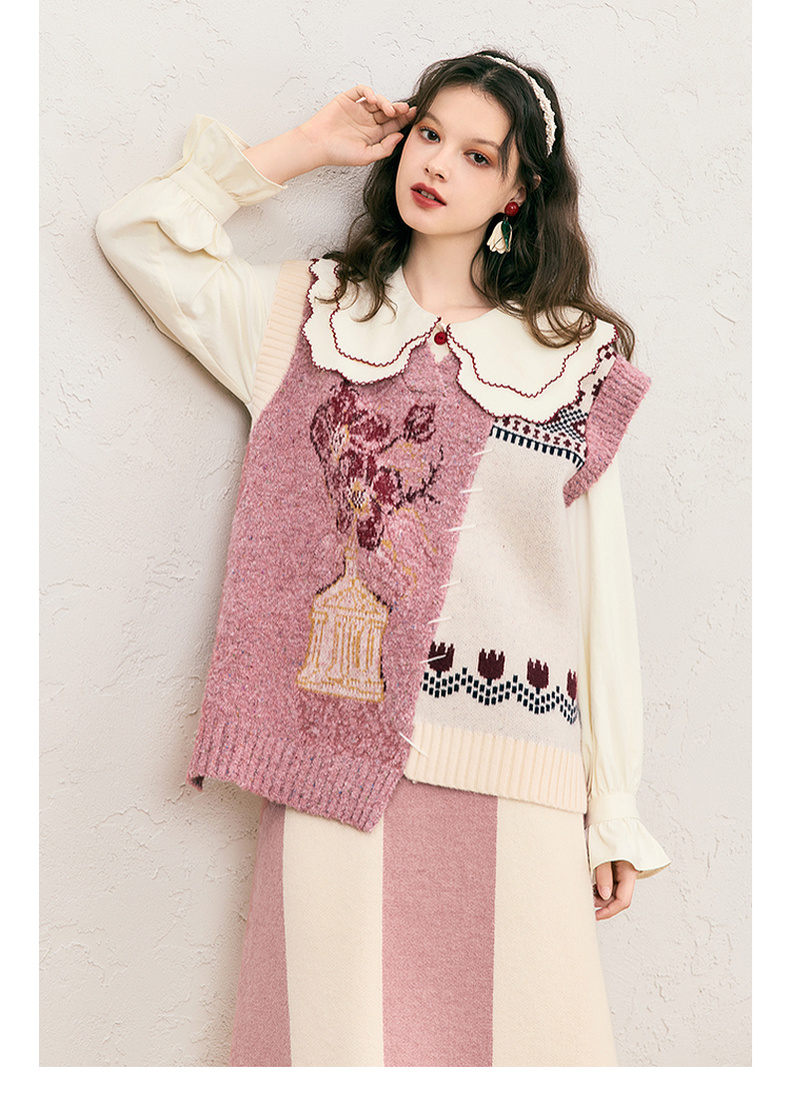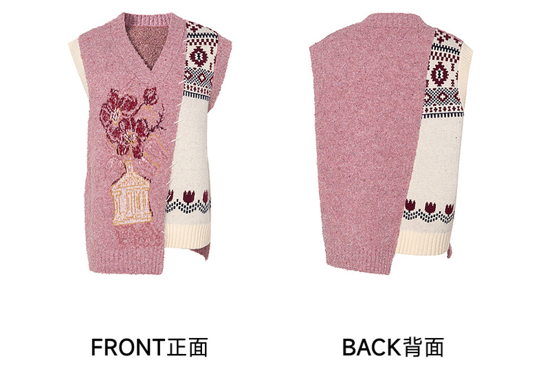 两三事 自由花束 2024冬季新款复古提花拼色不对称下摆无袖毛衣女
