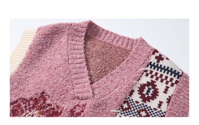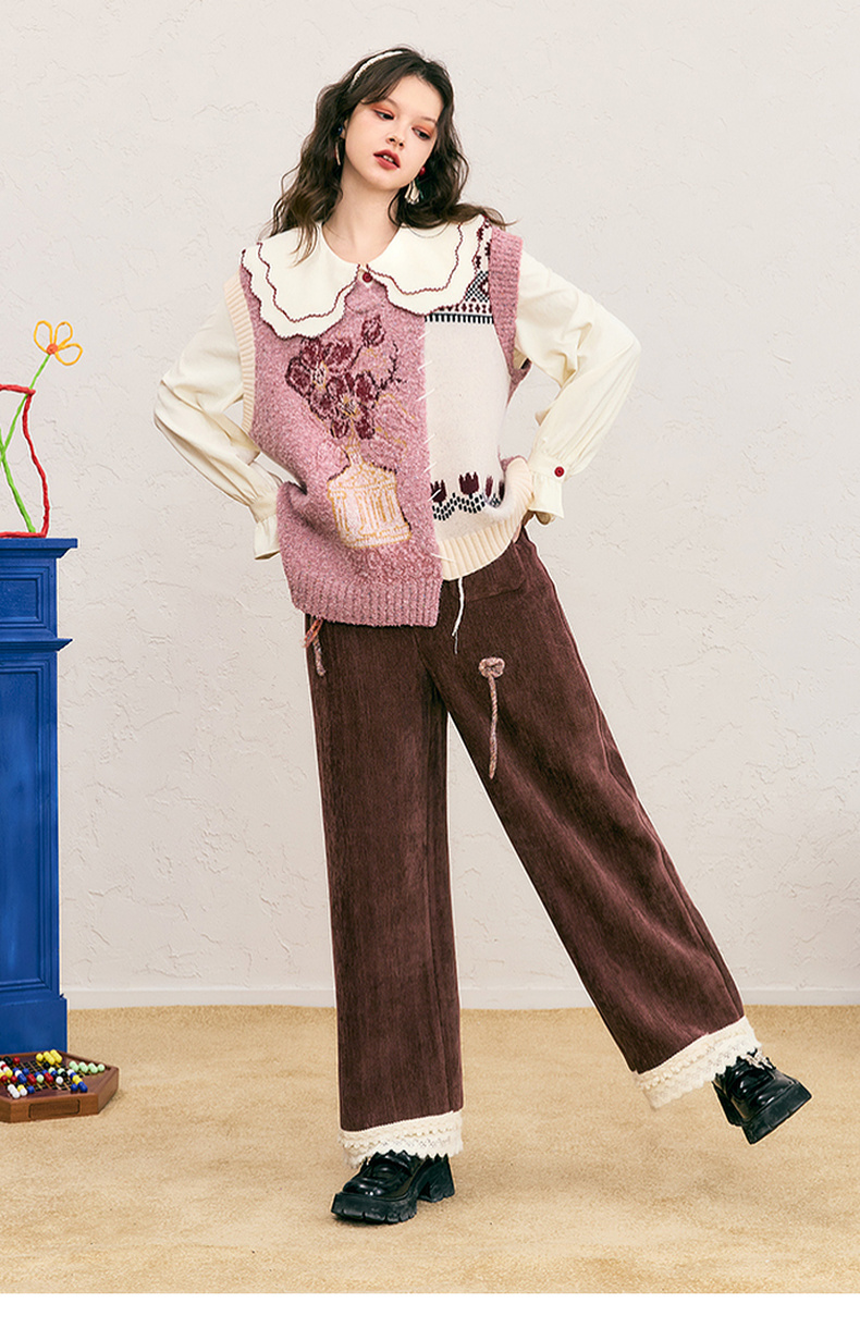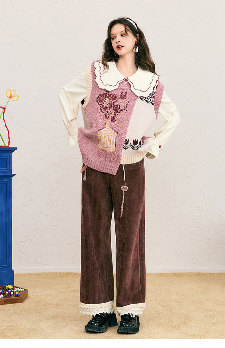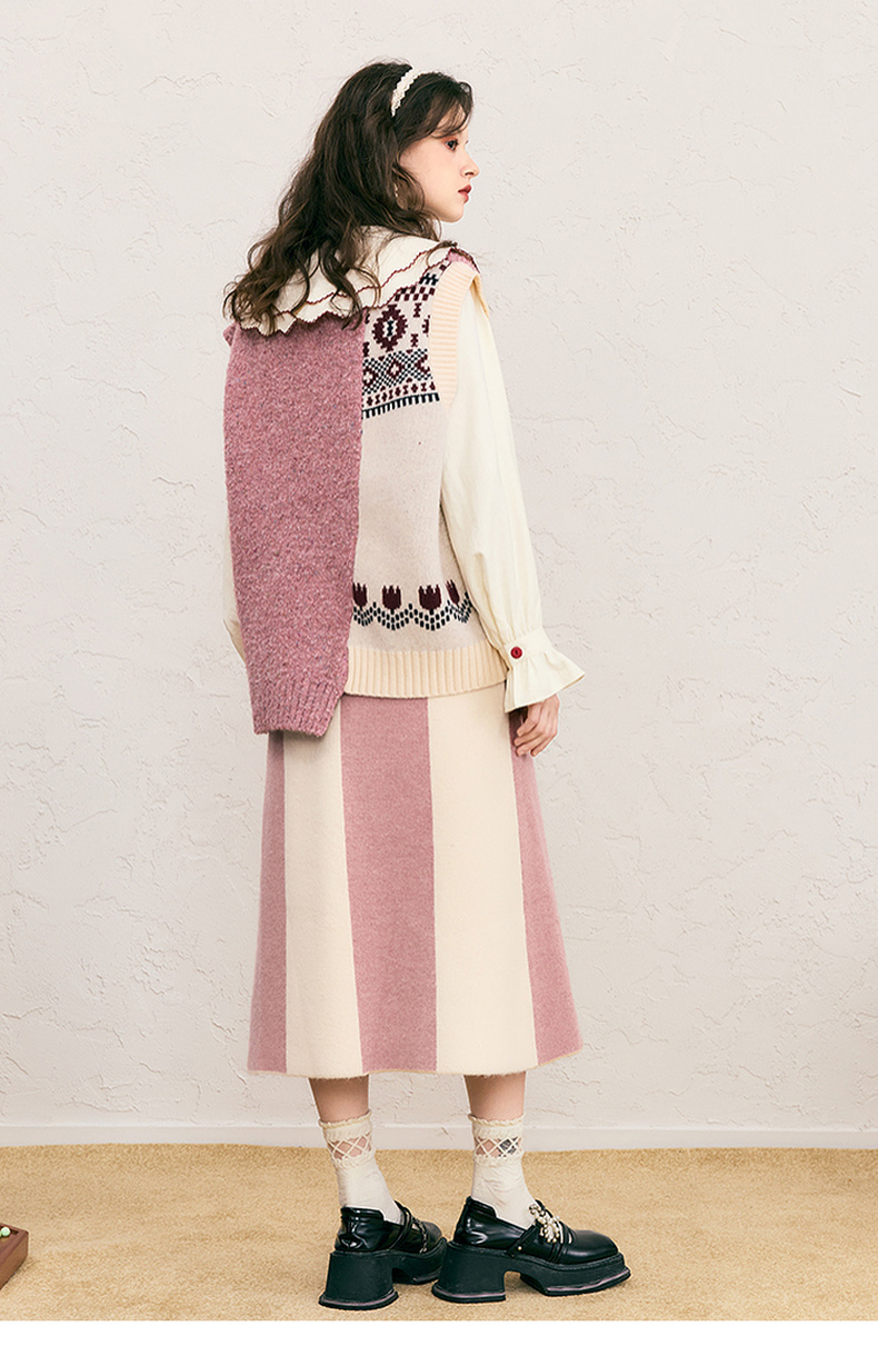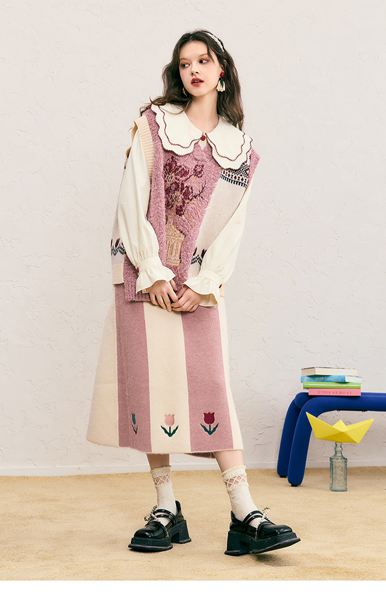 两三事 自由花束 2024冬季新款复古提花拼色不对称下摆无袖毛衣女