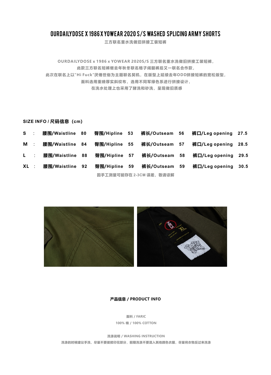 OURDAILYDOSE 20SS 原创宽松水洗做旧拼接工装短裤 五分休闲裤