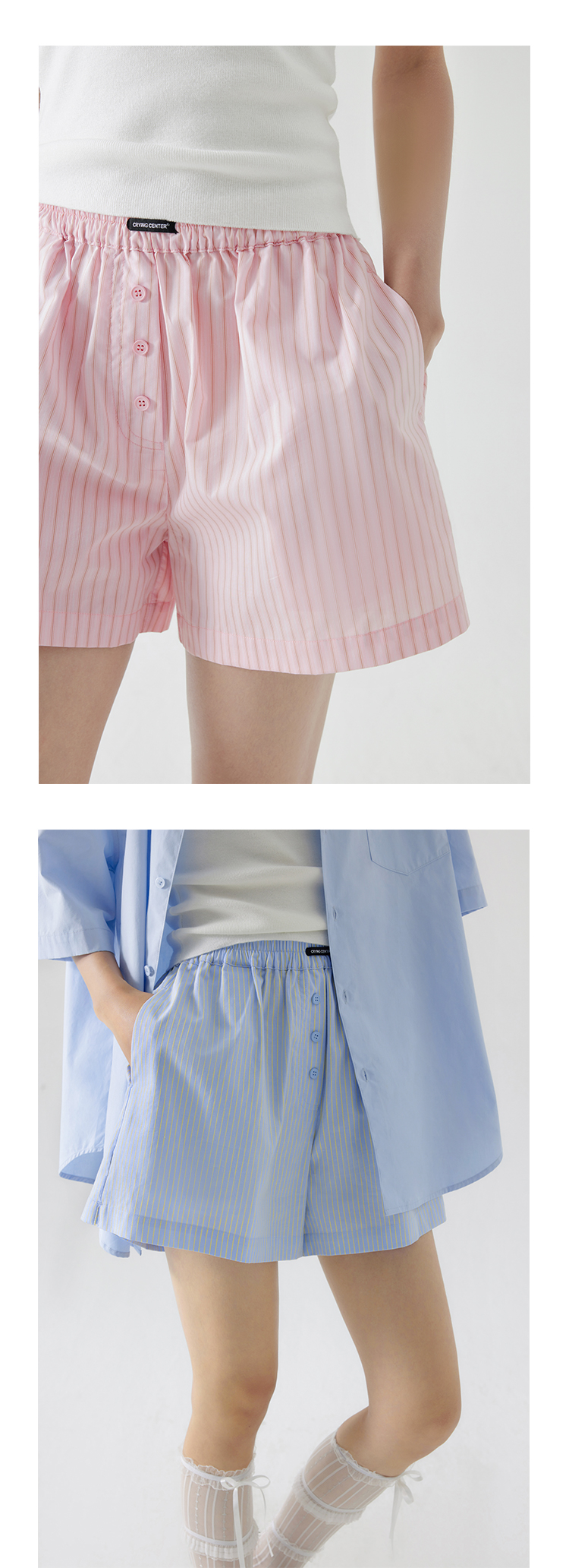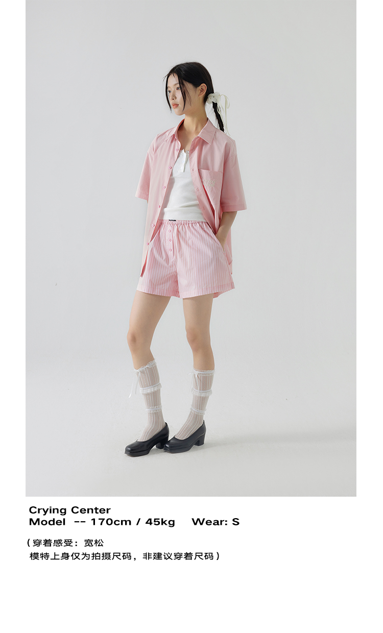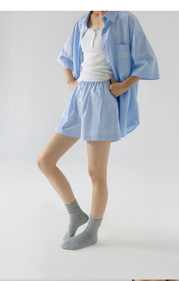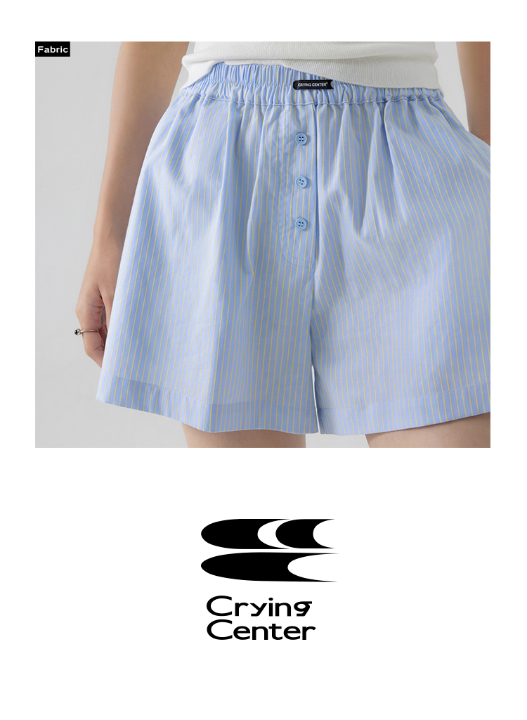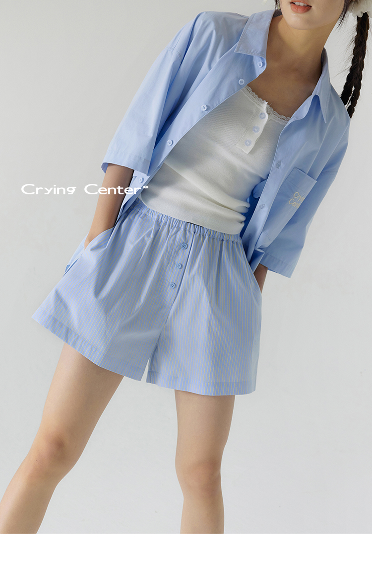 CryingCenter 樱花粉海盐蓝条纹阿罗裤橡筋腰休闲短裤 哭喊中心