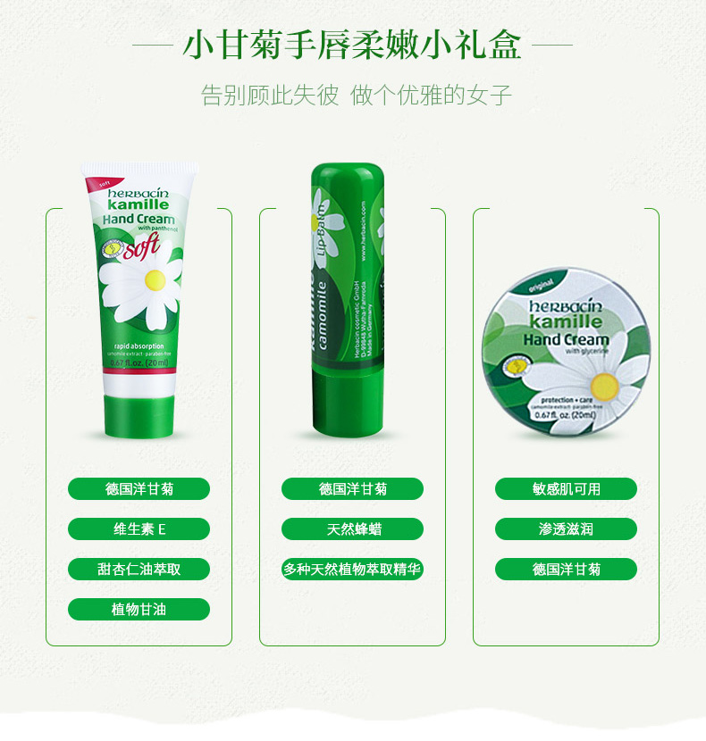 HERBACIN好本清 小甘菊纪念礼盒-A套装送礼新年礼物(新经典护手霜20ml+润甲护手霜20ml+修护唇膏4.8g)