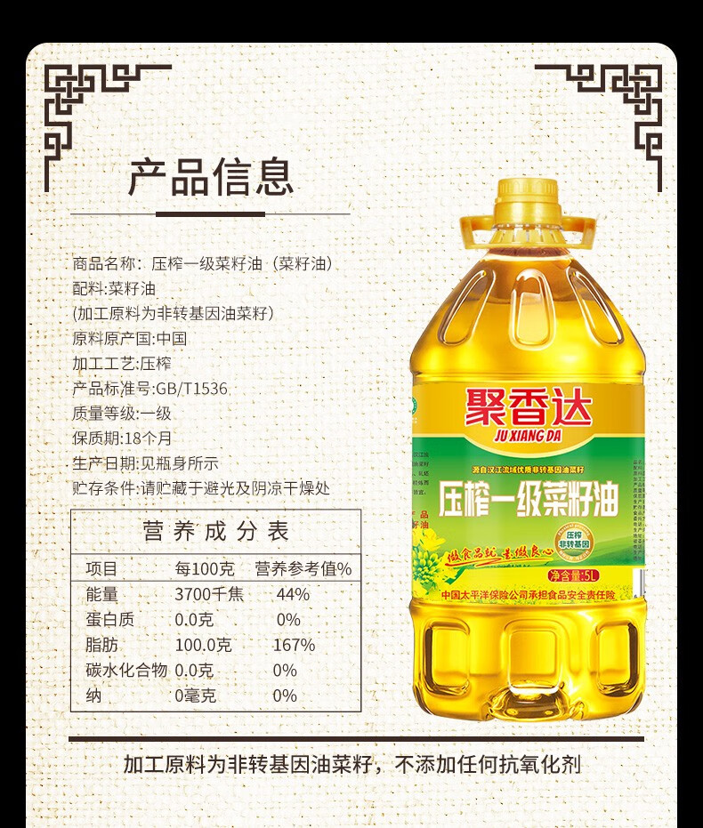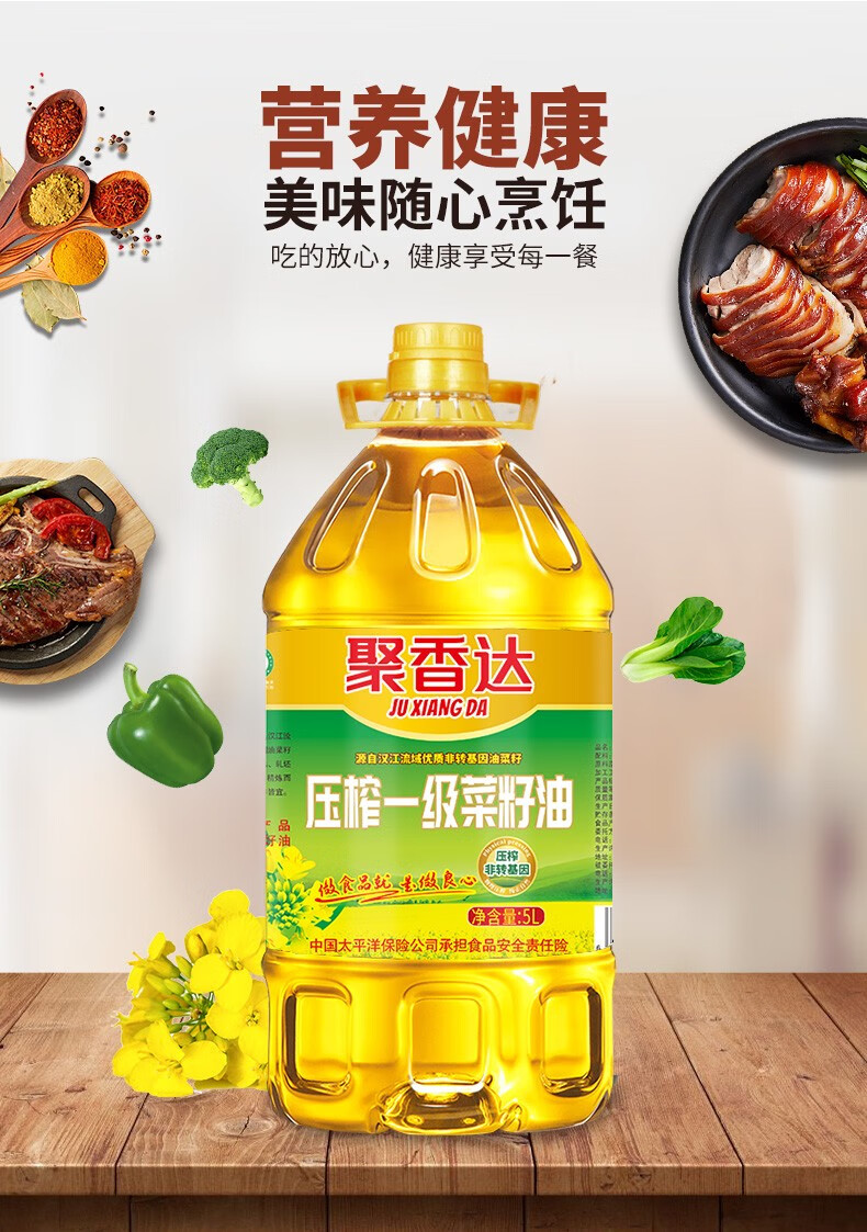 聚香达 压榨一级菜籽油5L