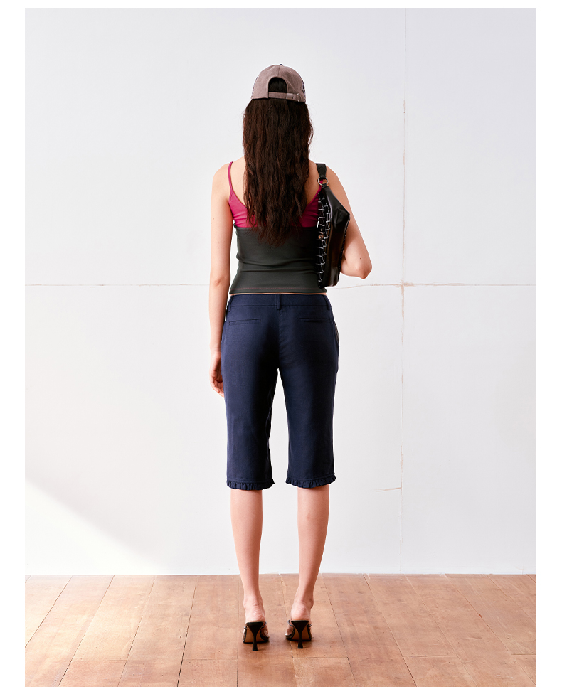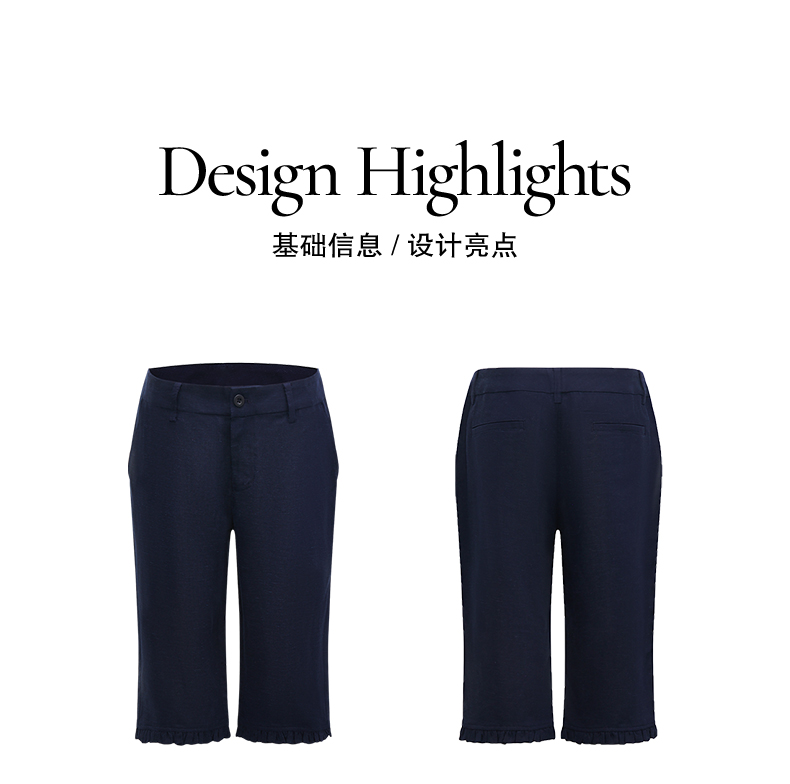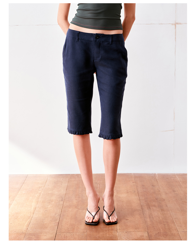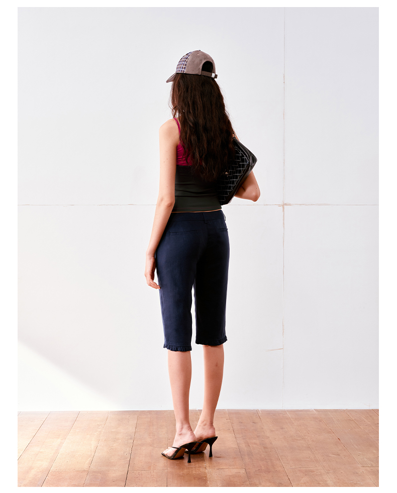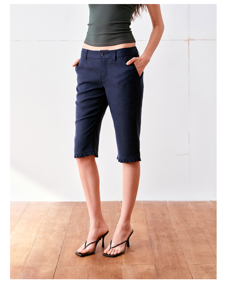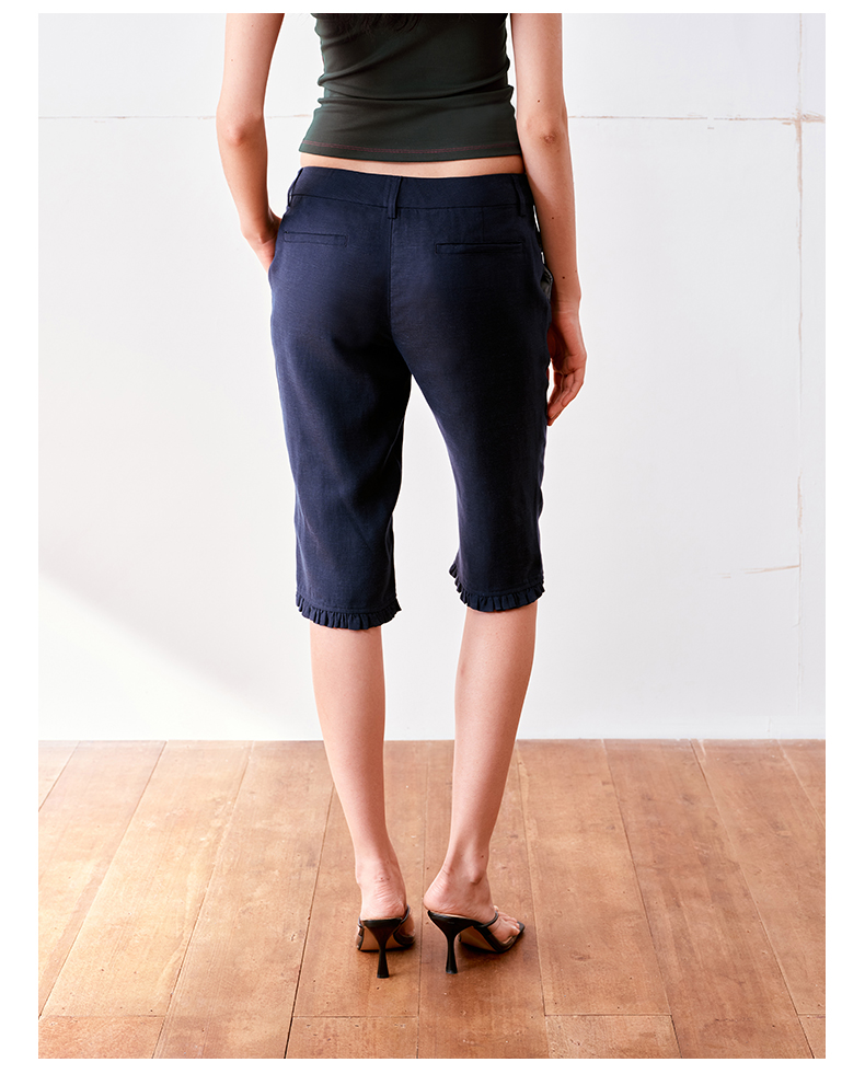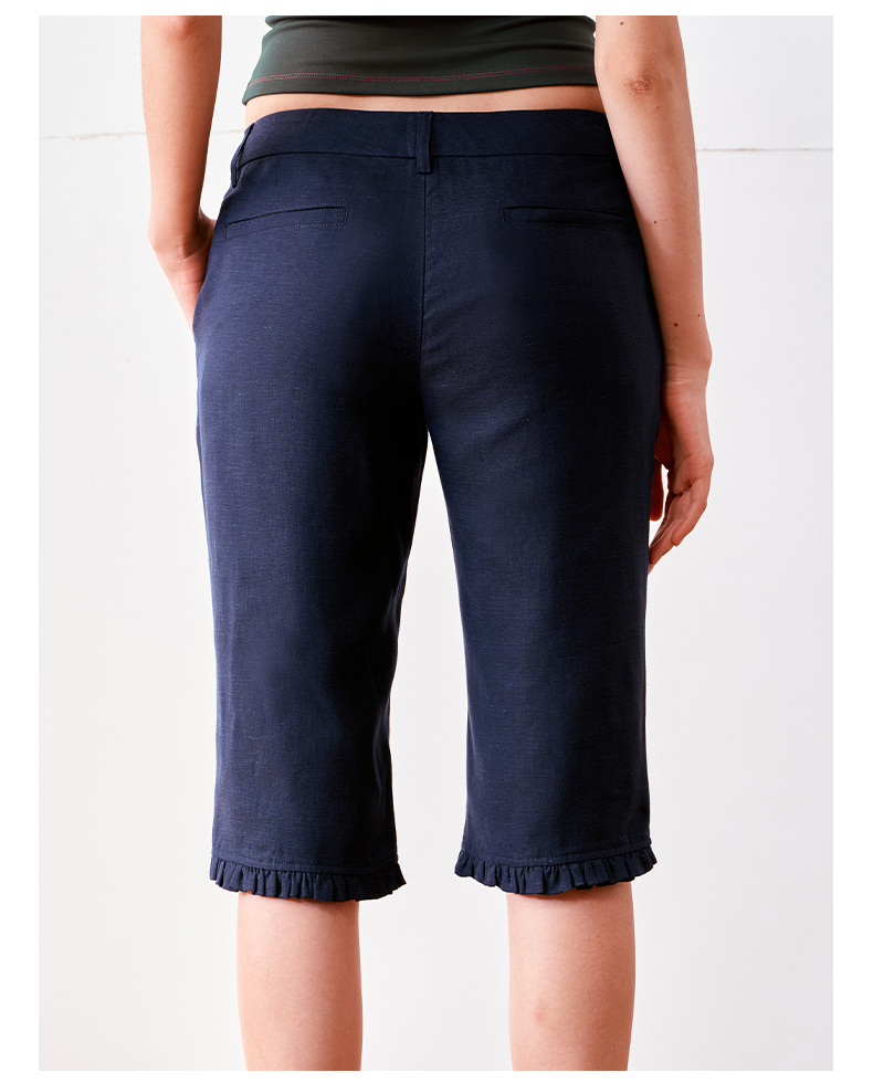 NUTH亚麻低腰修身花边卡普里藏蓝五分休闲裤