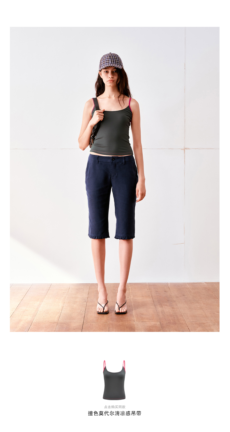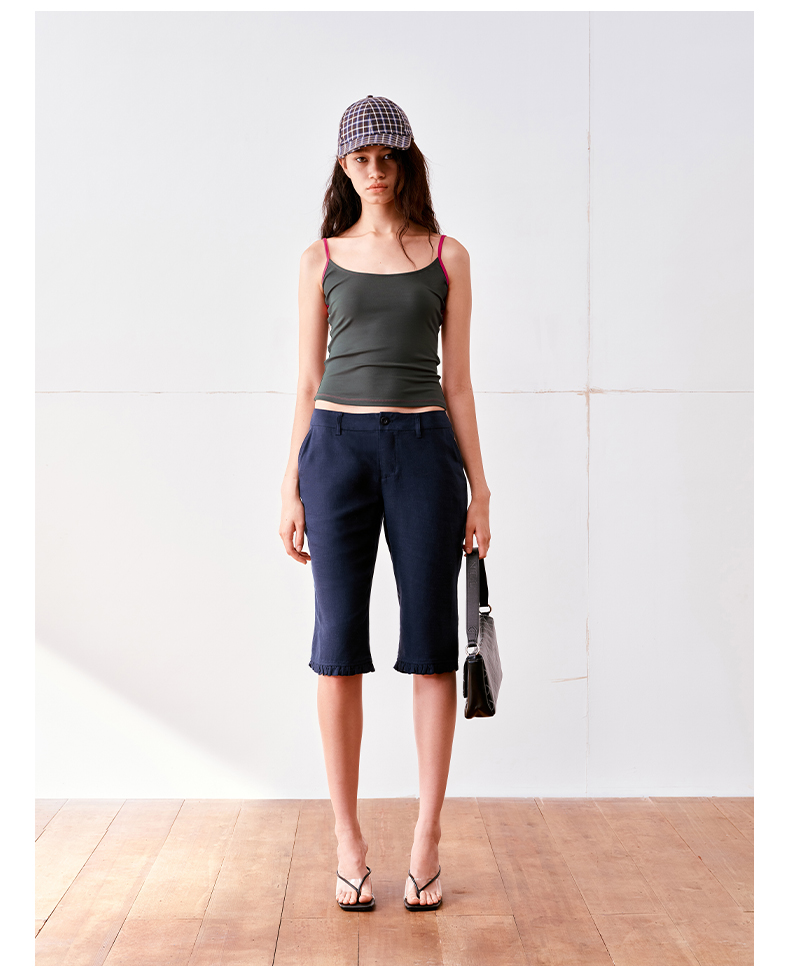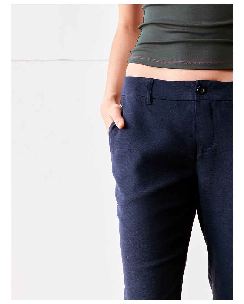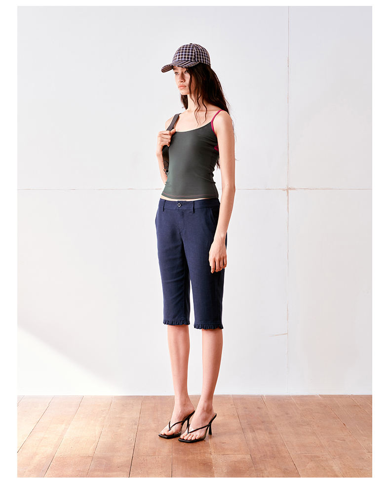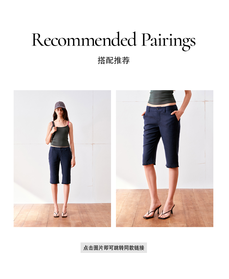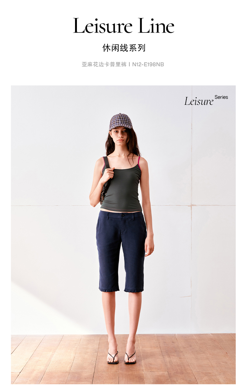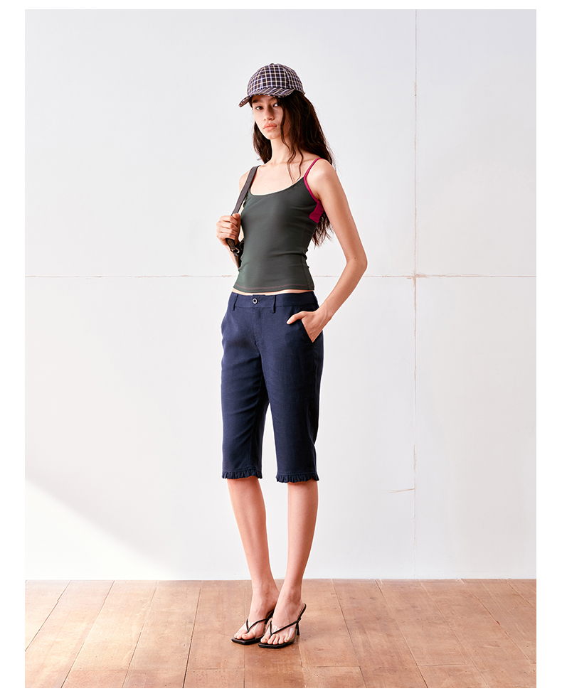 NUTH亚麻低腰修身花边卡普里藏蓝五分休闲裤