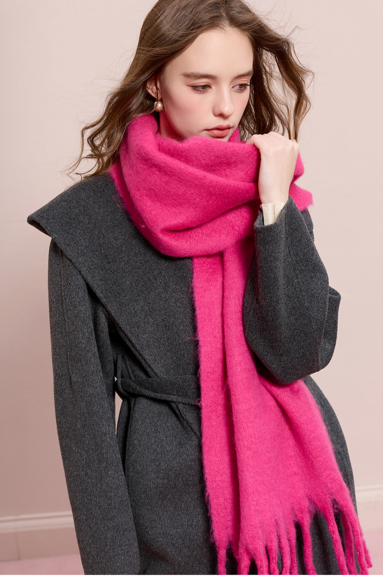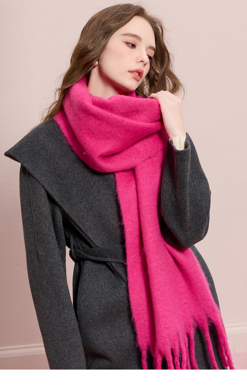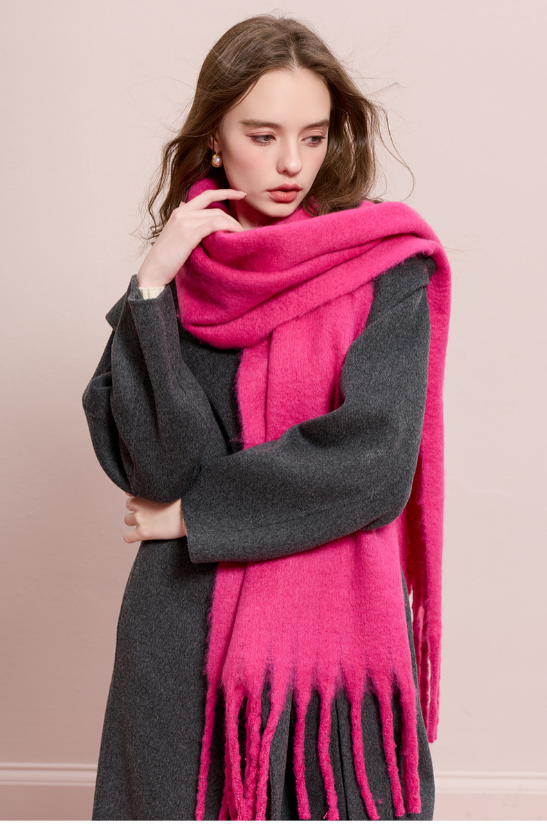 【臻暖围巾】三彩2025新款纯色玫红绒感流苏拉毛保暖围脖松弛女