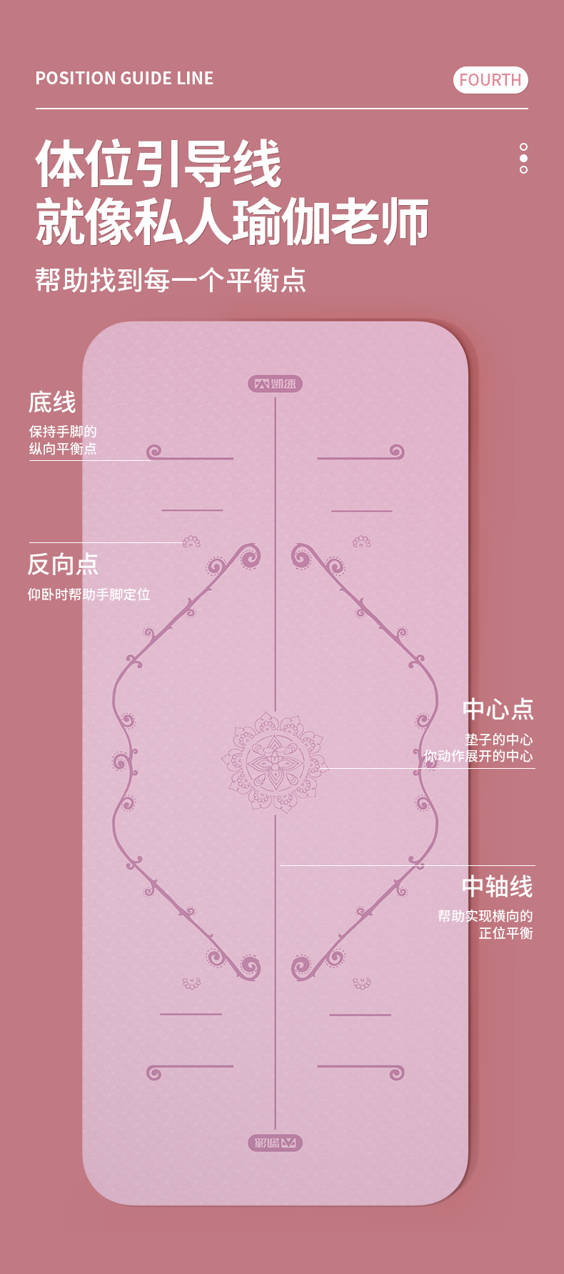 产品卖点: 1.加宽至80cm,更大接触面,练习不出界。 2.全新设计的体位线图案,更加平稳准确的运动,减少损伤。 3.正反两面纹路设计,防滑防水,容易擦除汗渍和污渍。 4.采用环保级TPE材质,双拼色设计,用的更加放心。 5.厚0.6cm,厚度适中,减震回弹,耐磨耐撕防变形。 什么是体位线瑜伽垫? 体位线瑜伽垫就是在瑜伽垫原有的基础上增加上一些基础的体位线的垫子。现在市面上常见的瑜伽垫的体位线由:底线、中心线、中心点、45度线、反向点组成。