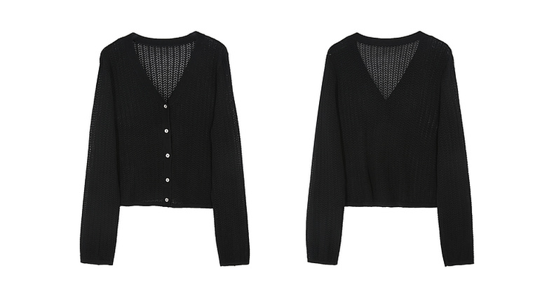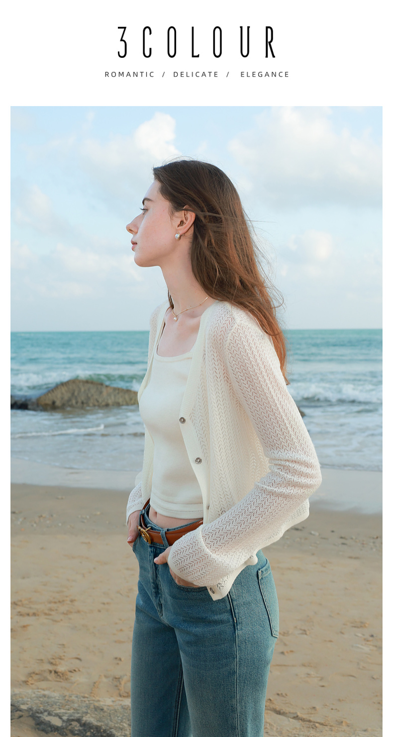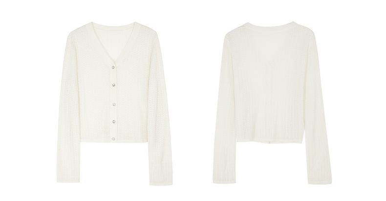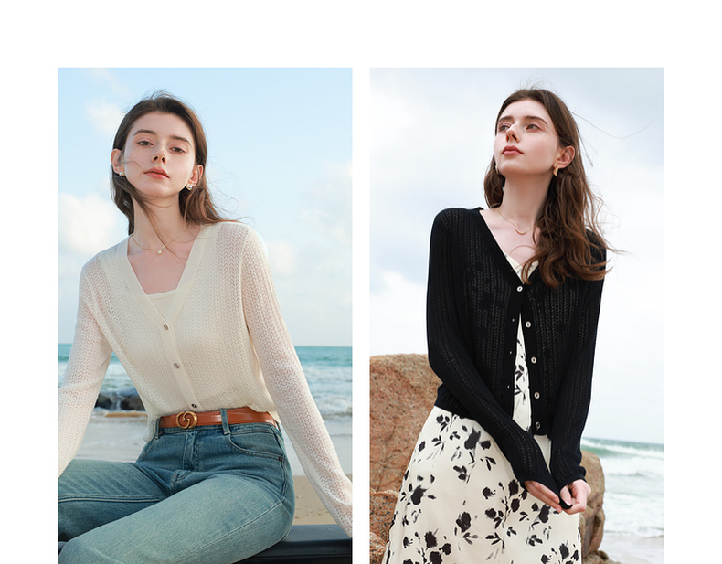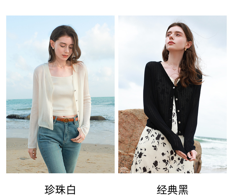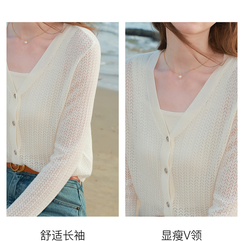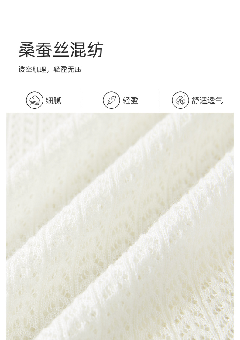 三彩2025秋季新款镂空针织衫V领轻薄毛衫外套短款开衫简约罩衫M