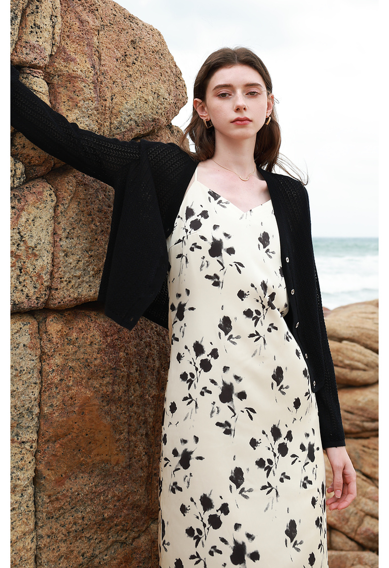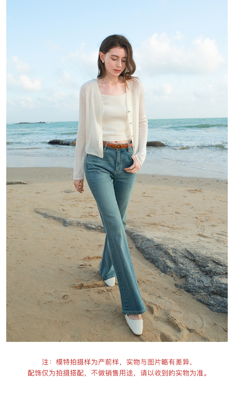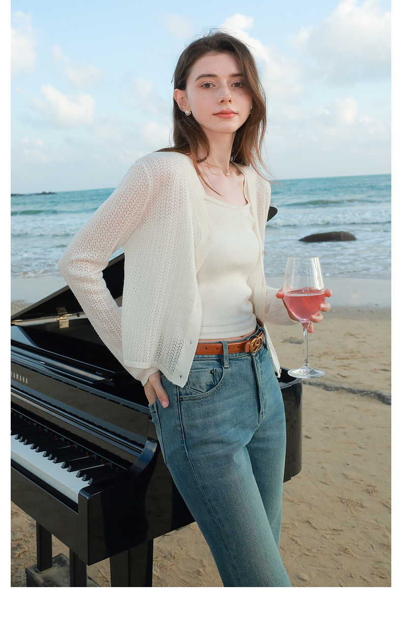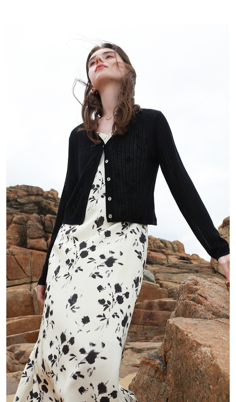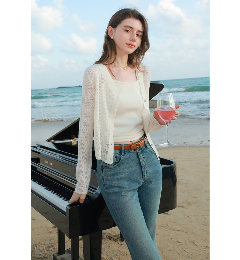 三彩2025秋季新款镂空针织衫V领轻薄毛衫外套短款开衫简约罩衫M